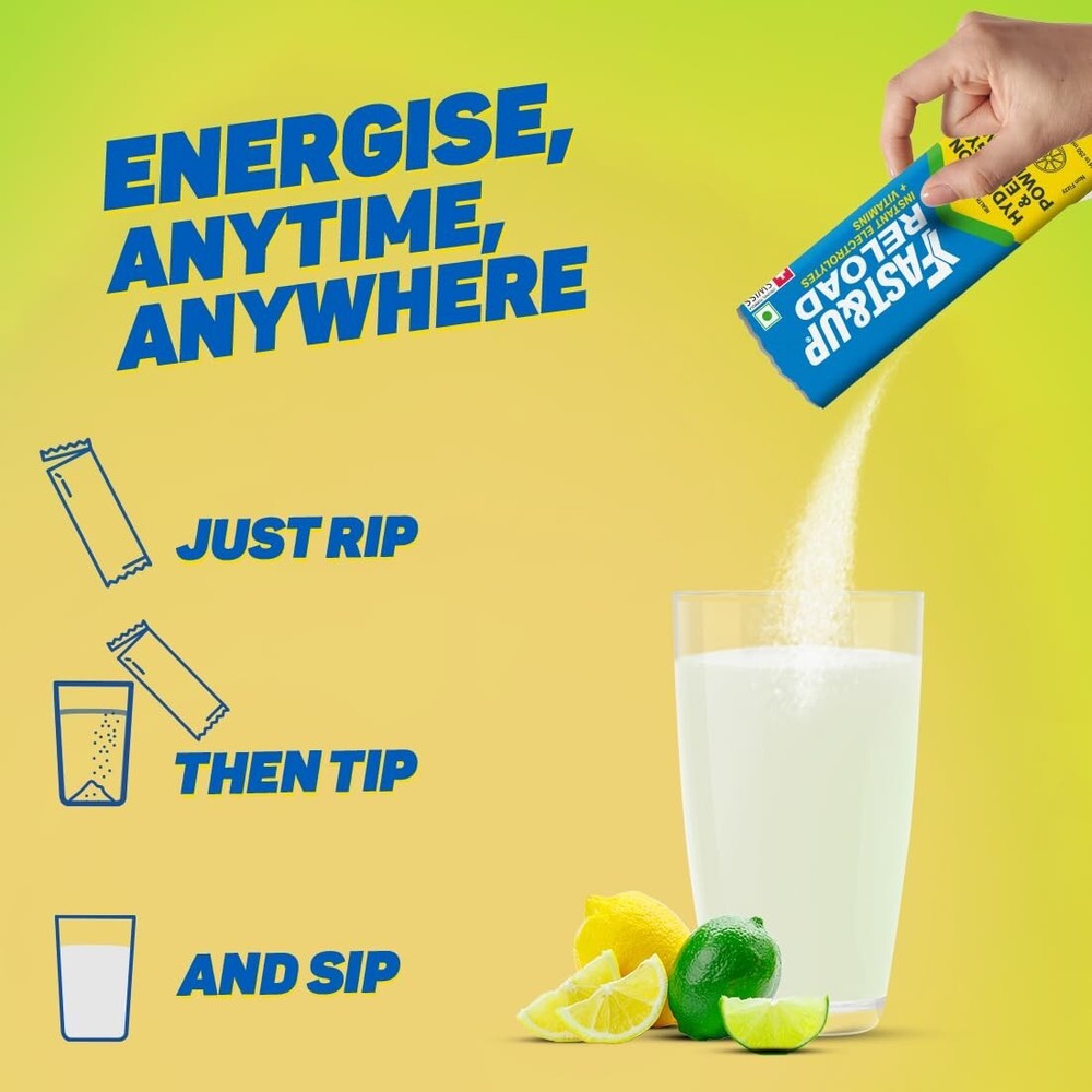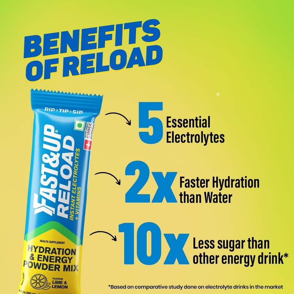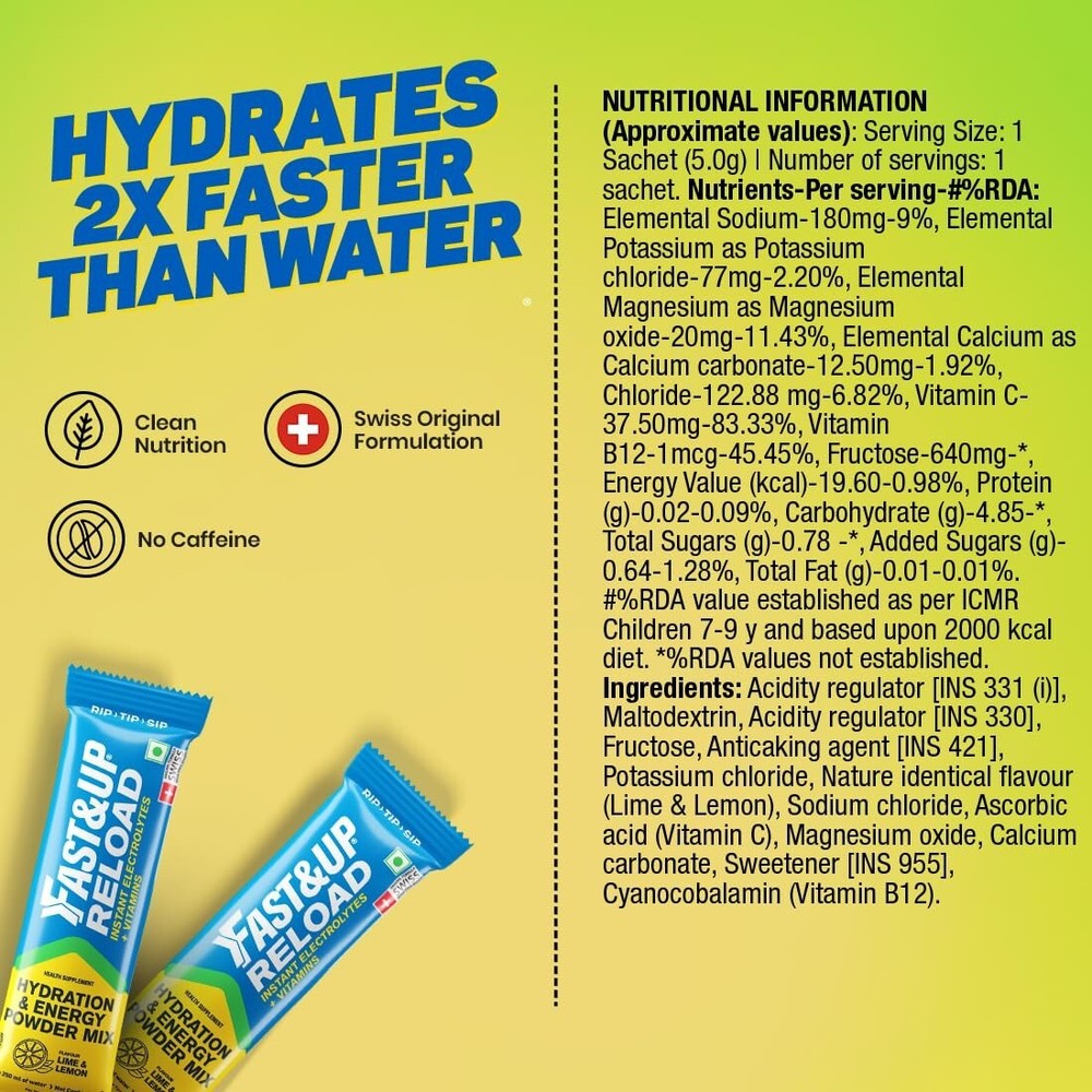 About this item Introducing NEW Fast&Up Reload Energising Electrolyte Powder Drink Mix from House of Fast&Up Reload, a water-soluble powdered form which offers easy and convenient hydration and energy. Hydrates 2x Faster than water alone 5 Essential Electrolytes- Helps Replenish and Restore Electrolytes Lost Through Sweat Vitamin B12 & C - Helps Optimise Recovery Process and Recharge During any Physical Activity Our Premium powder electrolyte drink mix fits easily into your pocket which makes it Travel Friendly Formulated With Swiss Effervescent Technology, it provides Higher Nutrient Bioavailability and is Banned Substance Free and Available in Refreshing Lime and Lemon Flavour