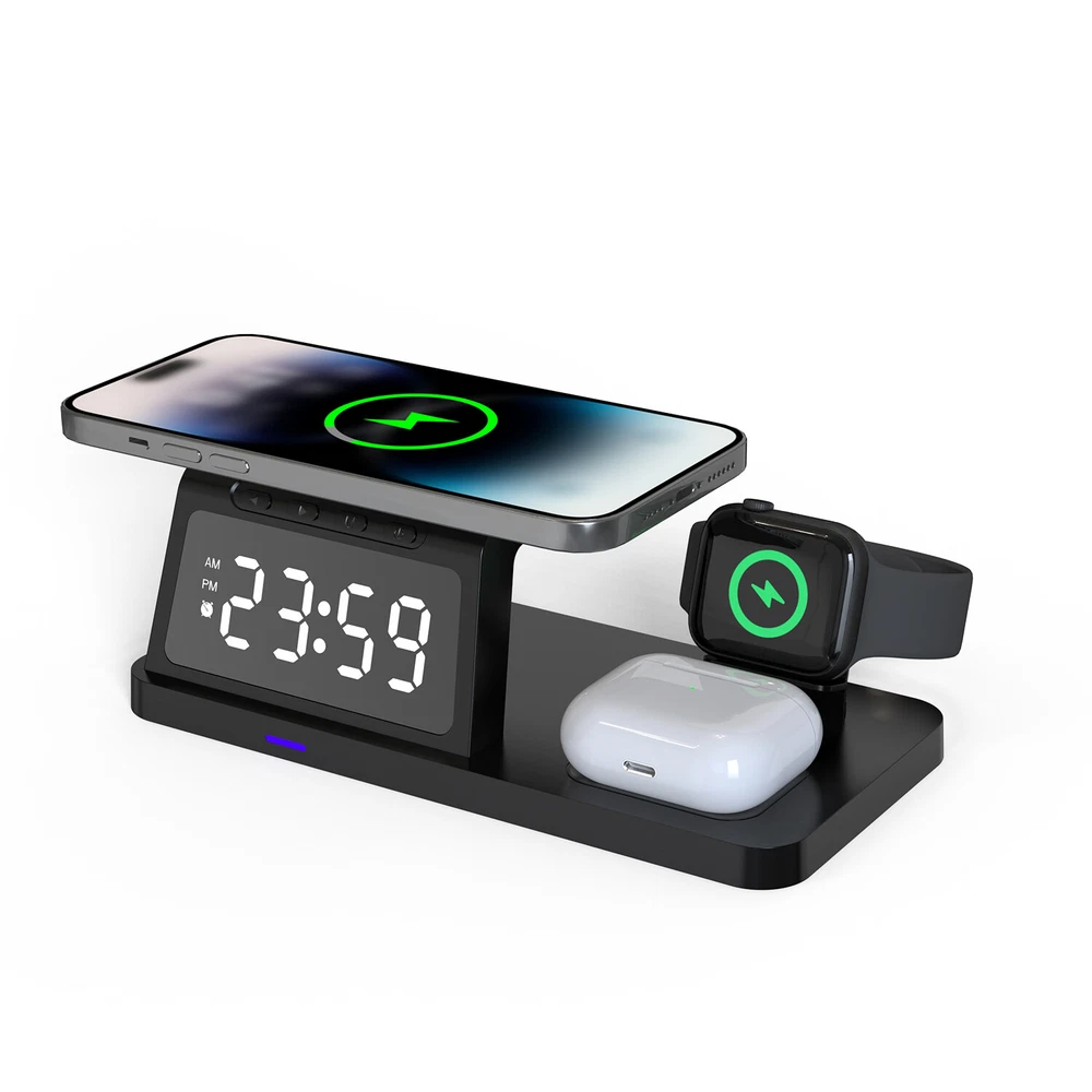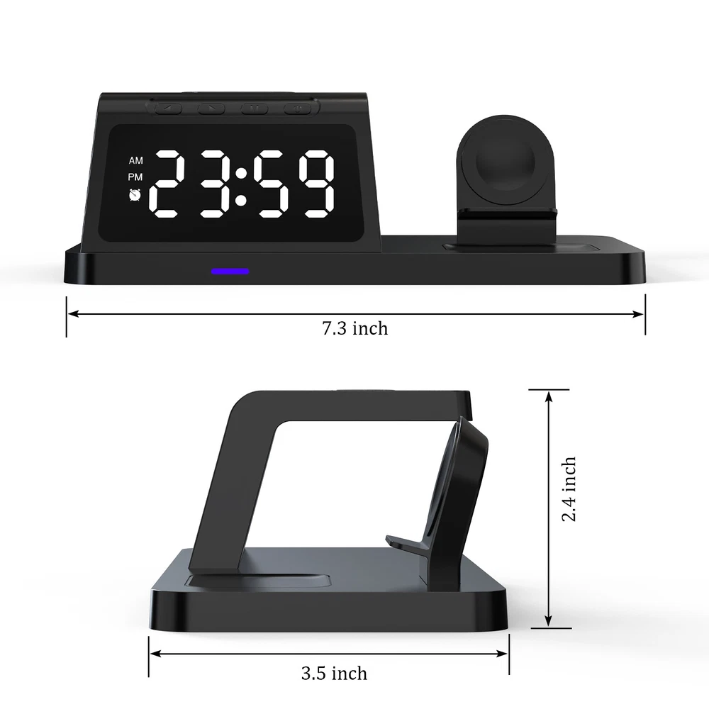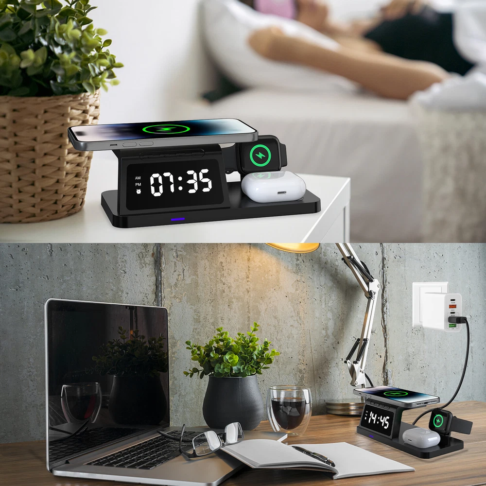 eBay Featu res : ● 4 in 1 Apple Wireless Charging Station: With the iphone wireless charger, you can charge your phone, apple watch and airpods at the same time. ● Fresh Digital Clock Design: No need to buy extra clock. The charger stand can be used as a clock for your bedside/office. iphone and apple watch charging station, 12/24 hour mode [alarm clock function] is provided. ● Display Night Light Adjustable Mode: Taking into account the difference in customer comfort preference, we have designed 5 modes of LED light level cycle. ● Charging Safety: The wireless charger uses advanced automatic control technology with built-in multiple protections for over temperature, short circuit, over charging, electromagnetic, over current, over voltage, etc. to ensure the safety of you and your device. ● Case Friendly: Our wireless charger is suitable for phone case which is within 6mm, But for more efficient charging, we still recommend you to remove the case before charging. (Metal attachments or credit cards will interfere with charging) ● Note: If you want to achieve maximum charging speed, please use cables and adapters compatible with QC (Quick Charge) 3.0 or PD (Power Delivery) Quick Charge. Descri ption : -- Material: ABS material -- Wireless charging standard: Qi -- Input interface: Type-C input -- Input: 5V/2A; 9V/2A; 12V/1.5A -- Mobile phone Output: 15W/ 10W/ 7.5W/ 5W -- Earphone Output: 5W -- Working frequency: 110-205KHz -- Charging efficiency: ≥75% -- Colour: Black / White Qi Wireless Charging Compatible phone Models: For Apple iphone 15 Pro Max/15 Pro/15 Plus/15/14 Pro Max/ 14 Pro/ 14 Plus/ 14/ 13 Pro Max/ 13 Pro/ 13/ 13 mini/ 12 Pro Max / 12 Pro / 12 mini / 12 / 11 Pro Max / 11 Pro / 11 / XS Max / XS / XR / X / 8 Plus / 8 / SE(2nd) For Samsung Galaxy S23 Ultra/ S23+ / S23 / S22 Ultra/ S22+ / S22 / S21 Ultra/ S21+ / S21 / S20 Ultra / S20+ / S20 / S10e / S10+ / S10 / S9+ / S9 / S8+ / S8 / S7 edge / S7/ S6 edge / S6 For Samsung Galaxy Note 20 Ultra / 20 / 10+ / 10 / 9 / 8 / 5 For Google Pixel 4 XL / Pixel 4 / Pixel 3 XL / Pixel 3 For Google Nexus 4/ 5/ 6/ 7 2nd Gen For Huawei Mate RS / Mate 20 Pro / Mate 30 / Mate 40 / Mate 30 Pro / Mate 40 Pro / Mate 40 RS/ P30 Pro / P40 Pro / P40 Pro+ For Xiaomi MIX 2S / MIX 3 / 9 / 9 Pro / 10 / 10 Pro/ 11 For LG G7 ThinQ / V30 / V30 Plus / V30s ThinQ / V35 ThinQ / V40 ThinQ / V50 ThinQ For Other QI Enabled Devices Wireless Charging compatible with : For Apple AirPods Pro / AirPods Pro2 / AirPods 3 / AirPods 2 For Samsung Galaxy Buds 2 / Galaxy Buds Pro / Galaxy Buds / Galaxy Buds+ / Galaxy Buds Live Wireless Charging compatible with : Only compatible with Apple Watch 8/7/6/SE/5/4/3/2 (please do not use a protective case with a thickness of more than 5mm). Package included: 1* Wireless Charger 1* Type-C Charging Cable 1* User Manual Note: Please verify that your phone has QI wireless charging function prior to purchase. If your phone does not have the QI wireless charging function (phones listed above), you will need a QI standard wireless charging receiver which is not provided. Your phone should be placed in the center of the charging pad. Otherwise, your phone will not charge efficiently. If you have a phone case it must be less than 6mm thick in order to charge your phone.
