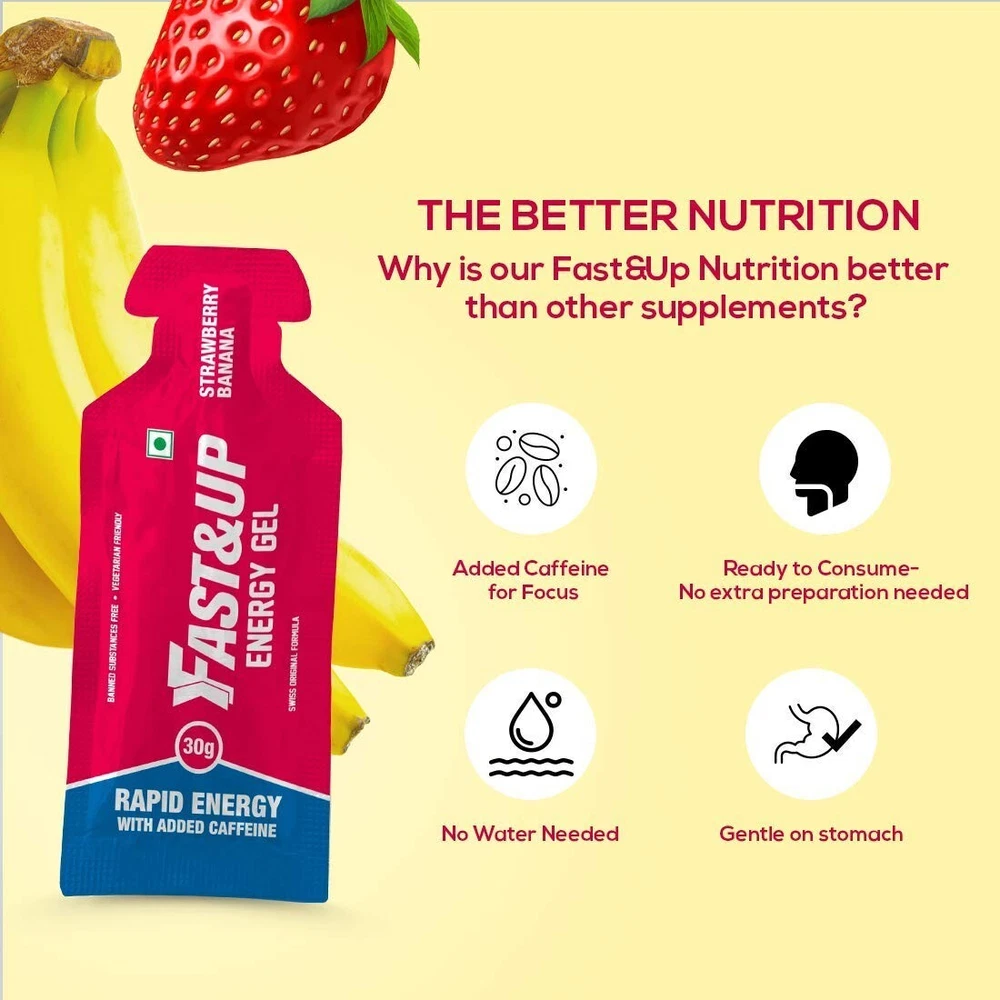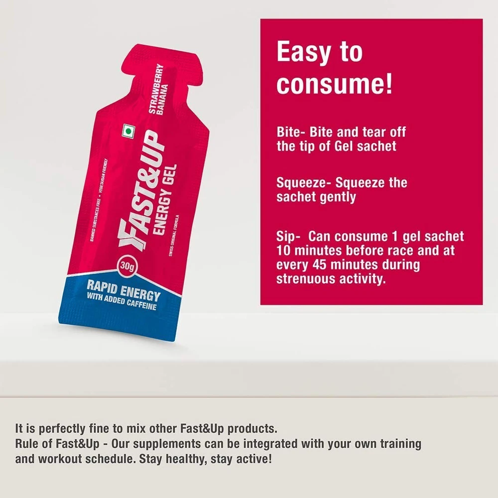 Ingredients: Maltodextrin, Caffeine Directions: Just BITE-SQUEEZE-ACTION for a bullet-busting performance. No water or any kind of preparation is required. Product description Fast&Up Energy Gel is a carbohydrate based energy gel formulated with a blend of 60 percent maltodextrin and 0.1 percent caffeine which is easy to open and sip during your game. Packed with 102 kcal of instant energy in a single serving gel sachet, Energy Gel provides instant energy boost with maltodextrin, a carbohydrate that's more quickly absorbed than other carbohydrates. This strawberry banana flavoured energy gel contains caffeine to keep you alert and improve your focus during your game. Formulated using proprietary technology, Fast&Up Energy Gel is easily absorbed and digested without any stomach upset. There is no need for any extra preparation of water, all you need to do is just bite, squeeze and sip. It is easy-to-carry, highly-effective and provides you with instant energy that digests easier than any other sports energy gel. The result is fast acting and long-lasting energy with peak performance without any gastrointestinal discomfort. This high performance energy gel with tasty flavour is a great choice if you want to enhance your endurance performance and prolong your energy levels. From the brand Previous page Next page From the manufacturer Fast&Up Energy gel provides instant energy for a prolonged workout session. This is due to presence of Maltodextrin and Caffeine- a unique combination formulated by Fast&Up in energy gel form with the help of Liquigel technology. Maltodextrin and caffeine provide instant energy during activities such as marathon runs etc. by enhancing glucose utilization by the body. The energy gel is banned substance free and easily absorbed by the body making energy release quicker. These energy gels can be consumed every 30-45 minutes during workouts by just Bite-Squeeze action as they are available in portable sachets for energy recovery. Fast&Up Energy gel boosts energy for running, cycling, to avoid energy depletion before reaching the finish line. Consuming energy gel prevents bloating as it doesn’t require water. It gives energy within 7-10 minutes of its use. Fast&Up Energy gel helps to bring out the best in your performance without getting exhausted. Available in pack of 5 gel sachets in Strawberry Banana as well as Chocolate flavour Benefits Instant Energy Boost Formulated with Carbohydrate like Maltodextrin and Caffeine, Fast&Up Energy Gel provides Instant Energy to boost performance Caffeine Boost Added Caffeine helps improve focus, alertness and endurance Ready to Consume No need for any mixing or any extra preparation with water, just Bite, Squeeze and Go Easy to Carry Available in easy to carry sachets, Fast&Up Energy Gels can even fit your pocket for instant energy on the go About Fast&Up Fast&Up is an Indian Sports and Active Nutrition brand with Innovative Technology. Nutrition Supplements scientifically crafted with Swiss Formula helps to boost your performance as well as maintain a healthy lifestyle. Available in a variety of flavours and more servings our sports nutrition supplements compact a perfect blend of high-quality Amino Acids and Vitamins that promote faster muscle recovery and overall performance boost. Powered by Innovative Effervescent Technology, Fast&Up nutrition supplements helps to maintain a healthy and Active lifestyle for daily performance enhancement. Fast&Up products are formulated with the sheer motive of fuelling the fitness essentials of the nation such as hydration, Active Nutrition, Performance boost etc.