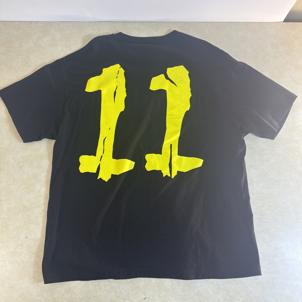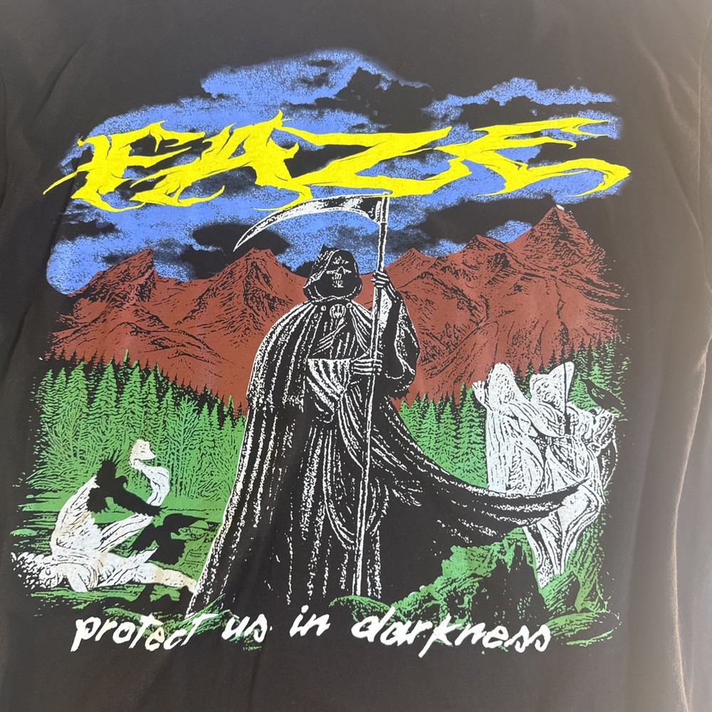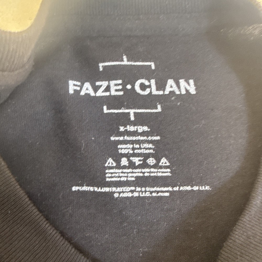 The Faze Clan 11th Anniversary “Protect Us in Darkness” Graphic T Shirt in Adult XL is a black cotton shirt featuring a crew neck and short sleeves. It is machine washable and made of breathable knit fabric, making it suitable for all seasons. The shirt showcases the Faze logo as an accent, with a regular fit and size for men. The graphic print design reflects themes of designer, movie, USA, video games, and sports, making it a stylish and comfortable choice for fans of Faze Clan. SKUC