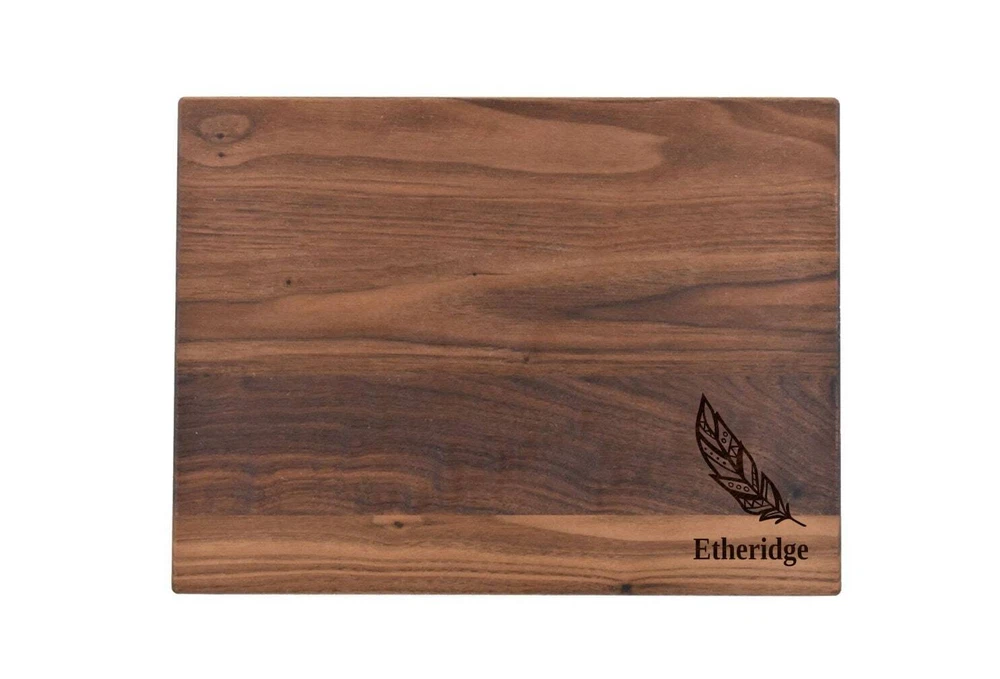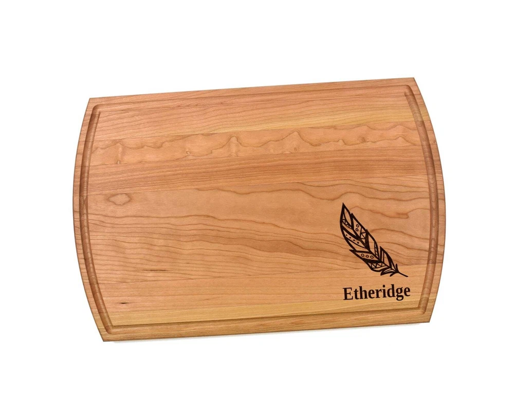 Design: Personalized Feather Cutting Board or Charcuterie Serving Tray All items ship via USPS - please make sure your address is correct :-) Whether used as a charcuterie serving tray for snacks or cutting board, our bamboo, walnut and cherry custom boards are the perfect addition for the home and make the perfect gift for your loved one celebrating a birthday, anniversary, new home, wedding, etc! *** FEATURES *** • SIZES: We have multiple styles and sizes available. To see our current sizes available, click the drop-down menu. The photo slide contains a photo showing each side by side. Please note, the board with the juice groove only has the groove on the front side of the board. • THICKNESS: Bamboo Boards - Approximately 1/2" Thick; Walnut & Cherry Boards - Approximately 3/4” Thick • UNIQUE: Every board is unique with the grain and coloring varying throughout - no board is the same! • CARE INSTRUCTIONS: Hand wash only with warm water. Do not soak. Please apply mineral oil throughout the board’s life. • PERSONALIZATION/CUSTIMIZATION: Do you want the text placed differently on the board? Please don’t hesitate to contact us. All personalization notes can be entered in the personalization box when checking out. • SHIPPING: All cutting boards ship within 2 to 5 business days. • WHOLESALE ORDERS: Please don’t hesitate to contact us for information about wholesale orders. Processing times for larger orders may change. • NOTE: Colors can vary a bit on different monitors and screens. Any props included in photos are not included. Please be sure to double-check your address to make sure it is accurate for USPS delivery. If a package is returned to us due to an invalid address, the buyer is responsible for all additional shipping charges. We appreciate you supporting small business – best wishes! For items ordered with simple edits, we do not send proofs since the layout doesn't change from the example(s). However, in the event there are requests that change the layout from the example(s), we do send proofs for approval before making the product. If you'd like a proof before we make the product, please note so in the personalization box.