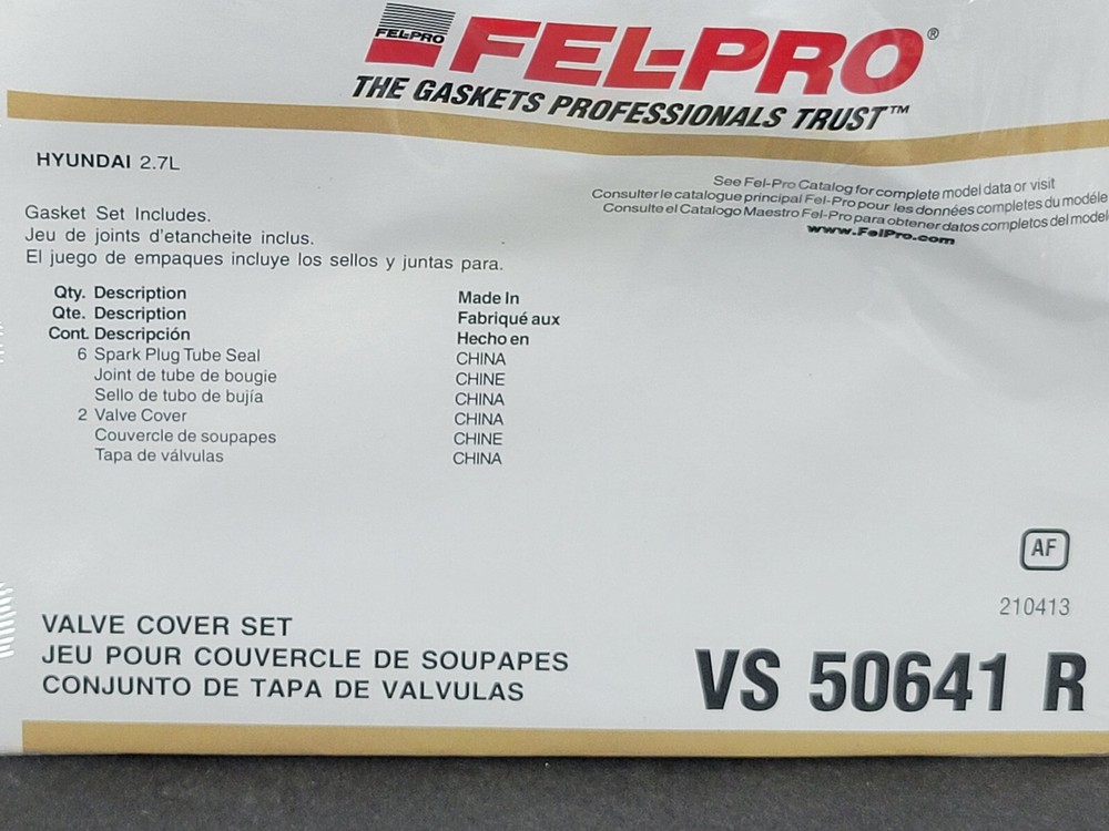 New in original packaging. Fel-Pro Valve cover set. Part # VS 50641 R Fits what vehicles: 2004-2006 Hyundai Santa Fe, 2004-2005 Hyundai Sonata, 2004-2008 Hyundai Tiburon, 2004-2006 Kia Magentis, 2004-2006 Kia Optima, 2005-2009 Hyundai Tucson, 2005-2010 Kia Sportage Interchange part numbers: Corteco: 190063 Rol: VS10435 Set includes 6 spark plug tube seal 2 valve cover Item will ship within one business day of completed sale. I DO NOT ship media mail. All items will be securely packaged and will ship USPS Ground Advantage, Priority mail, UPS or Fedex depending on weight and size. I do offer a 30-day money back guarantee on almost every item I sell. If there are issues with your item, please return it for a refund. Refund will be issued upon return of item. Some restrictions may apply. It is always appreciated if you contact me before starting a return so that I can try and assist without the hassle of a return.