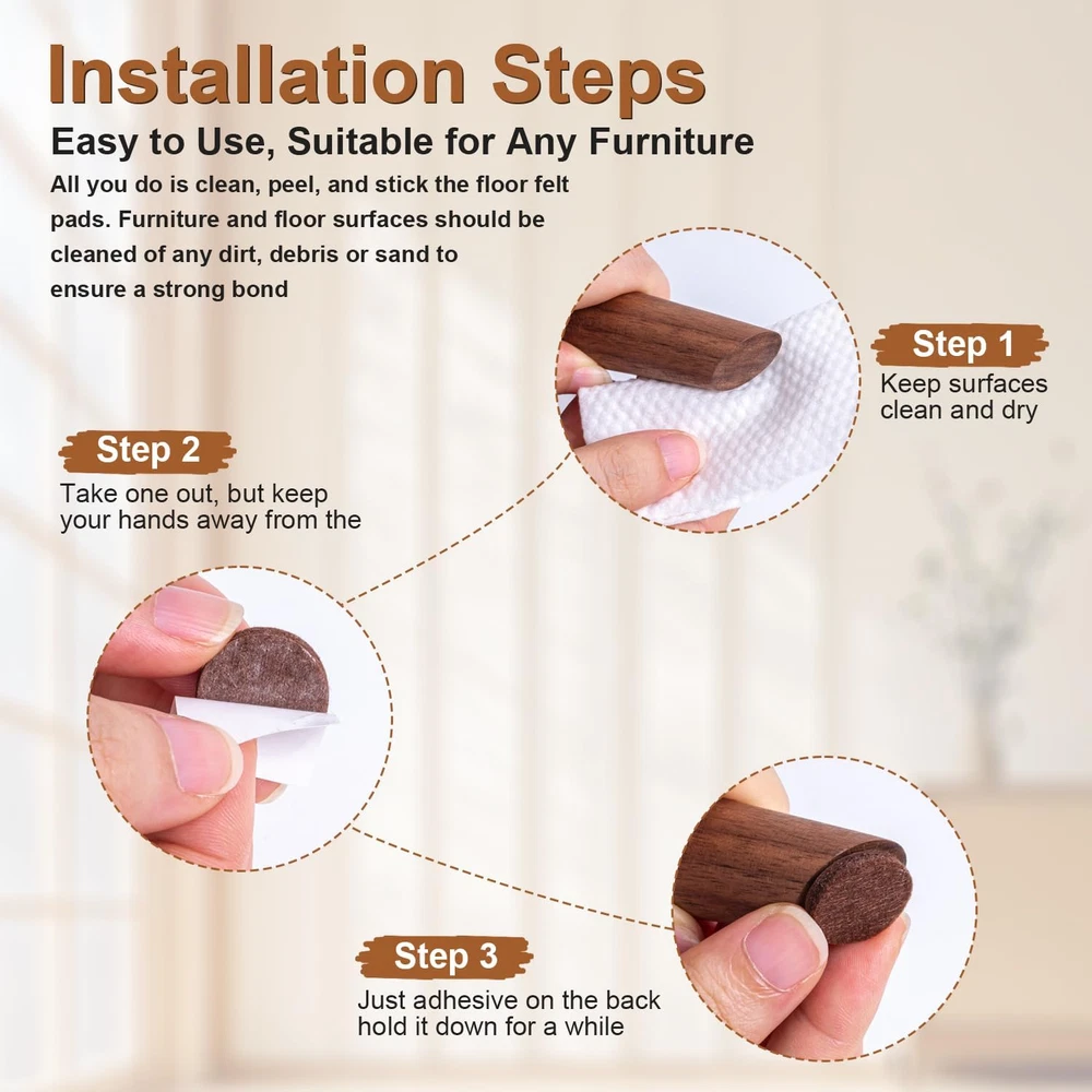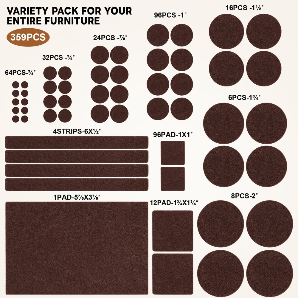 Store New Arrivals Add to Favorite View Feedback Contact Fast deliveries to the customer's home Quality customer service John Make the customers happy! Felt Furniture Pads for Hardwood Floors 359 Pieces, anti -Scratches Floor Protector for Round, Square Chair Feet Self Adhesive Pads Sliders Moving Your Furniture Smoothly (359Pcs Brown) Description Outstanding floor protection & noise reduction: High-density felt gaskets effectively prevent direct contact between furniture legs and the floor, avoiding scratches, indentations and wear, especially protecting precious wooden floors, tiles and laminate floors. At the same time, it significantly absorbs the noise during movement and placement, eliminates the shrill friction sound, and creates a quiet home environment. One-second installation & Immediate use: Equipped with a strong adhesive backing, installation is extremely simple and fast. Clean any dirt, shredded paper and sand on the surface of the furniture. Tear off the release paper and precisely stick it to the bottom of the clean and dry furniture legs. Press for a few seconds and it will be firmly bonded. No tools required, time and effort saved, and enjoy the protective effect immediately. Durable and environmentally friendly & worry-free use: Made of high-quality felt material of 5 materials, it is wear-resistant and pressure-resistant, not easy to deform or crack, providing long-term protection. The back adhesive has strong adhesion and leaves no marks when removed (suitable for most surfaces), and it is easy to replace. Environmentally friendly materials, safe and odorless, making home use more reassuring. Multi-purpose cushion & Full-house protection: Compatible with various furniture such as tables, chairs, bar stools, sofas, bed frames, cabinets, coffee tables, bookshelves, legs and legs, and all kinds of electrical appliances, easily handling scenarios such as living rooms, dining rooms, bedrooms, studies, and offices. Available in various sizes, including round and square, it is widely compatible with all kinds of home styles. One pad solves the problems of scratches and noise when moving all the furniture in the house! 359PCS, Meet Your All Need: With 11 most popular sizes and shapes furniture pads. 64PCS3/8" , 32PCS 3/4" ,24PCS 7/8" , 96PCS 1" , 16PCS 1-1/2" , 6PCS 1-3/4" , 8PCS 2" ,96PCS1"x1" , 12PCS 1-3/4"x1-3/4" ,4PCS 6"x1/2",1PCS 5-7/8"x3-7/8". These should be more than enough leg pads to protect all your floors from being damaged by ugly scratches. Product Description Item model number 001 Unit Count 359.0 Count Number of Items 1 Color Brown Product Dimensions 7.1"L x 4.7"W x 3.6"Th Material felt Country of Origin China Item Weight 8.5 ounces Shape Square Recommended Uses For Product Chair Surface Recommendation Hardwood Size 359PCS-Brown ABOUT US We offer the best prices around on high quality products. Our E-store includes media such as books, movies, music and games while offering electronics, toys, sporting apparel, clothing, tools, general home, garden items and more. SHIPPING We are always working hard to ensure your package arrives as soon as possible. Please understand that some factors like weather, high postal traffic, and the performance of shipping companies are outside of our control. We offer free shipping to the lower 48 states and ship within 2 business days of payment, usually sooner. We do not accept P.O. Boxes. Please provide a physical address. For shipping outside of the continental USA, we only use eBay's Global Shipping Program. The item is shipped to KY and then sent to the rest of the world. International customers are responsible for all duties and taxes. Continue to 'check out' to calculate costs for shipping the item to your country. Messages regarding eBay's Global Shipping Program MUST be directed at eBay EXCLUSIVELY. RETURNS We offer a 30-Day Return Policy on items in which you are not completely satisfied with. You have the option of a full-refund or an exchange of the item. No returns are available on items shipped outside of the USA PAYMENT We accept PayPal. CONTACT US This page content is yet to come Please ad us to your favorite seller and visit again later Thank You CUSTOMER SATISFACTION We try our very best to make sure every customer is completely satisfied. If there's a problem, message us! We're happy to help. WE ACCEPT