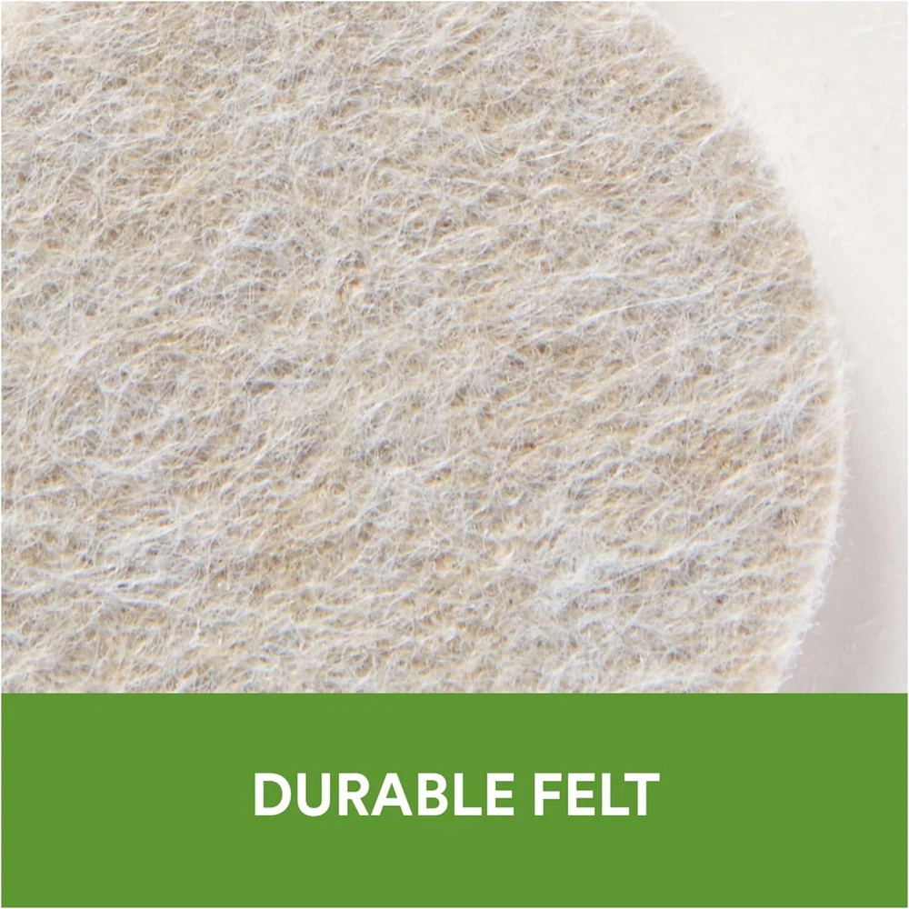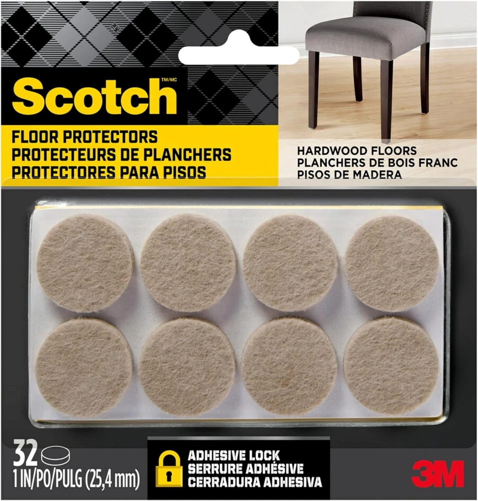 Ideal for use on furniture, lamps and décor that sit on finished surfaces Easy-to-apply, self-stick design Felt allows you to move furniture easily Reliable protection from nicks, dents and scratches Great for protecting hardwood floors Color: Beige Size: 1 in. x 1 in Package Contents: 32/Pack Preserve the beauty of your floors with Scotch Felt Pads. Equipped with powerful adhesive and durable felt, these floor protectors adhere effortlessly to the legs of your furniture and provide long lasting protection from gouges and scratches. They come in multiple sizes and colors, so there's a set that blends perfectly with all of your décor. So help protect your investment, and enjoy your beautiful floors for years to come with Scotch Felt Pads.