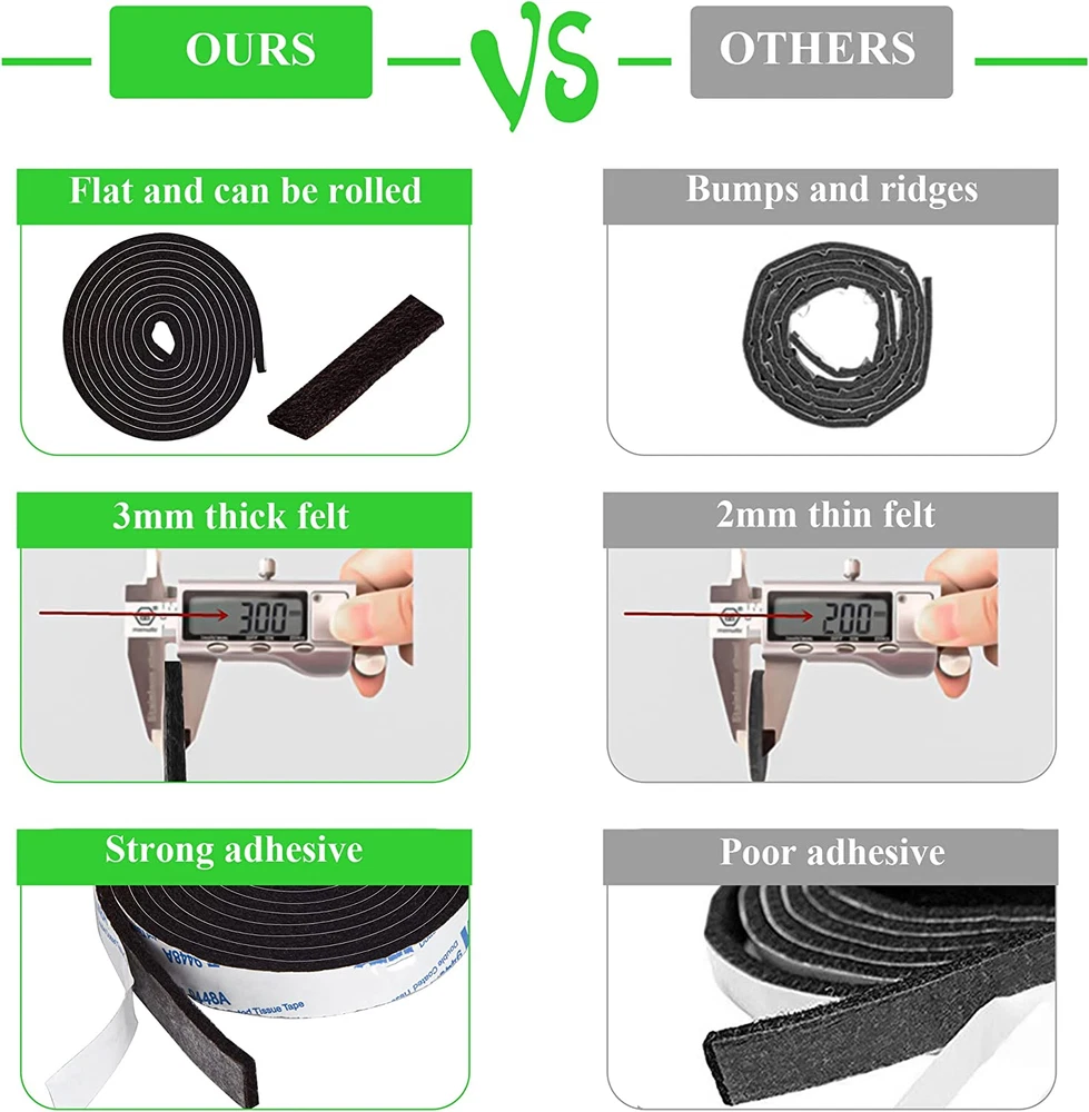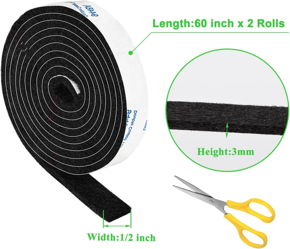 Felt Strips With Adhesive Backing Felt Tape With Adhesive Backing Felt Furniture ✅ 【SCRATCHING OR NOISE FREE】 These LUXURIOUS FELT STRIPS are designed not only to minimize scratching but also to minimize the grating noise that comes with even the slightest movements of your favorite furniture. ✅ 【VALUE PACK IN A PACKAGE】 A pack of 2 rolls 1/2" x 60" black felt strips in a resealable package. These felt furniture strips are great for anything around your home, from rocking chair runners to roomba to vases trinkets. ✅ 【EXTREMELY ADHESIVE】 Heavy duty 3mm thick and soft felt strips with an extremely sticky backing. We use only the best materials for our felt strips so rest assured that our felt strips will serve you in the long run. They are made of sturdy felt and strong adhesive that will stick and make sure it stays on the legs after moving the furniture. ✅ 【SIMPLE TO USE】 Simply clean, peel and stick. Surfaces should be free of dirt, debris and sand to ensure a strong bond. It can be cut into any shape to meet your furniture, no matter round, square or other special shape. You can store the extra felt strips with our resealable bag, next time you use it also like a new product! Product Description Looking for the BEST Felt Furniture Strips? You value your furniture and your floors. You need a fix to keep your floors safe, but you don't want any old fix! What about a Premifix? Package includes: 2 Rolls- 1/2 x 60 inch felt strips for chair runners, robot vacuum, cabinet and table . EASY TO PUT Simply clean, peel and stick. Surfaces should be free of dirt, debris and sand to ensure a strong bond. HIGH QUALITY Don't settle for a weak solution. Get a premium fix, because your home is worth it. FOR DIFFERENT FLOORS Can be used for different floors, like wood floor or ceramic tile. STRONG ADHESIVE Heavy duty 3mm thick felt furniture strips with an extremely sticky backing . 100% Felt Furniture Strips Our felt furniture strips are cutting-edge, and we refuse to sacrifice quality and customer happiness. We create and produce only the very best in surface protection. We aim to manufacture and provide premium quality felt furniture strips, we have mastered the art of protecting what's important in your home. Item model number FELT FURNITURE PADS-017C Unit Count 2.0 Count Number of Pieces 2 Number of Items 2 Color Black Country of Origin China Product Dimensions 60"L x 0.5"W x 0.12"Th Material Black Material Type Black Grip Material Rubber Item Weight 1.23 ounces Shape Felt strips Recommended Uses For Product Noise Surface Recommendation Hardwood Special Feature Sturdy Size 2 Rolls 1/2x60 inch Shipping Fast shipping is very important for us. Our standard US shipping service is FREE. Your order will be shipped within 2-3 business days upon full payment received. Your order will be delivered within 2-3 business days after the handling time. We only ship to the confirmed PayPal address. We reserve the right to cancel any order for any reason at any time. We are not responsible for undeliverable addresses. Returns and payment We offer a 30 days return policy from checkout winning date. We allow only PayPal as payment method FeedBack Your feedback very important to us, after you get your package and you are satisfied with our service please leave us positive feedback If you have any problem with your order / any questions please before leave any type of feedback For any questions, using eBay contact system Please visit our eBay store to check out other items for sale! Thank you for shopping at our store.
