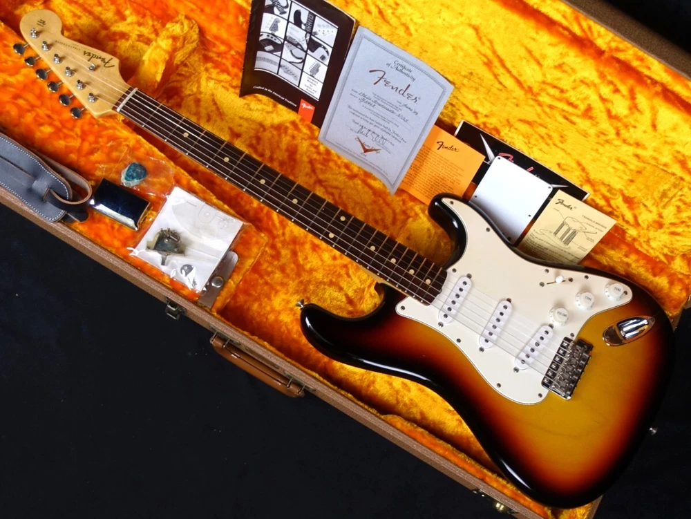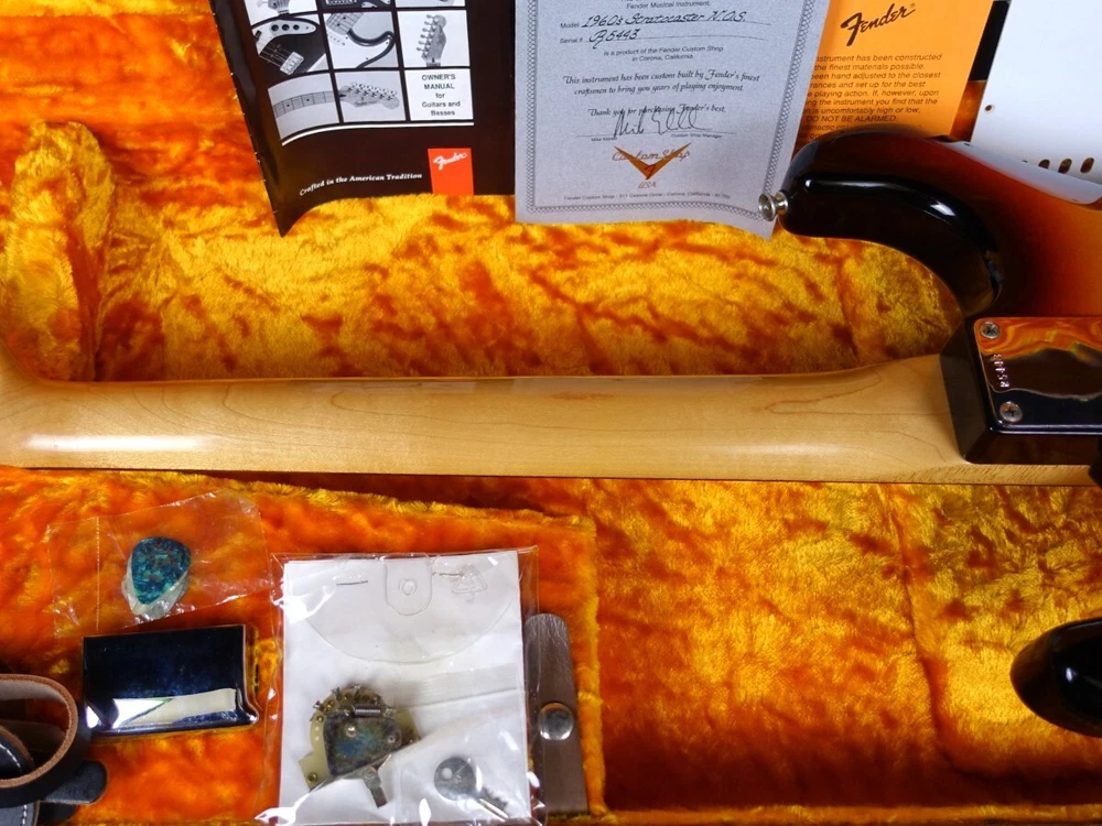 Description Among the many Custom Shop Stratocasters, the "1960" spec Stratocaster is one of the most popular models. This particular 3-Color Sunburst NOS finish '60 Stratocaster was made in 1999, as confirmed by the neck date and certificate of authenticity. This model, which features the sought-after fat sound of the era, comes with an alder body, maple neck, and a slab rosewood fingerboard—classic wood materials for the period. The neck grip is a moderate 60s-style C-shape with a 7.25-inch radius, vintage-style frets, and an 11-point screw pickguard, faithfully reproducing the specifications of a 1960 Strat. The electronics feature a 5-way switch (replacement), master volume, front tone, and center tone controls—another classic, straightforward setup. In terms of condition, there are noticeable signs of use, including dents, scratches, and some dulling of the finish and parts. The headstock also shows marks from clip-on tuners. However, there are no major visible damages that would significantly affect its aesthetics or playability, so the overall condition is decent. Parts replaced include the nut (cow bone), rubber for pickup height adjustment, and the switch was upgraded from the original 3-way to a more practical 5-way (the original 3-way switch is included). The frets are vintage-style and show some wear, but there is still about 60-70% fret height remaining, and there is no noticeable buzzing or dead spots during play. *Note: The back panel screws and tremolo arm are missing. Weight: Approximately 3.61 kg. About Us If you have any problem, please contact us. Your satisfaction is important to us. We have results that I sold of tens of thousands of by Internet sale. We have pride ourselves in the Quality of items we offer. All our items has been checked by technician. As every seller dealing with pre-owned branded items in Japan we have as well license from local government to offer services of this kind. We are officially registered as legal business and we have to comply with all rules and regulations including tax requirements from the Japanese government. International Buyers - Please Note: Import duties, taxes and charges are not included in the item price or shipping charges. These charges are the buyer's responsibility. Please check with your country's customs office to determine what these additional costs will be prior to bidding/buying. These charges are normally collected by the delivering freight (shipping) company or when you pick the item up - do not confuse them for additional shipping charges. We do not mark merchandise values below value or mark items as “gifts” - US and International government regulations prohibit such behavior.