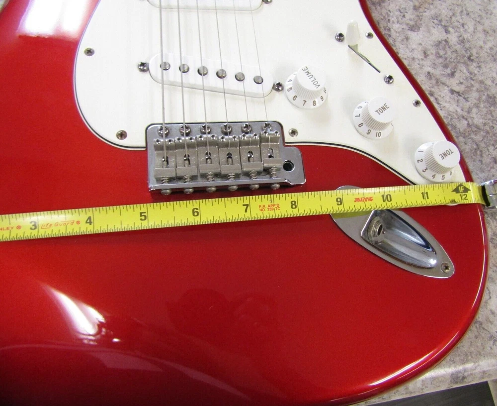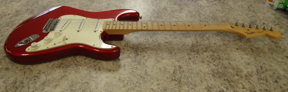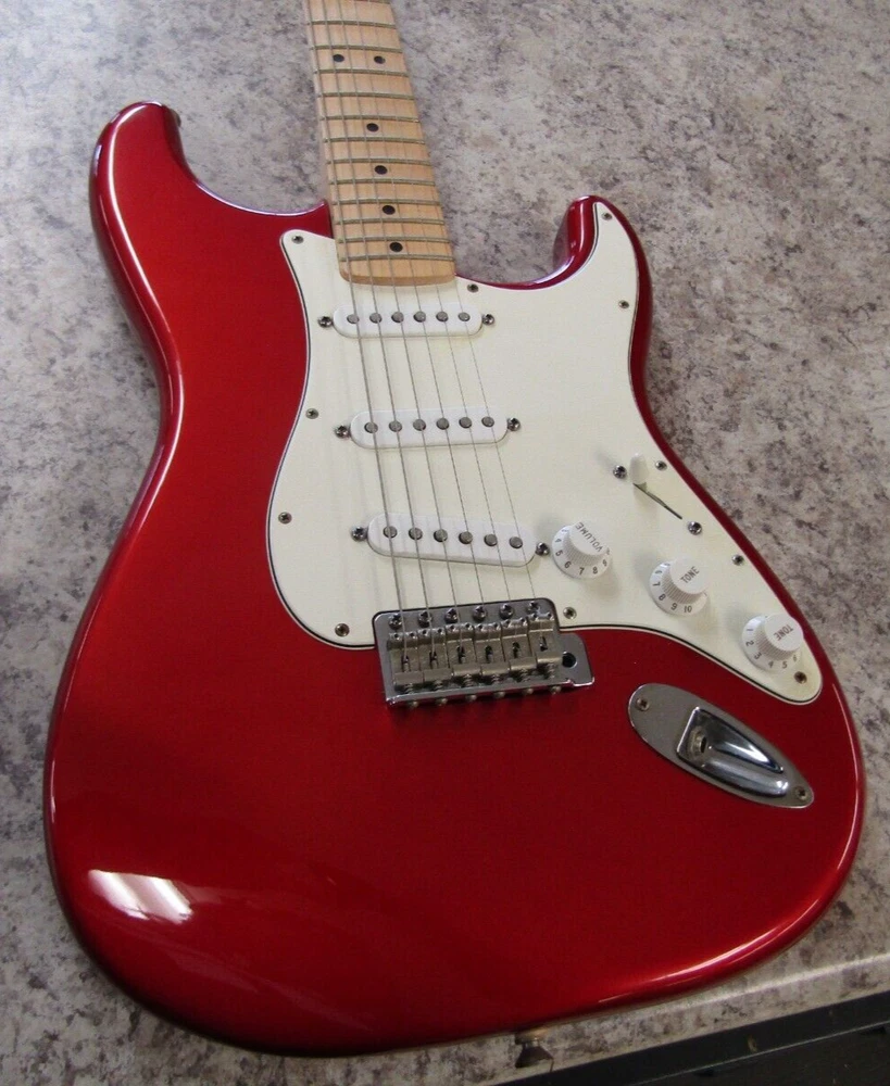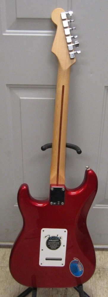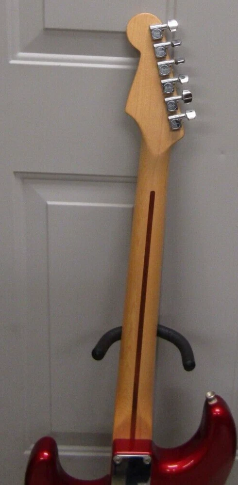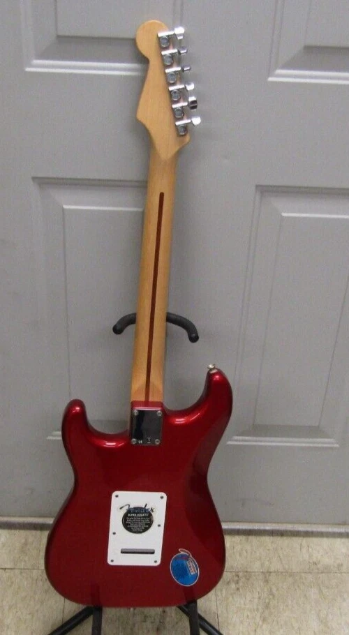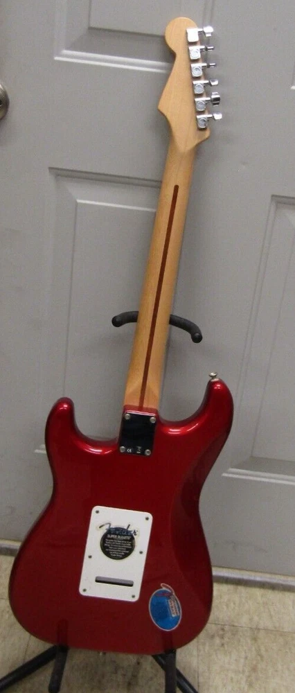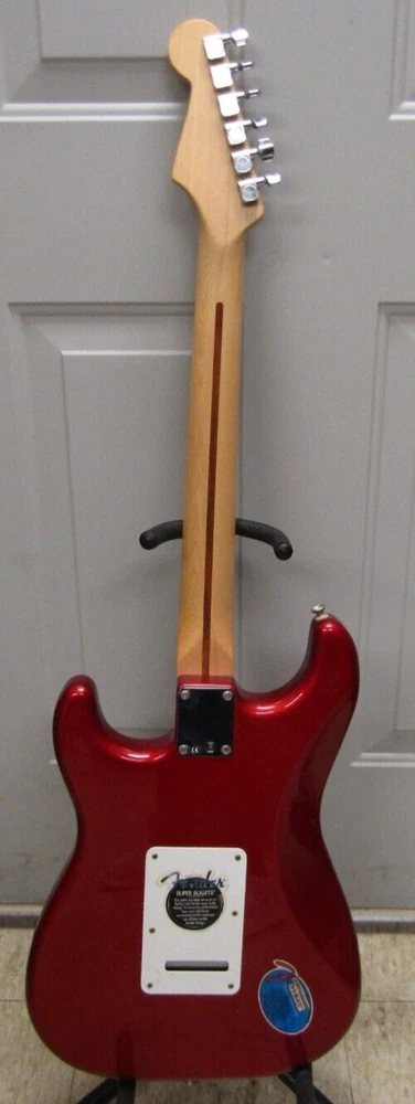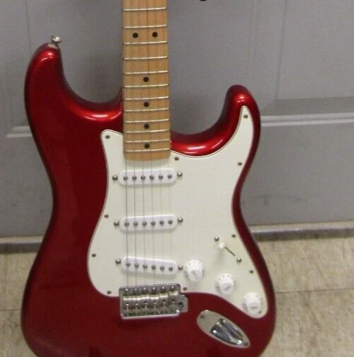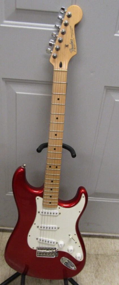 in good condition as pictured - stand not included -- neck is Not damaged it is a reflection Product Specs Body Alder Body Finish Polyester Body Shape Stratocaster® Bridge 6-Saddle Vintage-Style Synchronized Tremolo Bridge Pickup Standard Single-Coil Strat® Color Chrome Red Commodity Code 9207901000 Configuration SSS Control Knobs White Plastic Controls Master Volume, Tone 1. (Neck Pickup), Tone 2. (Middle Pickup) Country Of Origin MX Dimensions 5.00x15.00x42.00 IN Fingerboard Maple Fingerboard Radius 9.5" (241 mm) Fret Size Vintage Hardware Finish Chrome Middle Pickup Standard Single-Coil Strat® Model Name Standard Stratocaster® (Upgrade) (2006-2008), Maple Fingerboard, Chrome Red Neck Finish Satin Urethane Neck Material Maple Neck Pickup Standard Single-Coil Strat® Neck Shape Modern "C" Number of Frets 21 Nut Material Synthetic Bone Nut Width 1.650" (42 mm) Orientation Right-Hand Pickguard 3-Ply White Pickup Configuration SSS Pickup Switching 5-Position Blade: Position 1. Bridge Pickup, Position 2. Bridge and Middle Pickup, Position 3. Middle Pickup, Position 4. Middle and Neck Pickup, Position 5. Neck Pickup Position Inlays Black Dot Refinement Neck Material Maple Scale Length 25.5" (64.77 cm) Series Standard String Nut Synthetic Bone Strings Nickel Plated Steel (.009-.042 Gauges) Tuning Machines Fender®/Ping® Standard Cast/Sealed Tuning Machines