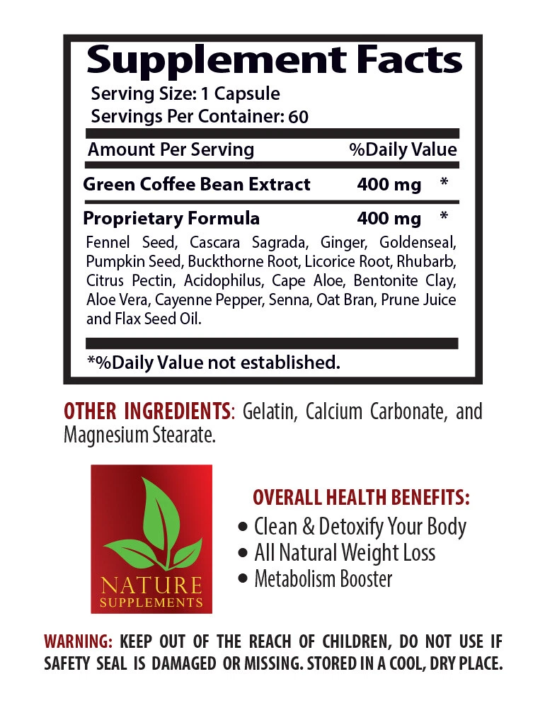 GREEN COFFEE BEAN EXTRACT CLEANSE WEIGHT LOSS SUPPLEMENTS 1 Bottle - 60 Capsules Weight loss supplement Z ERO fillers, ZERO binders, ZERO artificial. Product Benefits: Potential Weight Loss May Reduce High Blood Pressure May Improve Mood and Cognitive Performance Powerful Antioxidant The history of Green Coffee: The history of coffee dates back more than a thousand years, originally, Coffee beans were used as food. East African tribes would grind the coffee berries together, mixing the results into a paste with animal fat. Later, around 1000 AD, Ethiopians made a type of wine from coffee berries, fermenting the dried in water. Coffee also grew naturally on the Arabian Peninsula where it was first developed into a hot drink. Despite decades of research on coffee and caffeine, there are many misconceptions about the potential health risks associated with coffee, while many of the beneficial aspects have gone unnoticed. Coffee trees are grown in many different countries located primarily around the equator. The coffee plant produces coffee berries containing seeds, which are commonly called coffee beans because they have an appearance similar to beans. Here are the Coolest Benefits of GREEN COFFEE BEAN EXTRACT CLEANSE: Potential Weight Loss Losing weight can be incredibly difficult. For this reason, people have turned to all sorts of supplements in order to make things easier. Green Coffee Bean Extract is one of them…. It is currently among the world’s most popular. Green coffee beans are coffee beans that have not yet been roasted. The green coffee beans contain high level of antioxidants, which are believed to help to melt the fat away. These coffee beans contain a higher amount of the chemical chlorogenic acid. For weight loss, chlorogenic acid in green coffee is thought to affect how the body handles blood sugar and metabolism. A study in India found that people taking pills with green coffee bean extract lost an average of 18 pounds — 10 percent of their body weight — over 22 weeks. The study, published in Diabetes, Metabolic Syndrome and Obesity, tested two doses of extract — 700 and 1,050 milligrams per day. Other studies have shown that chlorogenic acid can reduce body weight, reduce fat absorbed from the diet, reduce fat stored in the liver and improve the function of the fat burning. May Reduce of High Blood Pressure Research studies have shown that chlorogenic acids help in regulating your blood pressure. They specifically reduce blood pressure. A study performed in 2006 has shown that the consumption of 140 milligrams of green coffee bean extract per day significantly reduced the blood pressure in patients with mild hypertension. The study showed no other side effects. This means that it should be safe to use GCE supplements to may normalize your high blood pressure. May Improve Mood and Cognitive Performance Numerous studies have proven that caffeine improves your mood and brain activity. The consumption of caffeine can help with many cognitive functions like memory, focus, and resistance to fatigue, improved reaction time, higher levels of alertness and vigilance. These are just a few of the cognitive functions and performance categories that have been researched. Nearly all other studies prove that positive impact of caffeine on cognitive functions and overall mood. Powerful Antioxidant Chlorogenic acids (CGA) are the antioxidants found in green coffee bean extract which are responsible for its weight control properties and other health benefits. Ginger Ginger is a common ingredient in Asian and Indian cuisine. However, ginger has been used for its medicinal properties for centuries among many cultures. The root or underground stem (rhizome) of the ginger plant can be consumed fresh, powdered, dried as a spice, in oil form or as juice. Ginger is part of the Zingiberaceae family, along side cardamom and turmeric, and is commonly produced in India, Jamaica, Fiji, Indonesia and Australia. A study involving 74 volunteers carried out at the University of Georgia found that daily ginger supplementation reduced exercise-induced muscle pain by 25%. Fennel seeds Fennel seeds contain numerous flavonoid anti-oxidants like kaempferol and quercetin. These compounds function as powerful anti-oxidants. Like in caraway, fennel seeds too are rich source of dietary fiber. 100 g seeds provide 39.8 g of fiber. Much of this roughage is metabolically inert insoluble fiber, which helps increase bulk of the food by absorbing water throughout the digestive system and easing constipation problems. Supplement Facts Serving Size: Servings Per Container: 1 Capsule 60 Green Co ffee Bean Extract 400 mg Proprietary Formula 400 mg Fennel Seed, Cascara Sagrada, Ginger, Goldenseal, Pumpkin Seed, Buckthorne Root, Licorice Root, Rhubarb, Citrus Pectin, Acidophilus, Cape Aloe, Bentonite Clay, Aloe Vera, Cayenne Pepper, Senna, Oat Bran, Prune Juice and Flax Seed Oil. Other Ingredients: Gelatin, Calcium Carbonate, and Magnesium Stearate. SUGGESTED USE: As a dietary supplement, take one (1) capsule twice daily 30 minutes before meals with an 8 oz. glass of water. *These statements have not been evaluated by the Food and Drug Administration. CAUTION: Do not exceed recommended dose. Pregnant or nursing mothers, children under the age of 18, and individuals with a known medical condition should consult a physician before using this or any dietary supplement. Feedback From Buyer Date/time item is as described and was delivered on time s******7 ( 910 ) 2016-11-16 21:43:47 Excelente, muy confiable, lo recomiendo mucho! s*******e ( 108 ) 2016-11-16 20:49:03 Fast shipping, amazing products, and great seller. Thanks I'll be reordering. z******1 ( 84 ) 2016-11-16 19:20:19 Good Job A+ e********l ( 26 ) 2016-11-16 18:34:22 Perfeito a**********7 ( 479 ) 2016-11-16 15:54:01 Perfeito a**********7 ( 479 ) 2016-11-16 15:53:37 Perfeito a**********7 ( 479 ) 2016-11-16 15:53:14 Great k*********1 ( 141 ) 2016-11-16 13:31:08 ex