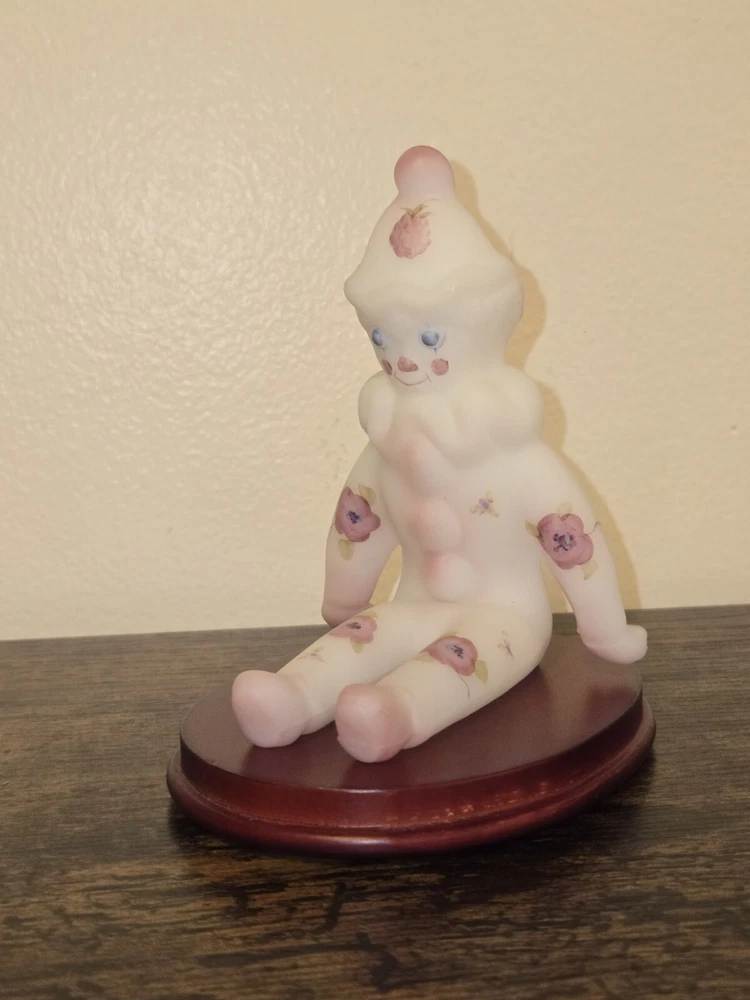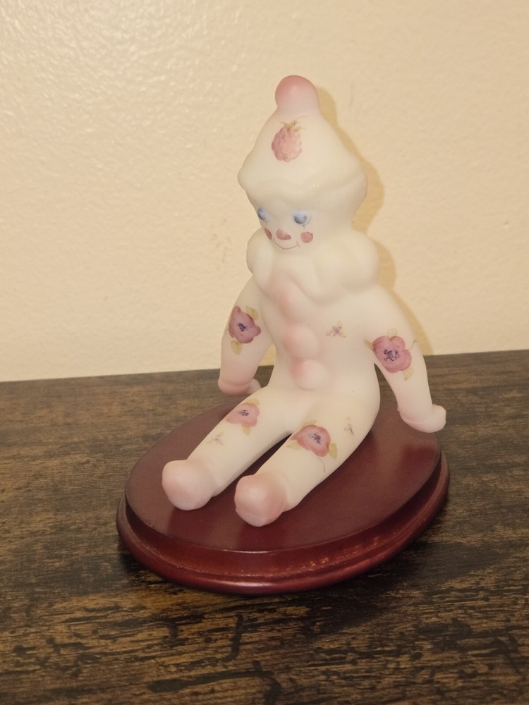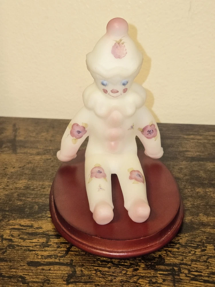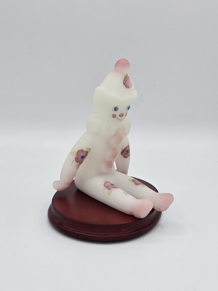 This adorable Fenton clown figurine is a must-have for collectors! The hand-painted berries and blossoms design pops against the milky satin glass, and the intricate details are stunning. It sits perfectly on its stand, adding a playful yet elegant touch to any display. The craftsmanship is top-notch—pure Fenton quality!