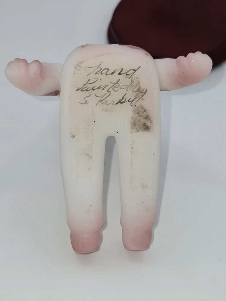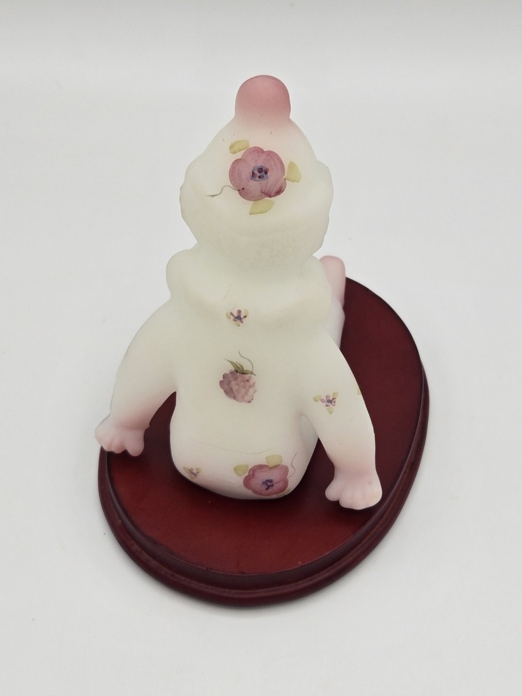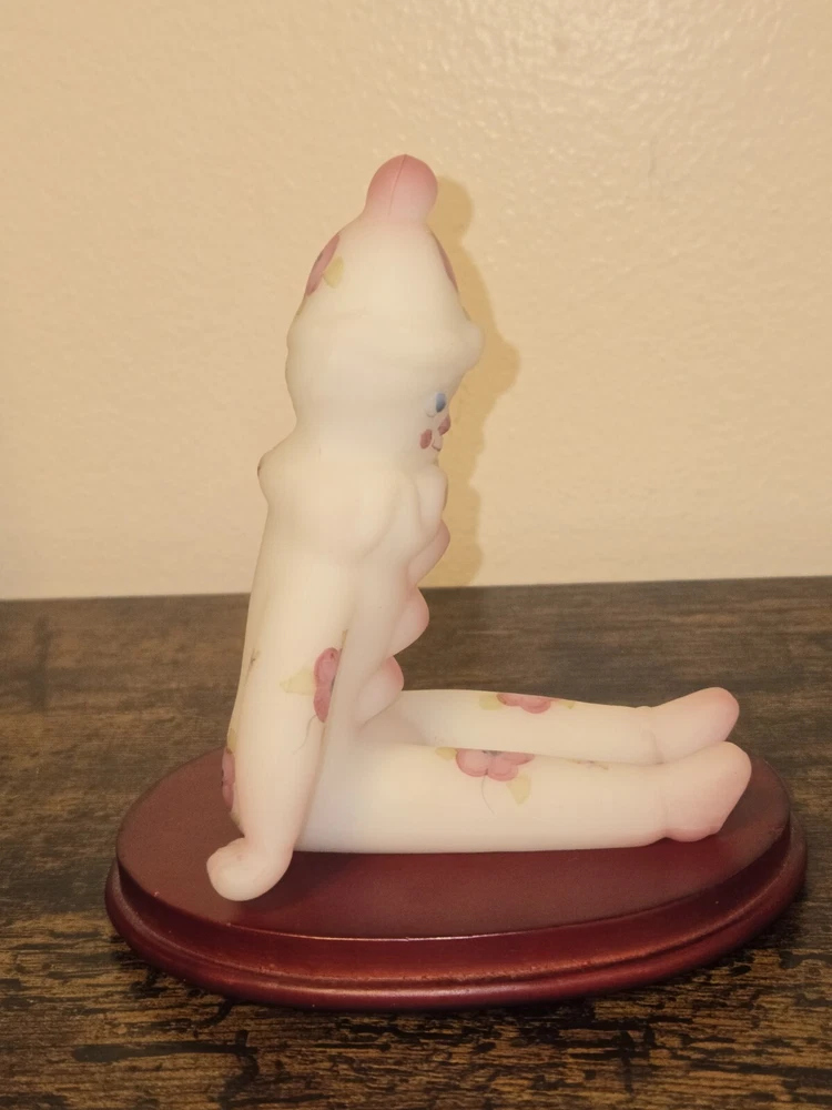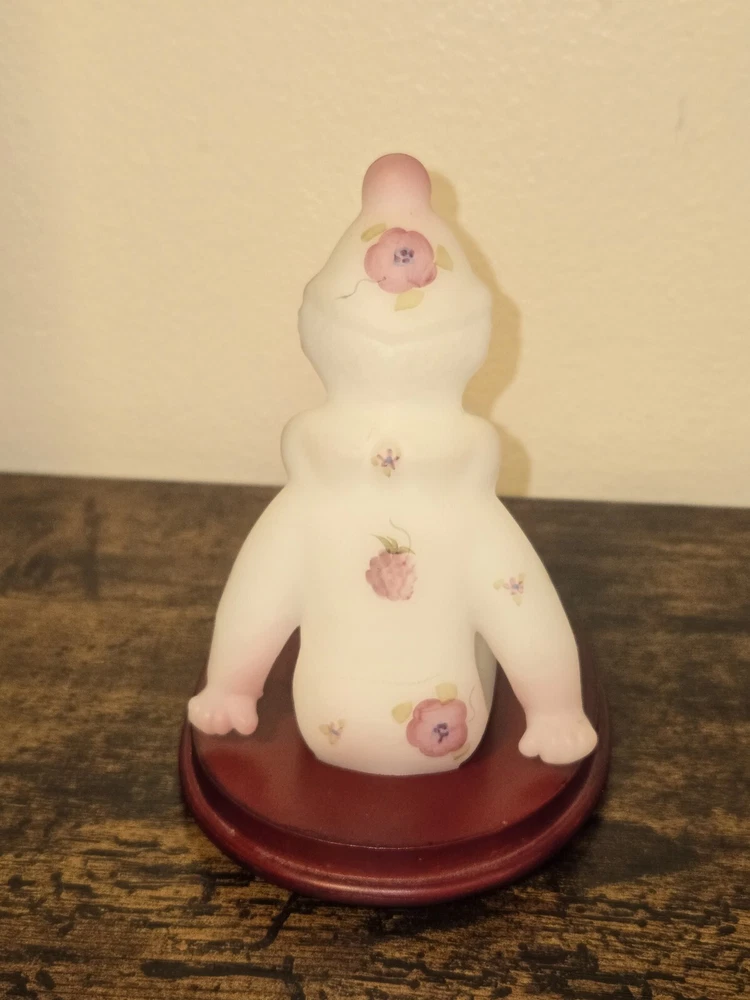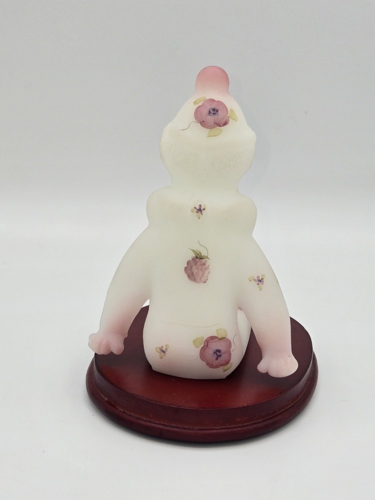 This adorable Fenton clown figurine is a must-have for collectors! The hand-painted berries and blossoms design pops against the milky satin glass, and the intricate details are stunning. It sits perfectly on its stand, adding a playful yet elegant touch to any display. The craftsmanship is top-notch—pure Fenton quality!