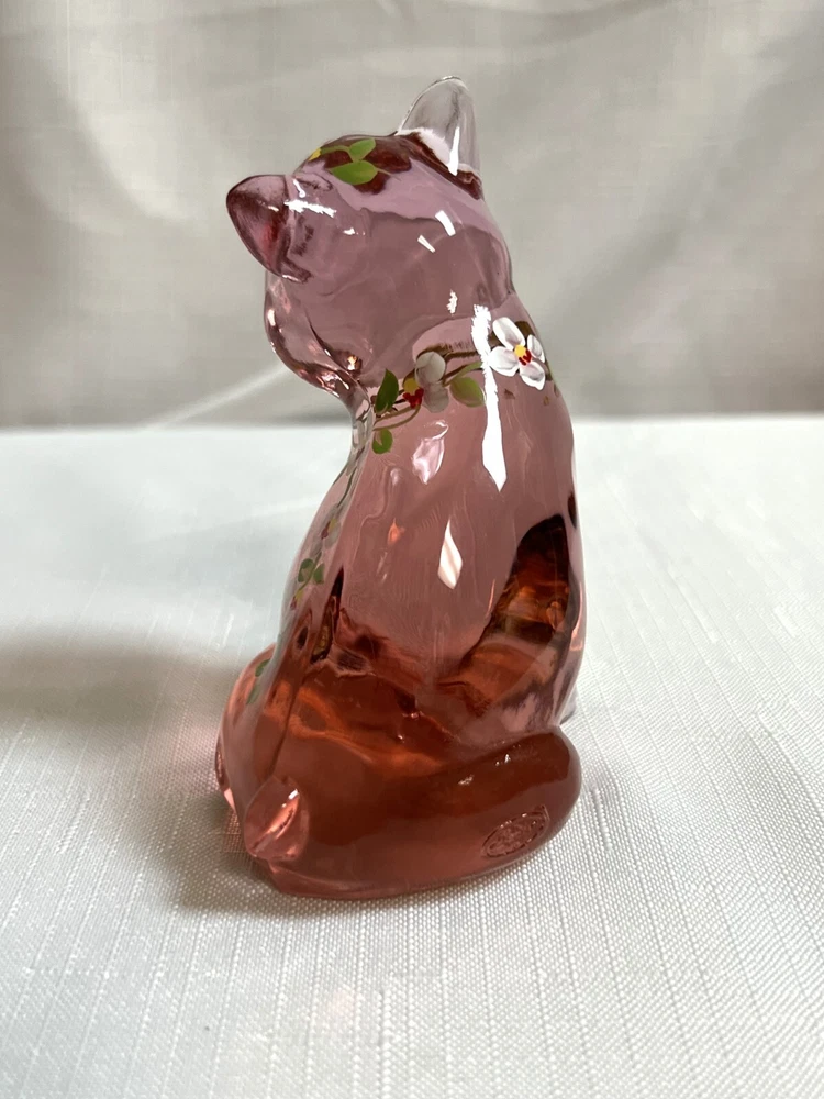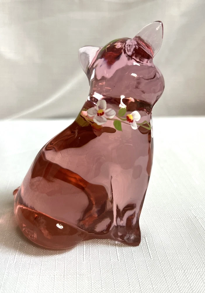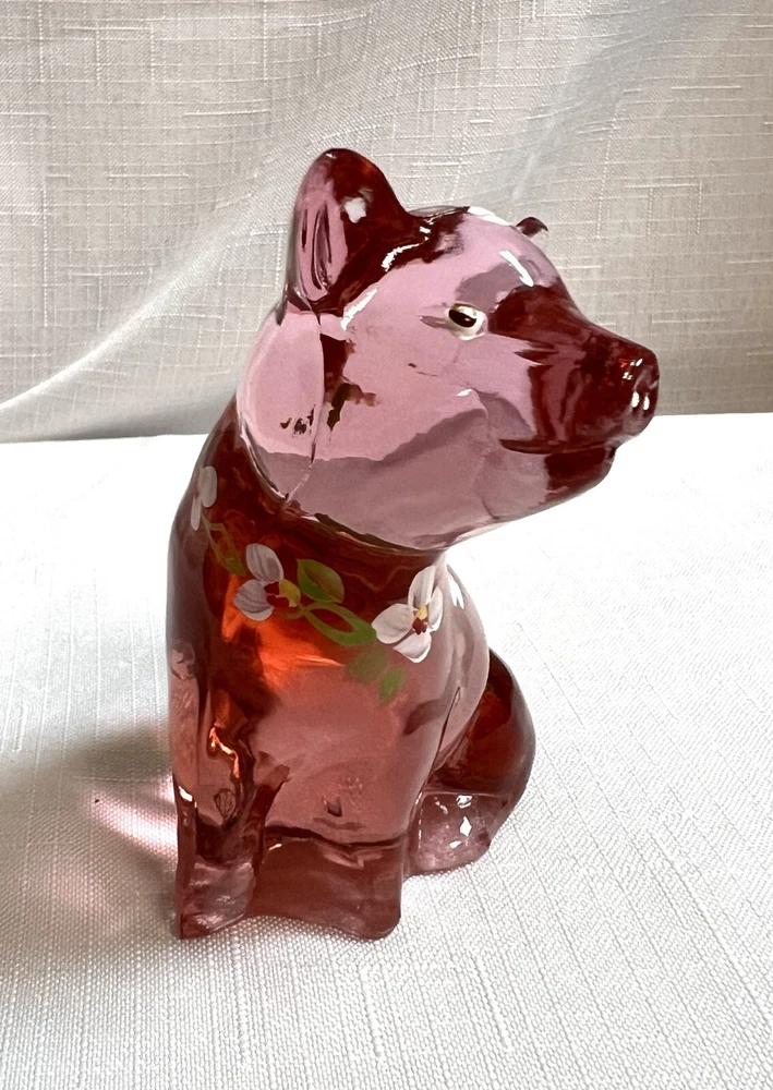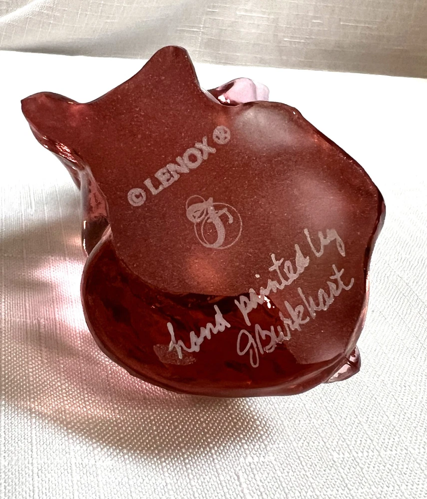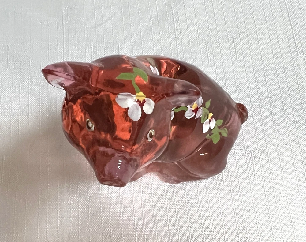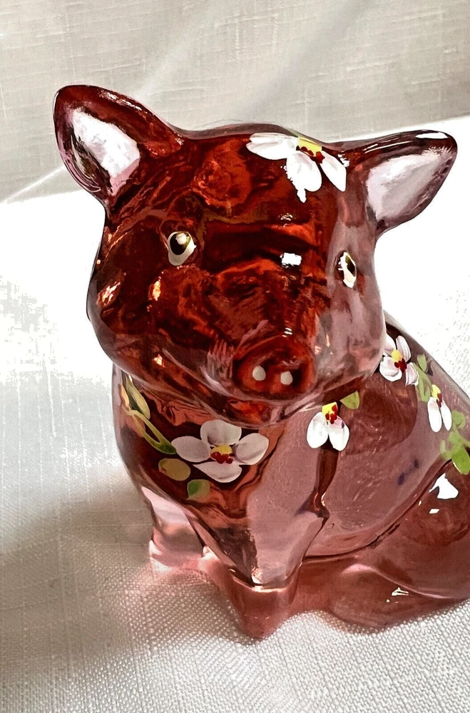 This Fenton Pig figurine is a rare vintage piece from 1999, signed by artist J Burkhart. Handmade in North America, it features a charming pink color with hand-painted floral patterns, standing at 3 3/4 inches tall. This decorative art glass figurine is part of the Lenox/Fenton product line and showcases intricate craftsmanship. It is a unique collectible item that adds a touch of elegance to any space.