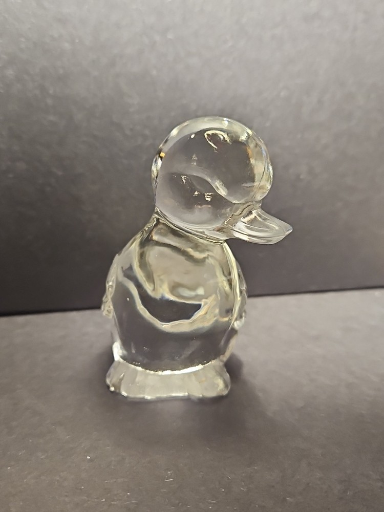This Fenton Duckling figurine is a 3.5-inch tall piece of clear solid glass, featuring a glossy finish. Made in the United States during the late 20th century, this vintage collectible is part of the Glass Pets product line. The figurine depicts a duckling in an animal-themed design, making it a decorative and charming addition to any collection. With its original production technique of molded glass, this Fenton duckling figurine is a unique and detailed piece for collectors of decorative pottery and glassware.