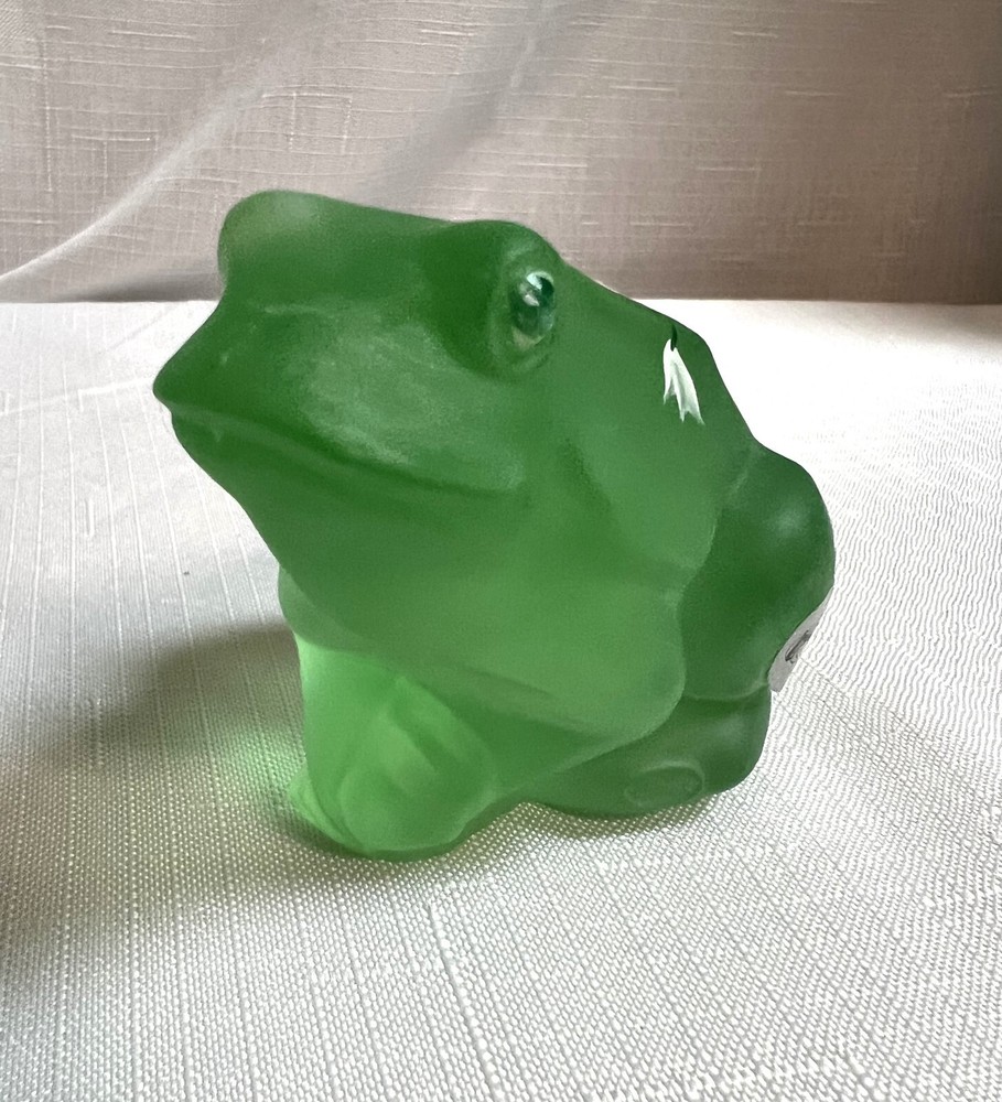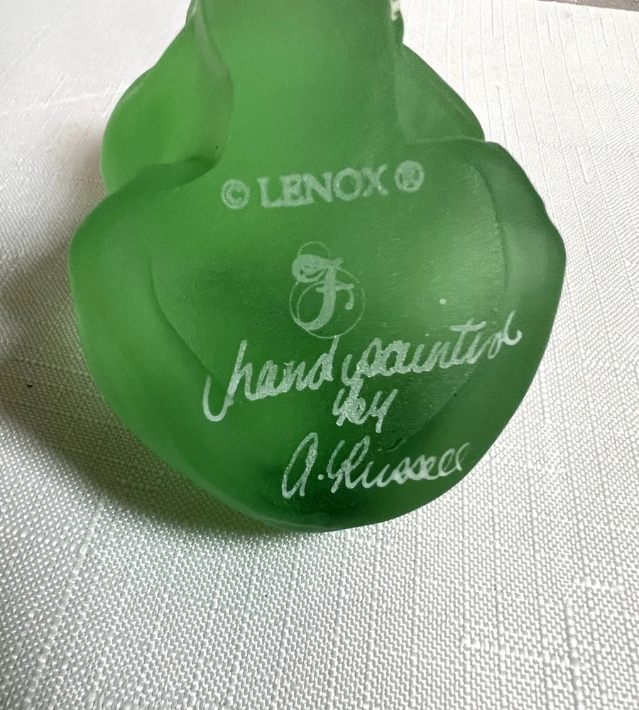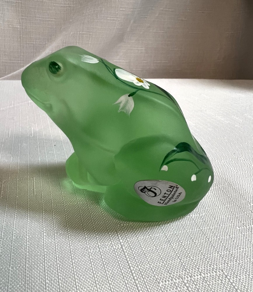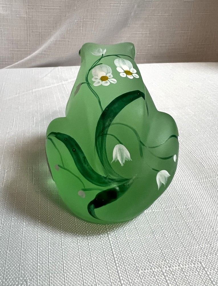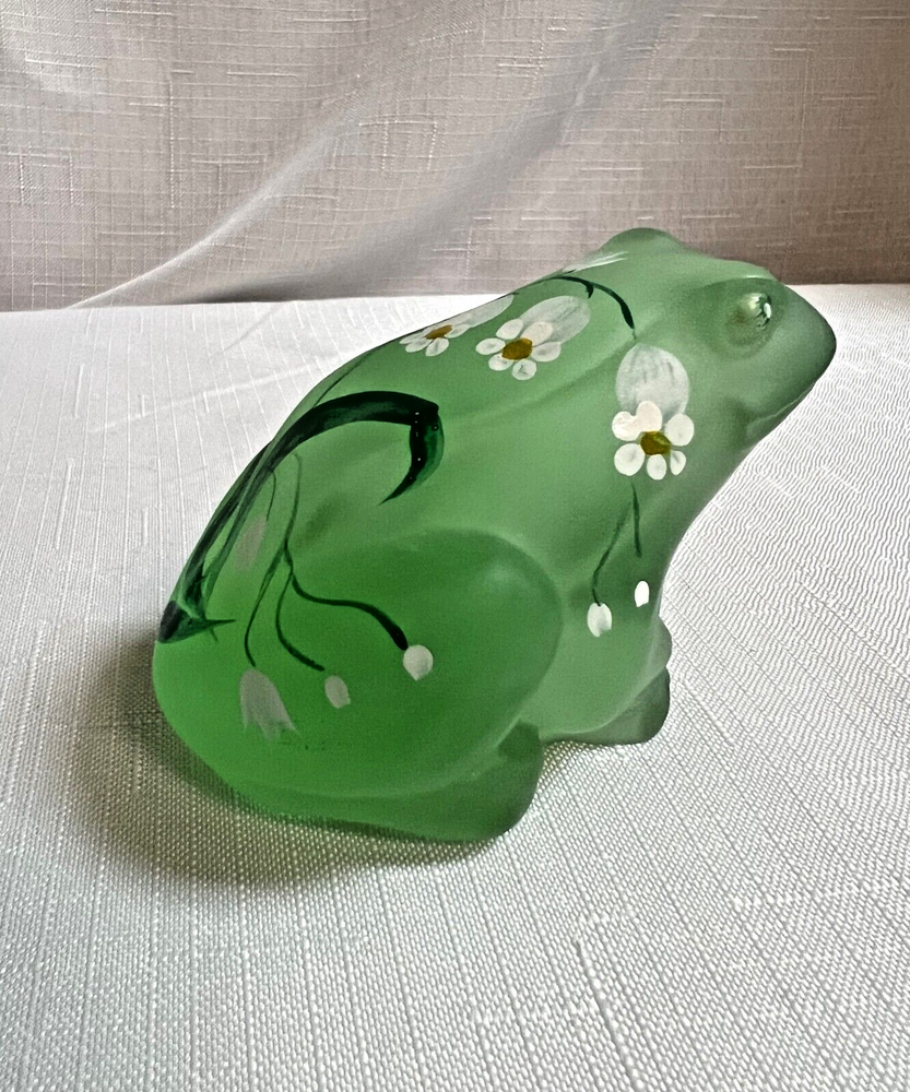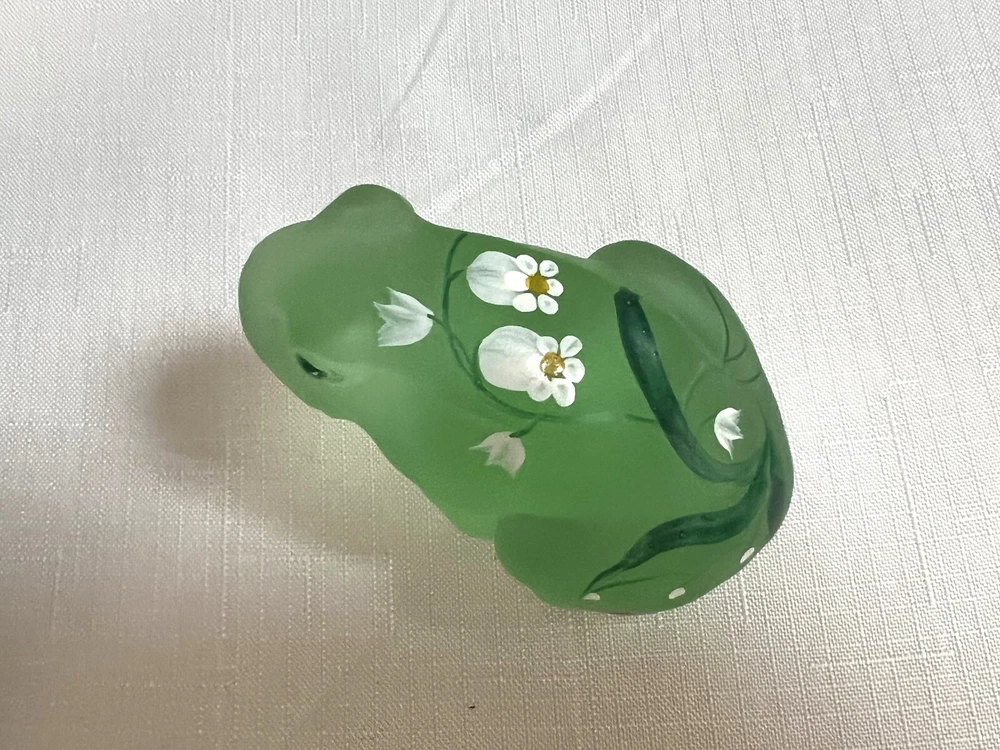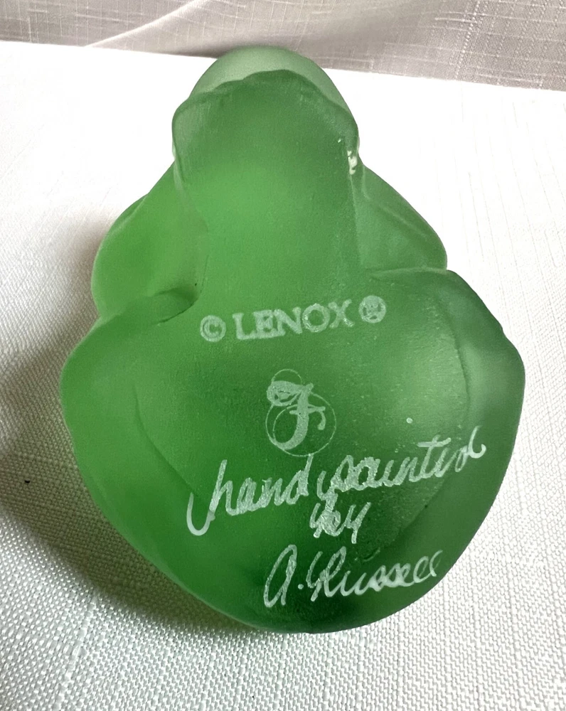 This vintage Lenox Fenton frog figurine features a frosted green glass design adorned with hand-painted daisies, signed by artist A. Russell. Measuring 3.25 inches in length and 2.25 inches in height, this decorative piece showcases a charming frog theme with floral accents, embodying a style that exudes elegance and artistry. The backstamp indicates its hand painted in the United States, adding to its appeal as an original art glass production by Lenox.
