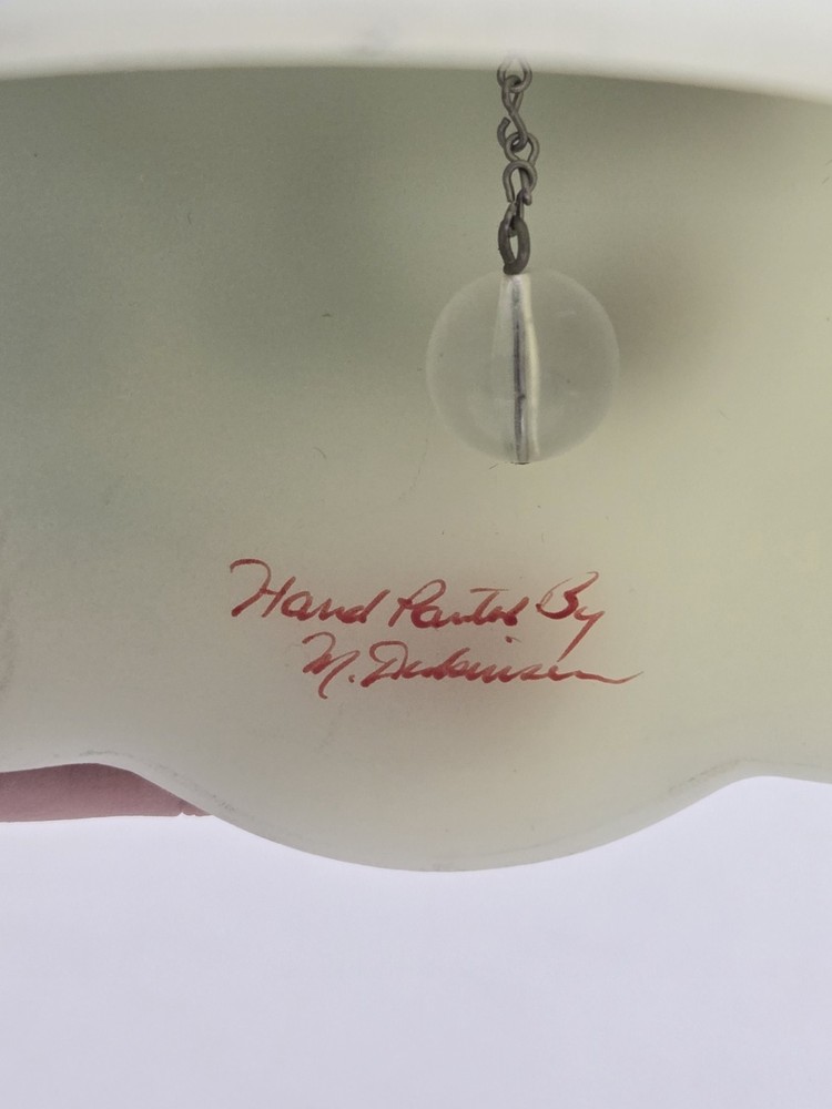This beautiful Fenton glass bell is a must-have for collectors of decorative art glass. The bell is made of pressed glass in a lovely yellow custard satin color, with a pattern of going home that is hand-painted by Michael Dickinson. The bell is signed by the artist and has an impressed backstamp. This original and unique bell was manufactured in the United States in 1980, during the late 20th century. It features a Christmas theme and is a vintage item. The bell is handmade and has a production style of art glass. It is a perfect addition to any collection of bells or decorative art glass.