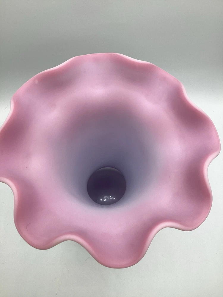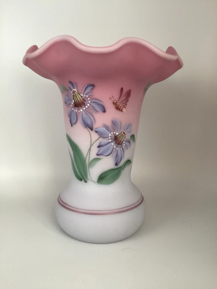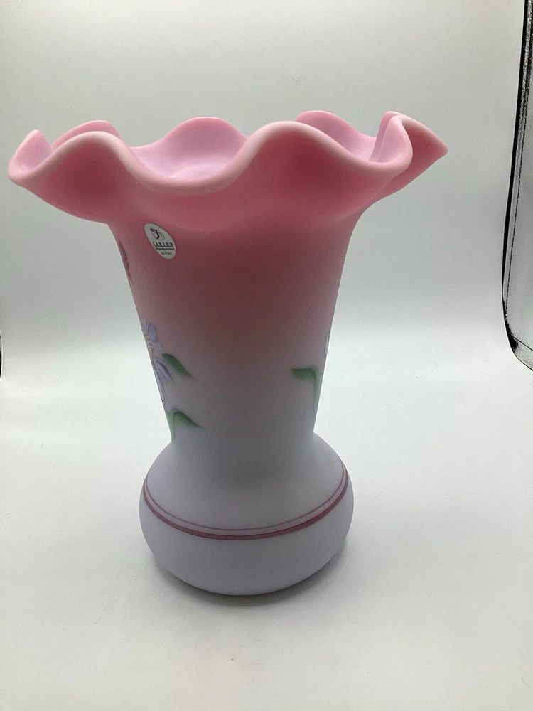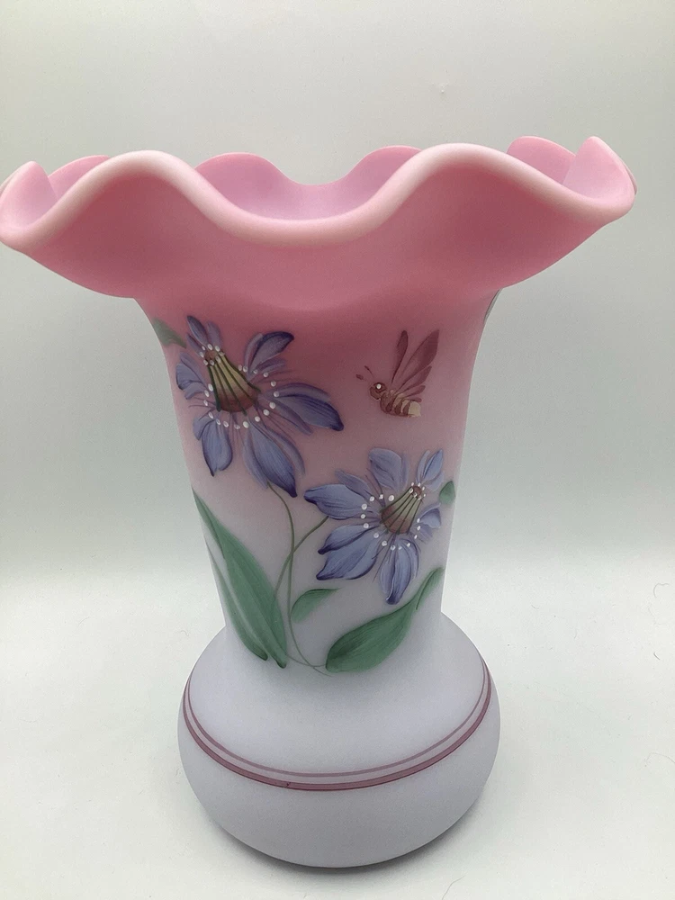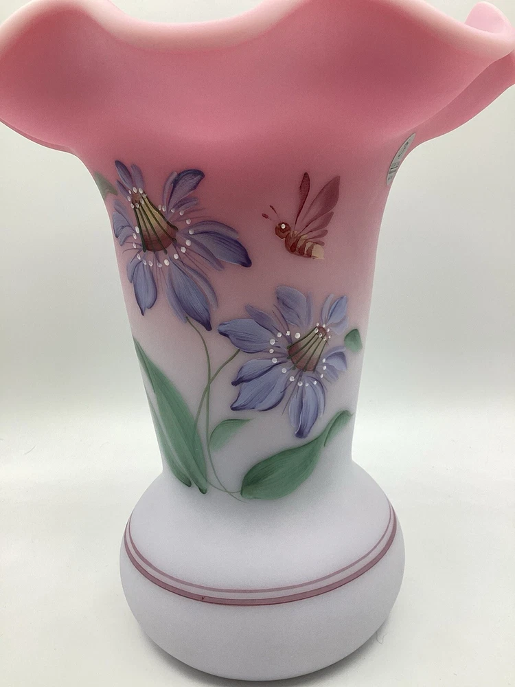 Fenton Ltd Ed Blue Burmese Honor Collection Showcase Dealer Exclusive 2001 Vase. This beautiful vase is designed by JK Spindler. Spindler’s bed of “Purple Passion Flowers” features a wistful hummingbird moth hovering nearby. Has beautiful purple flowers painted around the entire vase. It is hand painted and signed by the artist D. Robinson. The artist signature is signed underneath one of the flowers. Each piece is numbered and inscribed with the signature of Frank M Fenton. This piece is number 317 of only 2500. This vase is blue Burmese and is a showcase dealer exclusive piece. It is approximately 9 1/4” tall and the top opening is 8” across. There are no chips or cracks. Comes with the original box and card.