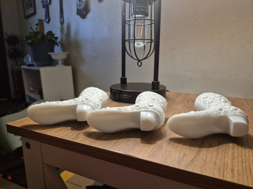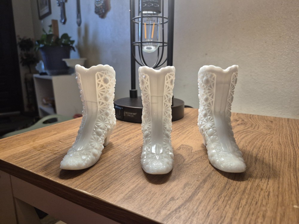 These collectible items are vintage Fenton milk glass boots featuring the Daisy and Button pattern. There are 3 .... Will sell separately or all together. Manufacturer: Fenton Art Glass Company. Material: White milk glass. Pattern: Daisy and Button. Usage: Commonly used as small floral vases, toothpick holders, or decorative figurines