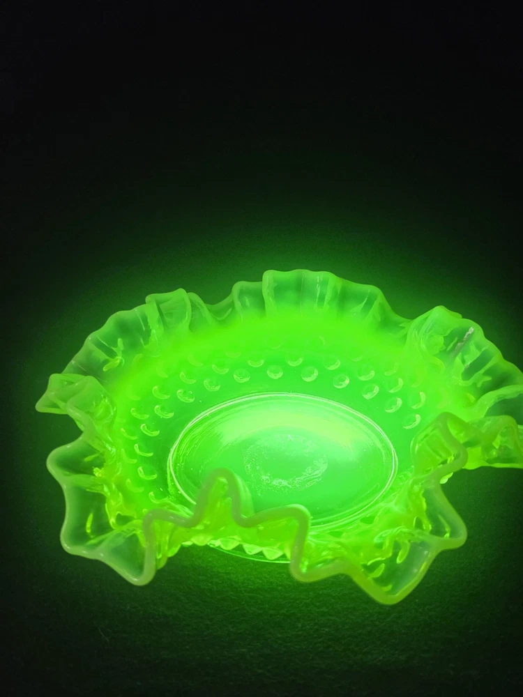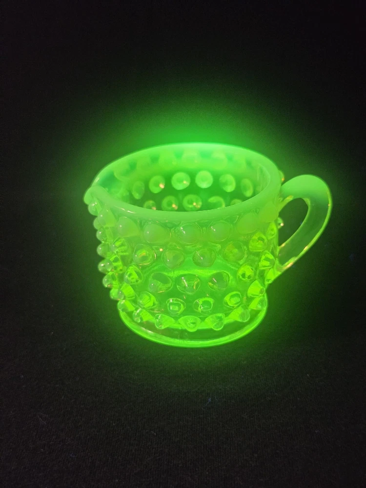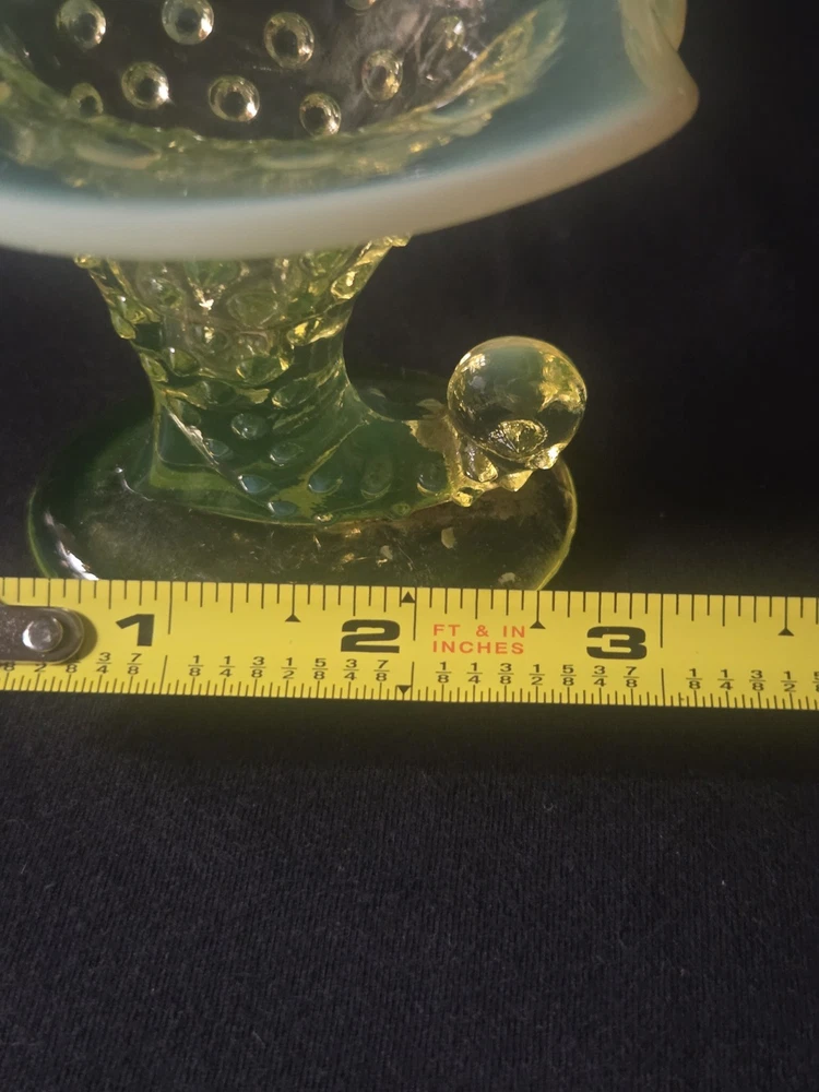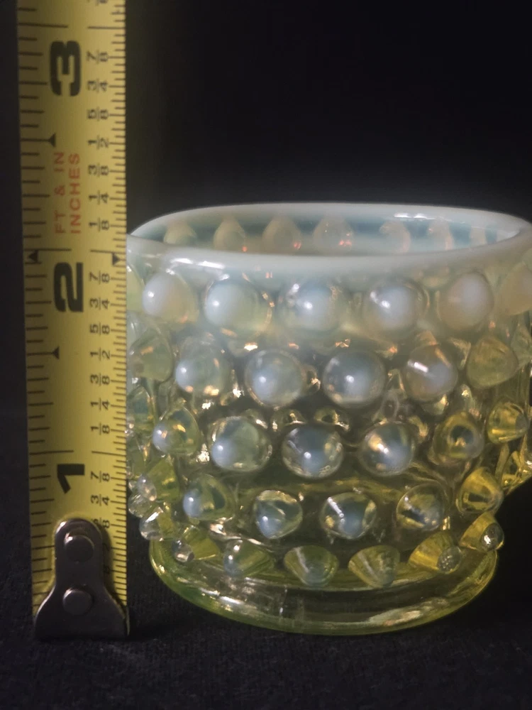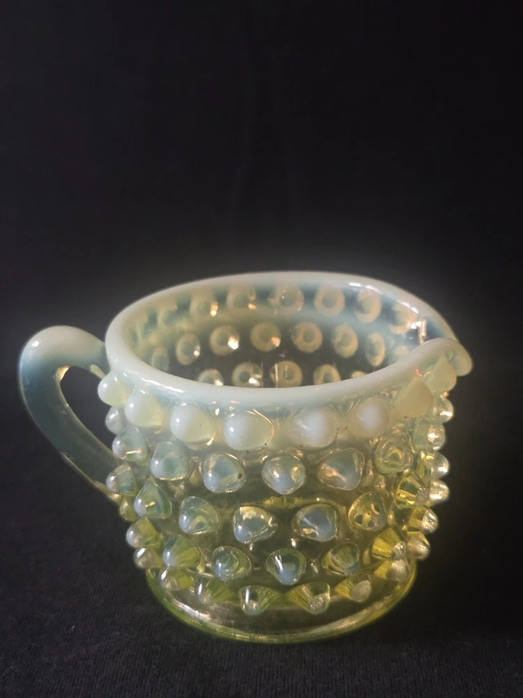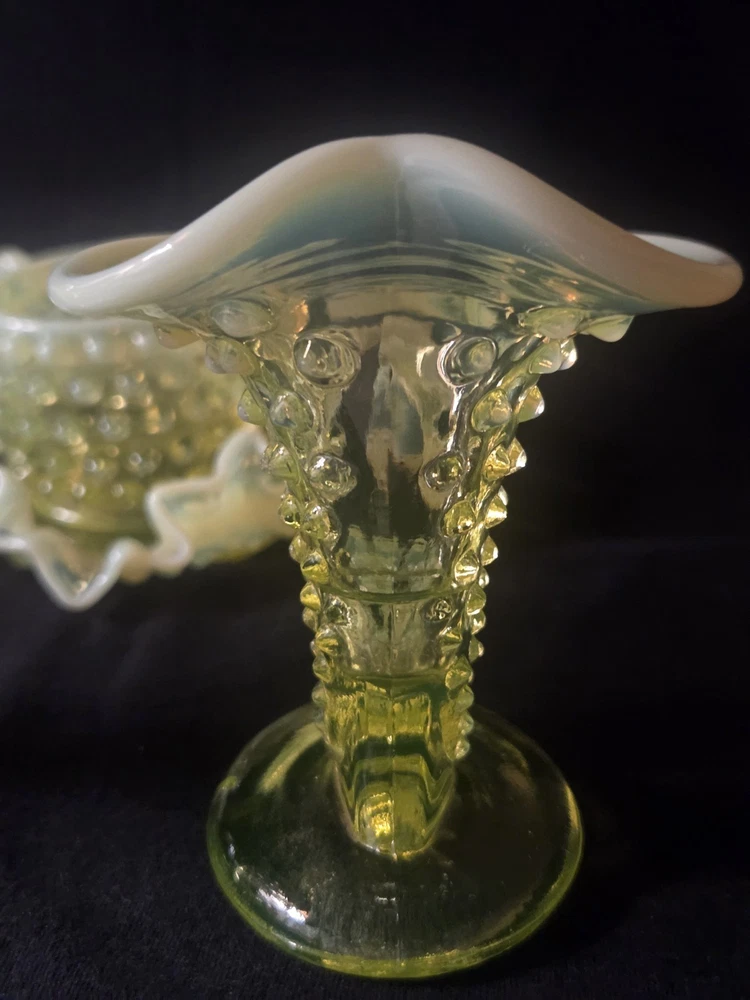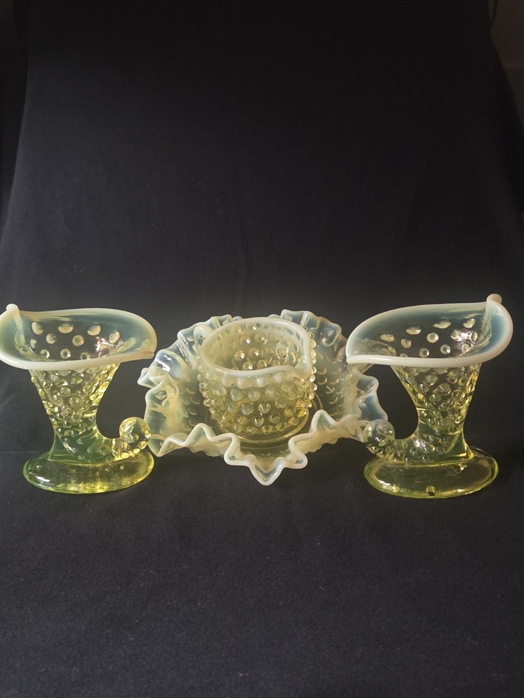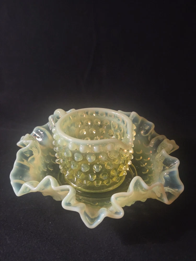 Fenton SET Topaz Uranium Opalescent Hobnail Dish, Cup, And Two Cornucopia