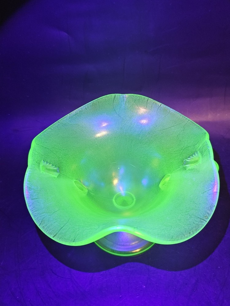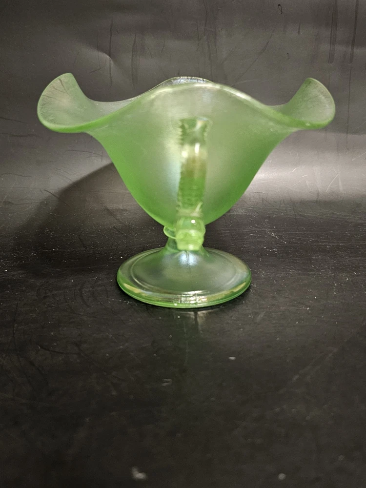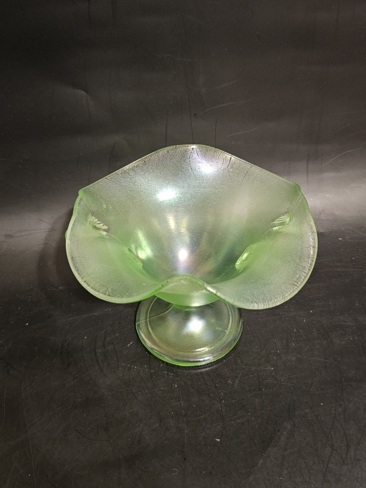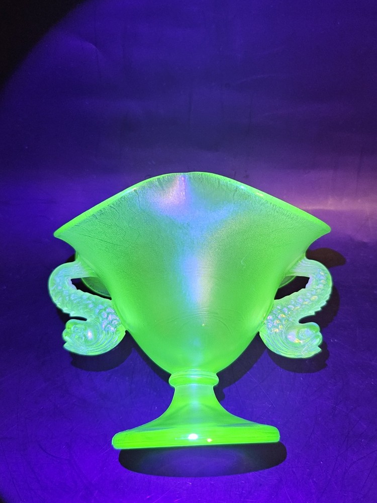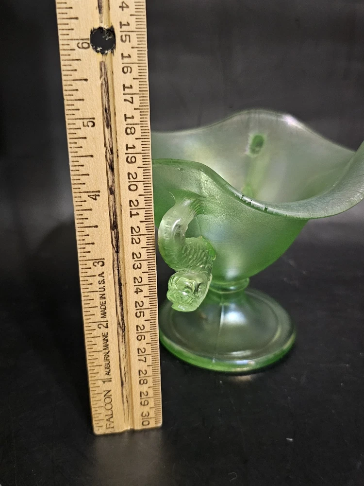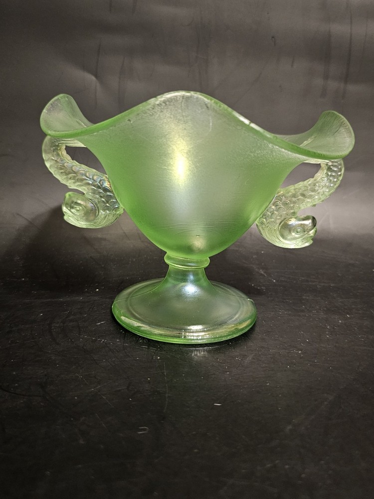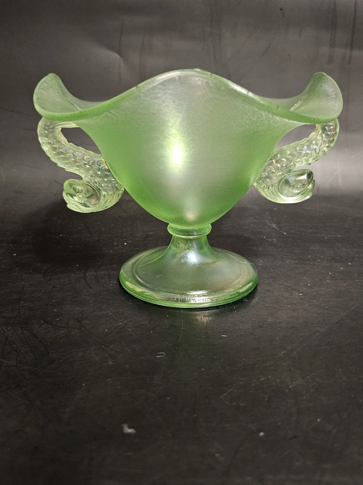 In excellent condition The 1533 Fenton Topaz Stretch Dolphin Handled Comport is a vintage glass figurine from the early 20th century. Made in the United States in 1931, this Art Deco style piece features a 3D effect and color-changing properties. Hand-blown with a matte finish, it showcases the intricate craftsmanship of Fenton glass, now a sought-after collectible for pottery and glassware enthusiasts. This unique and decorative piece is a rare find from the Americas, making it a valuable addition to any collection.
