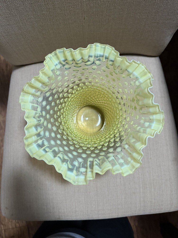 Color: Yellow Occasion: All Occasions Packaging: Box Glassmaking Technique: Hand Blown Type: Vase Size: Large Finish: opalesent Year Manufactured: 1940 Signed: No Brand: Fenton Style: The Great Depression Vintage: Yes Production Technique: Hand Blown Glass Material: Glass Care Instructions: Clean with Damp Cloth Pattern: Ruffled Origin: North American Time Period Manufactured: 1940-1949 Era: Mid 20th Century (1941-1969) Original/Reproduction: Original Country of Origin: United States
