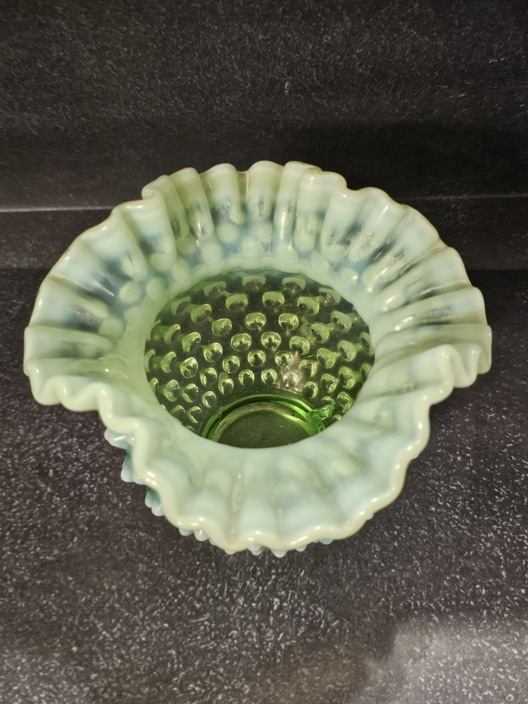 Elevate your glassware collection with the Fenton Hobnail Lime Green Vaseline Opalescent Uranium miniature vase. A true gem from the 1950s, this piece showcases the exquisite craftsmanship of the era with its hand-blown glossy finish. Its vibrant lime green hue and classic hobnail pattern are a testament to the timeless beauty of Fenton's pressed glass designs. Carefully crafted in the United States, this antique vase stands at 4 1/2 inches tall, making it a charming addition to any curio cabinet or display shelf. With its distinctive uranium glass quality, it emits a subtle glow, adding a touch of vintage elegance to your space. This original piece, handmade with the care and attention to detail that Fenton is known for, is a must-have for collectors and enthusiasts alike.
