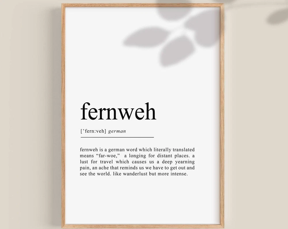 Fernweh Print Fernweh Definition German Gifts German Wall Art Germany Print Wanderlust Travel Lover Gift Material: Premium luster photo paper Print type: Inkjet printing One side printed + The finish provides the highest possible resolution and color saturation + Lasts up to 200 years in color and 400 years in black-and-white + Printed on high-quality resin-coated photo base paper medium + Posters can be hung with double-sided tape, tacks, or framed + Hand washing with a gentle cry cloth is recommended for extended durability I will hand select the best choice of paper for your chosen design to ensure top quality results for a beautiful, bright and luxurious print. All prints are sealed in cellophane slips for protection during transportation, and are shipped in a protective cardboard envelope.