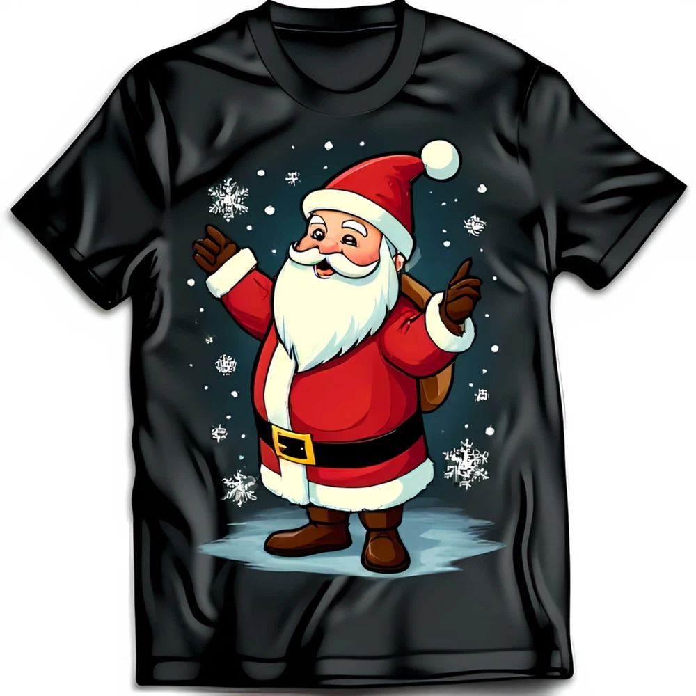Festive Black T-Shirt with Cartoon Santa Claus & Design