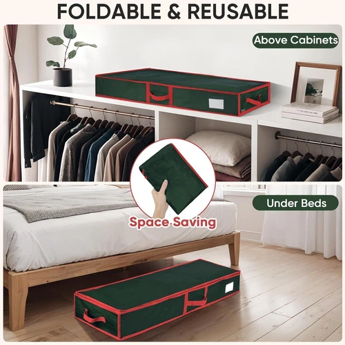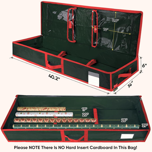 BALEINE SOFT Christmas Wrapping Paper Storage Bag, 40" Durable PE Gift Wrap Storage Bag with Flexible Partitions and Pockets for Ribbon, Accessories (Green) LuxeFusion Product Description Features [SOFT DURABLE BAG] Please NOTE! The Christmas wrapping paper organizer is made of durable and lightweight PE tarp material. There is NO structure NOR hard cardboard in it. The gift wrapping organizer storage is an alternative for Christmas boxes, Christmas ornament storage, ribbon organizer and wrapping paper storage bin. The material provides an excellent water-resistant performance to protect your investment from dust, moisture, and even small critters [PERFECTLY SIZED] The wrapping paper storage containers has NO structure but it is a storage solution to store gift wrapping supplies. All-in-one storage container that is generously sized for extra wide rolls and smartly partitioned for small gadgets. The dimension of the gift wrap organizer is about 14''x40''x6.2''. [EASY ACCESSIBLE] The flat paper organizer storage is designed to be easily hidden away underbed, above cabinets and in any shelves. Slim enough to put away anywhere, big enough to hold and protect every wrap paper rolls and accessories for the coming year after year. While in use, the extra clear vinyl pockets and flexible partitions makes it your own customizable wrapping center [OPEN TOP DESIGN] The whole top panel of the gift wrap storage can be opened for easy organizing and displaying. A tag pocket is in the top-right corner with which you can mark your collection for easier recognizing - fits up to 18 - 2.5” thick rolls, and up to 24 - 1.5” thick rolls. Note: the exact quantity of wrapping paper rolls that fit in the storage tote bag depend on the actual thickness of the rolls Product Details Package Dimensions: 8.19 x 7.72 x 2.17 inches Item Weight: 4.8 ounces Manufacturer: BALEINE Number of pieces: 1 Batteries required: No Brand: BALEINE Color: Green Material: Polyethylene (PE) Theme: Christmas Number of Items: 1 Unit Count: 1 Count Product Dimensions: 14"L x 6.2"W x 40"H Pattern: Christmas Size: 1 Count (Pack of 1) 🚚 Free Shipping All orders ship free and fast to your doorstep. 🔁 Easy Returns Satisfaction guaranteed. 30-day returns, no questions asked. 💬 24/7 Support Contact us anytime; we’re here to help, day or night. Brought to you by LuxeFusion – Quality you can trust.