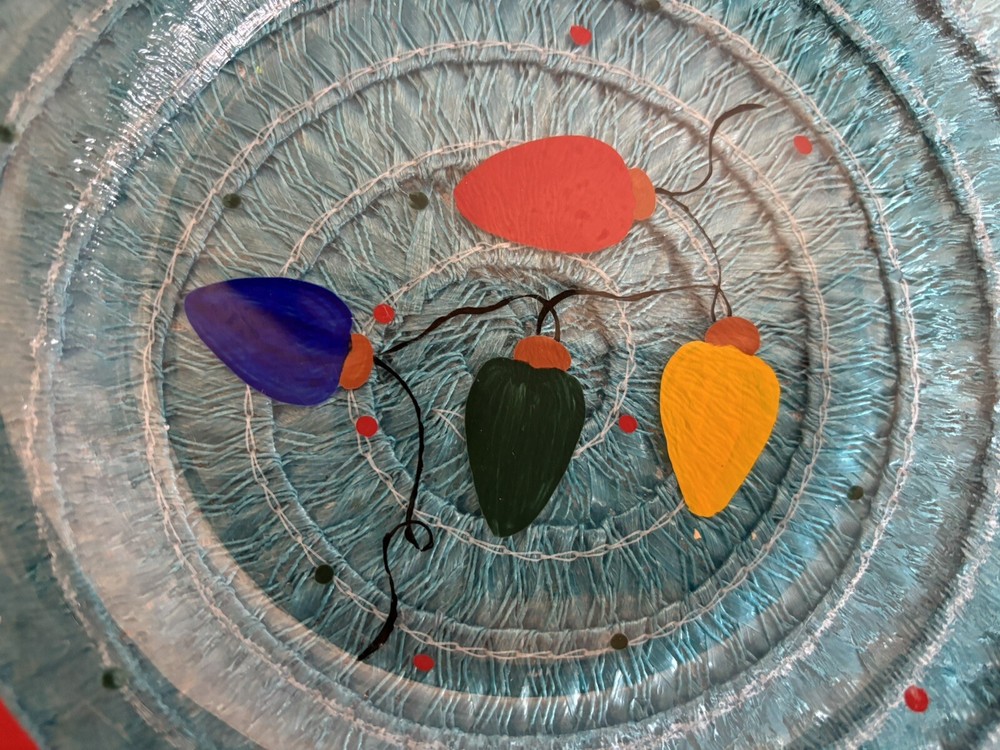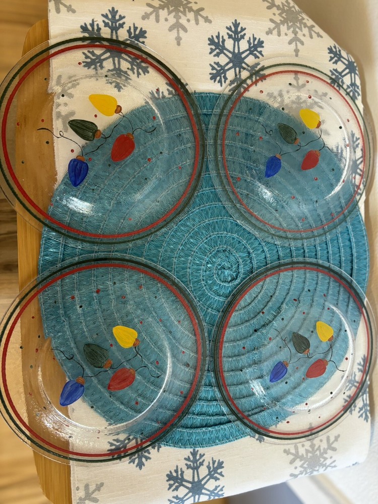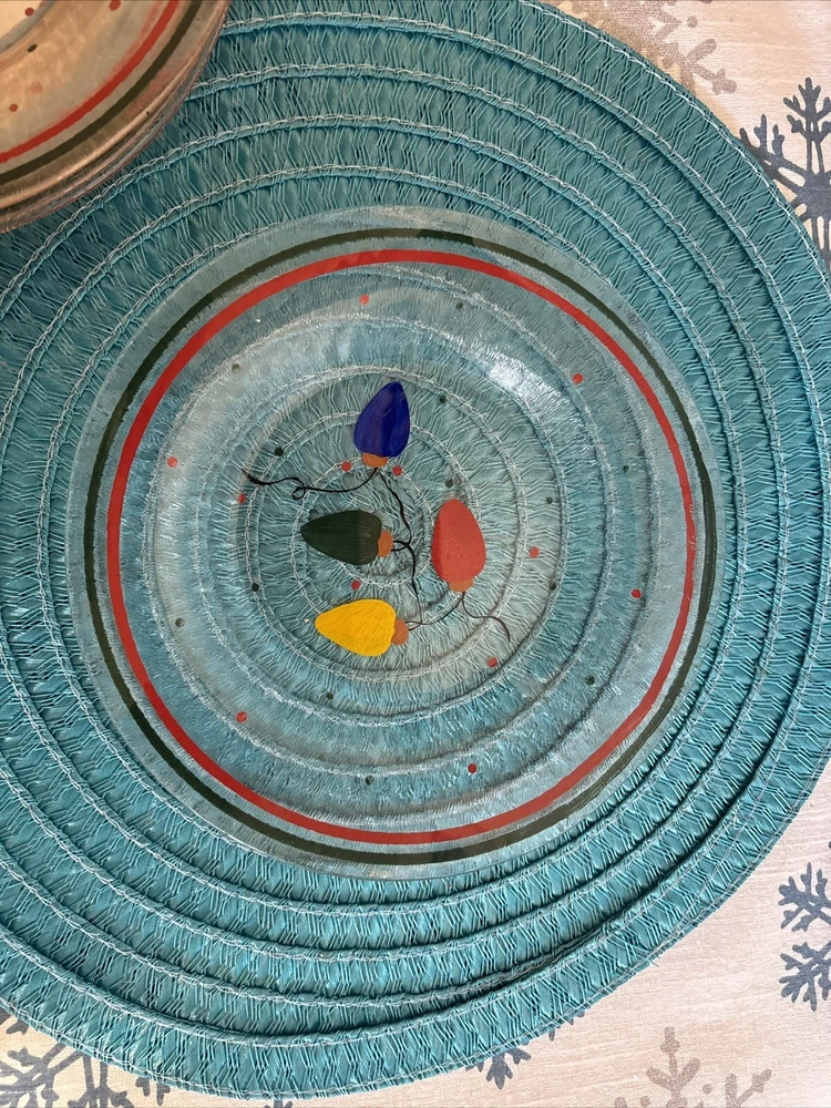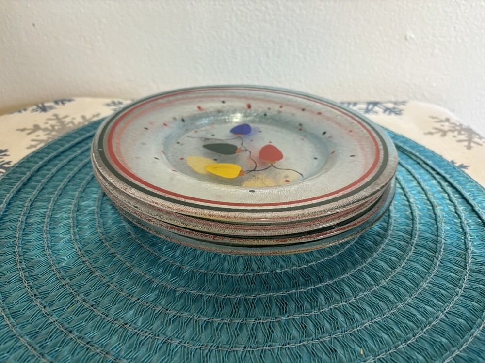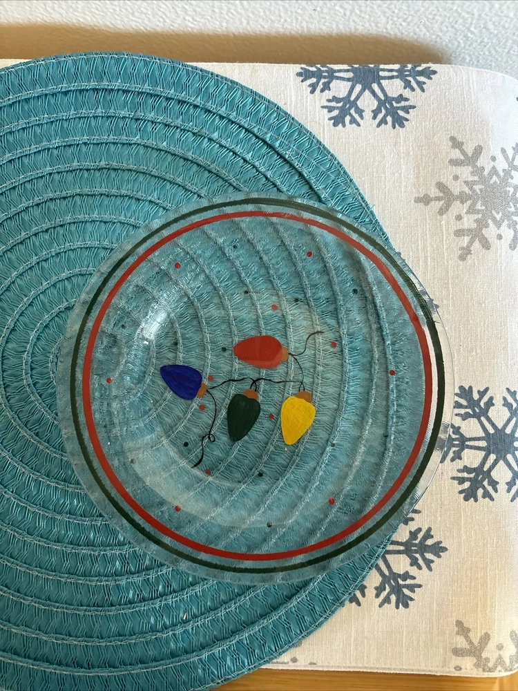 Add a festive touch to your table with this beautiful set of four hand-painted Christmas lights glass plates. The clear glass plates feature a stunning string of Christmas lights design in red, green, blue, and yellow colors, making them perfect for your Christmas dinner parties or as a unique addition to your home décor. The 8-inch plates are made of high-quality glass material and are perfect for serving desserts or snacks. These Christmas light glass plates are a perfect fit for any occasion and will undoubtedly impress your guests. The plates are designed with intricate details and are a great addition to your holiday décor. So, whether you're hosting a party or simply want to add some festive cheer to your home, these plates are a must-have.