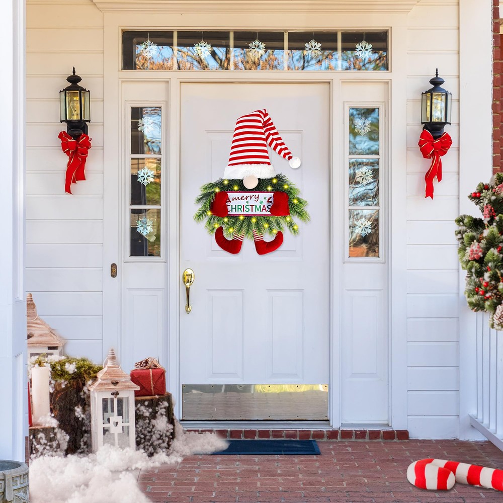 Looking for the suitable focal point to spruce up your front door or entryway for coming Christmas season? This Christmas hanging decoration is a welcoming front door decor. Product specification: Materials: felt and wood Size: Height: 19’’ Width:14’’ Color: Green and red Application: front door, wall, indoors,outdoors,window,fireplace,farmhouse, living room, porch, centerpiece party, wedding, holiday and Christmas, winter,holiday,Thanksgiving, Xmas festival celebration. Features: This Christmas gnome wreath has a longer compared to the real , the shape and color will stay fresh even a few years later, no need to water or sunlight. This Santa gnome christmas hanging sign for front door can be used as a gift for front door, wall, indoors,outdoors,window,fireplace,farmhouse, porch, wedding, holiday festival celebration,etc. This Swedish Tomte wall décor has special design, made of soft felt and plastic with purely manual process. The appearance of the wreath is very natural, just like the real . Package Included: 1×Gnome Wreath [SANTA GNOME SIGN]: The cute Christmas gnome wreath is handmade with artificial pine and spruce, this Santa gnome holds with a “MERRY CHRISTMAS” sign,the bright color and 3D hands will add festive atmosphere and brighten up your home during Christmas. [HIGH QUALITY WREATH]: This Christmas wreath is made of soft felt and plastic branches full of rich texture, there is a loop on the back to hang the wreath. The height is 19 inches after folding the hat, 14 inch width, the entirely realistic wreath is vivid and vibrant. [UNIQUE DESIGN]: This Santa gnome Christmas hanging sign has special design, made of various of classic elements, such as red and white stripes, and Santa gnome shape,also add a warm lights to increase the Xmas atmosphere. The nose is high quality felt with beige color,the artificial pine needles color various light green to dark green, lush and full of art. [VERSATILE DECOR]:This Swedish Tomte wall décor is suitable for front door, wall, indoors,outdoors,window,fireplace,farmhouse, living room, porch, centerpiece party, wedding, holiday and Christmas, winter,holiday,Thanksgiving, Xmas festival celebration. It will provide your home a strong atmosphere, warm and elegant. [IDEAL GIFT CHOICE]: The gnome wreath is a great gift for Christmas decoration,it’s regarded as good luck and the brings good luck to families. We can easily take this lucky to our best friends, children, lover, parents. Can also be used as collectible housewarming gifts.