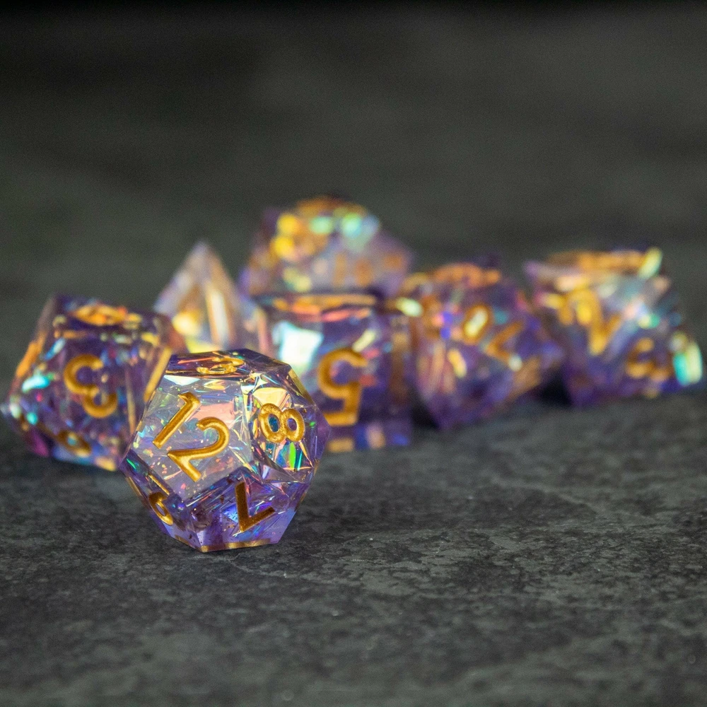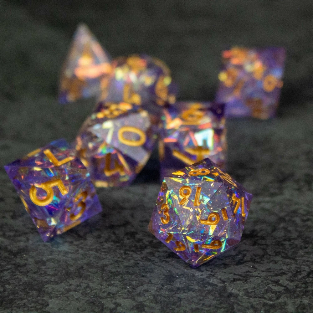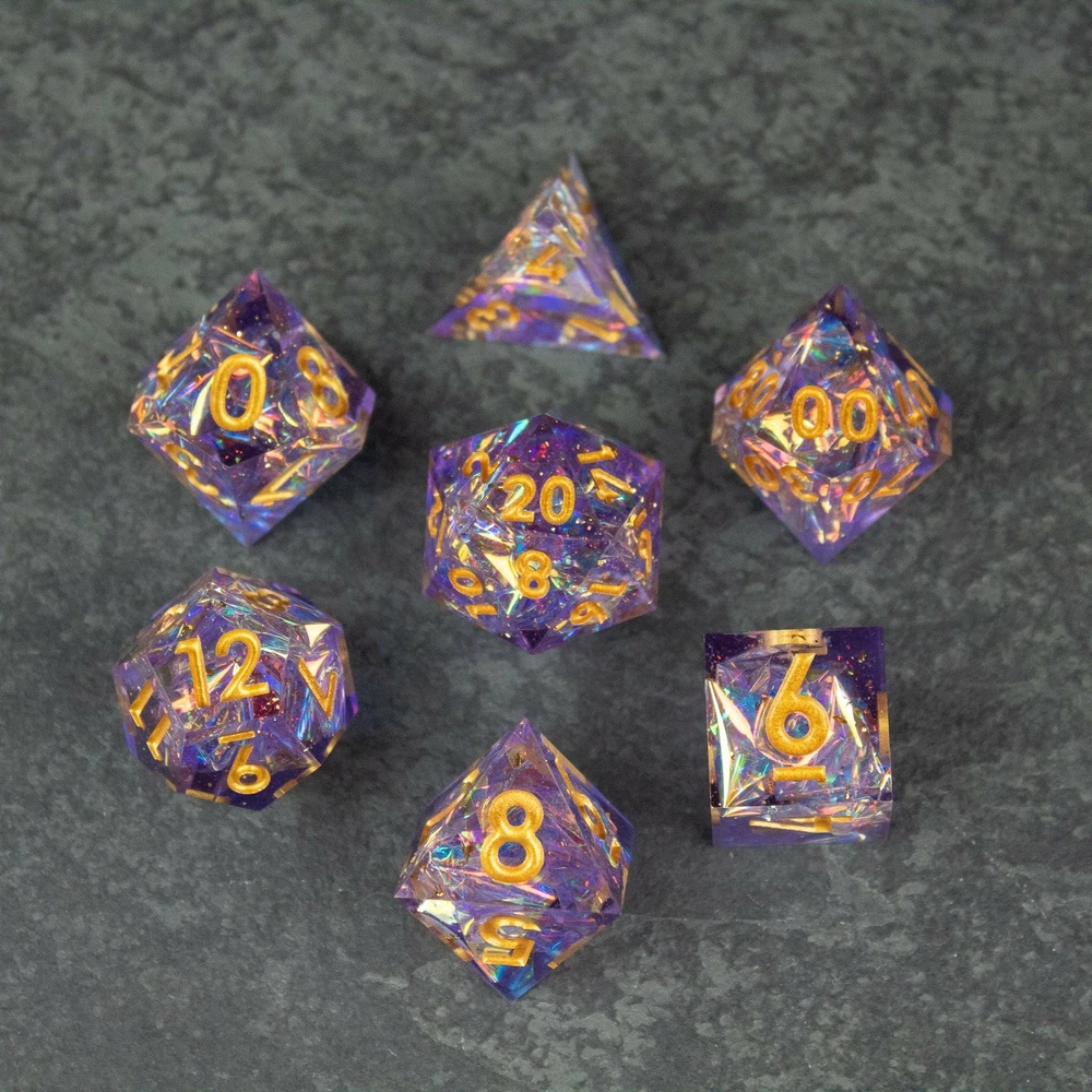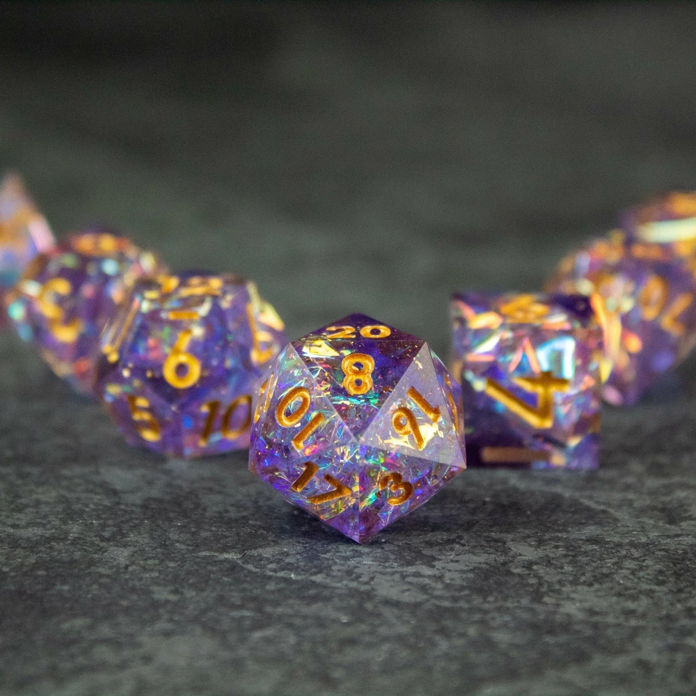 Chaos and wonder reigned in the Feywild. The Feywild DnD Dice Set features clear, lavender-colored resin with holofoil inclusions and subtle sparkles. Reminiscent of their namesake, they are chaotic and magical. These polyhedral dice have sharp edges and are ideal for TTRPGs like Dungeons and Dragons or Pathfinder. Perfect for any fae related characters Each set contains the 7 standard roleplaying dice - d4, d6, d8 d10, d10 in 10's, d12, and the classic d20. Details - Clear, lavender-colored resin with holofoil inclusions, sparkles, and gold ink - Sharp edges - Ships from the USA - Free returns if you're not satisfied!