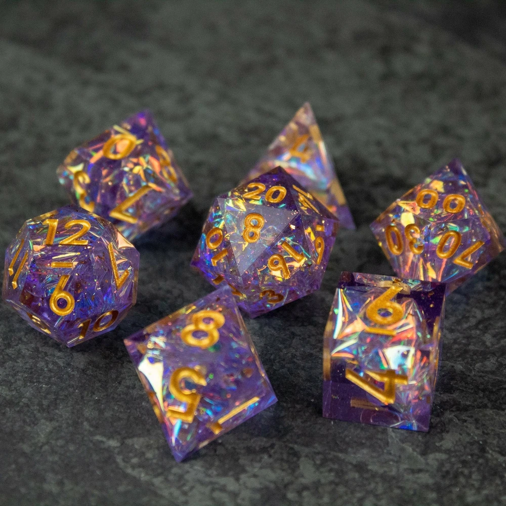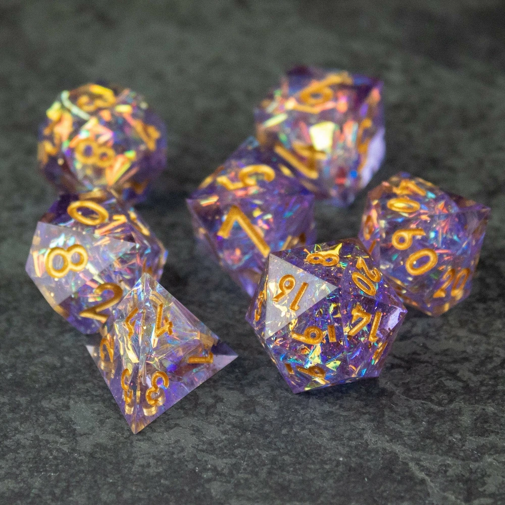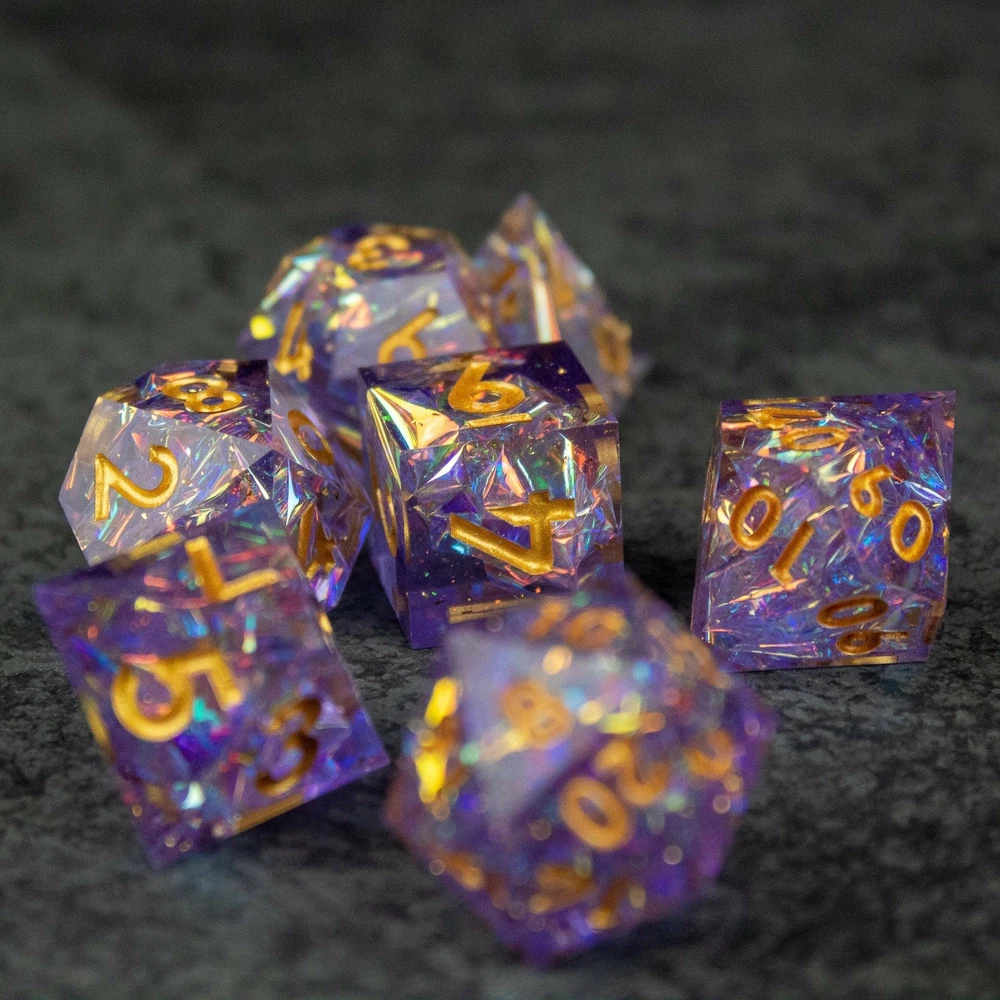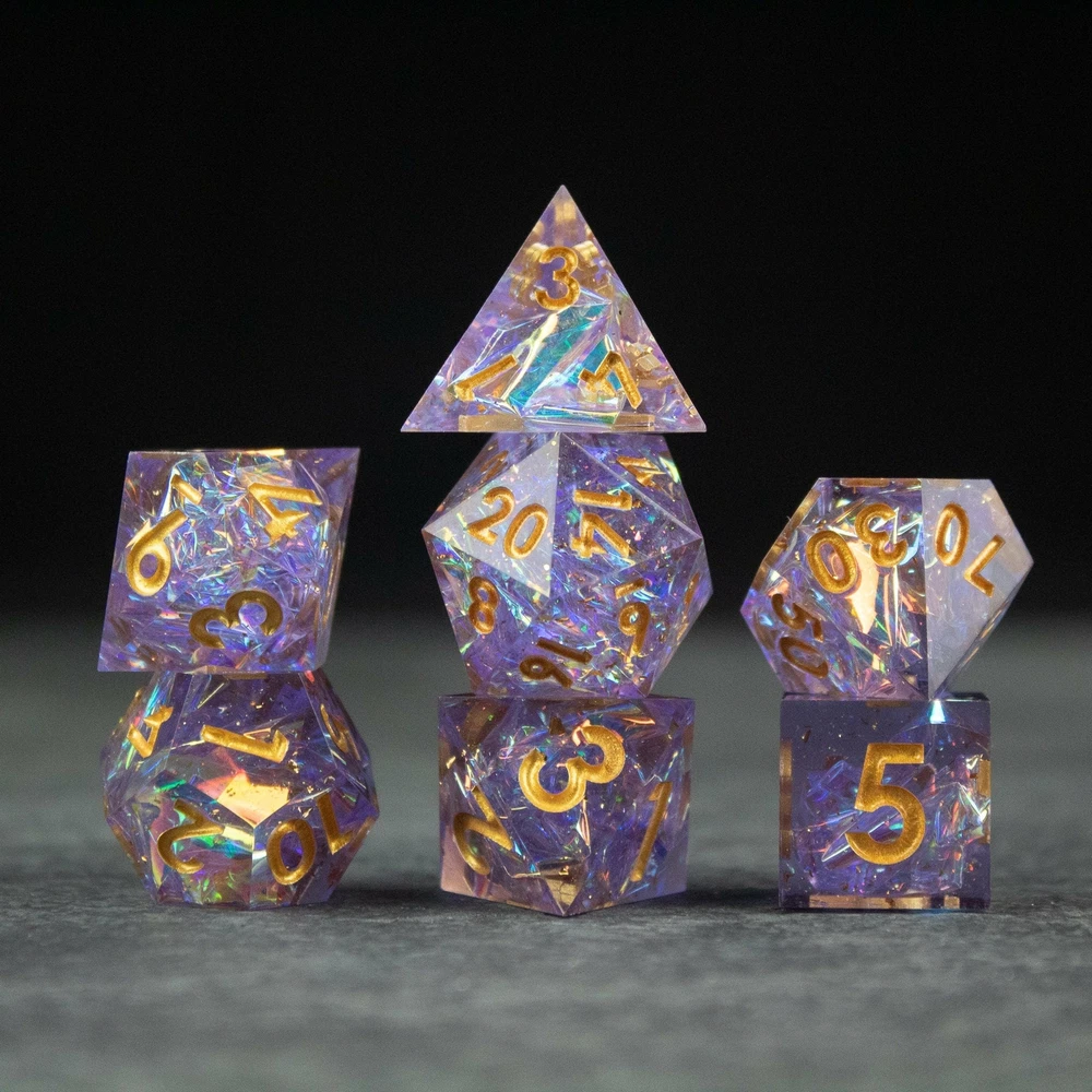 Chaos and wonder reigned in the Feywild. The Feywild DnD Dice Set features clear, lavender-colored resin with holofoil inclusions and subtle sparkles. Reminiscent of their namesake, they are chaotic and magical. These polyhedral dice have sharp edges and are ideal for TTRPGs like Dungeons and Dragons or Pathfinder. Perfect for any fae related characters Each set contains the 7 standard roleplaying dice - d4, d6, d8 d10, d10 in 10's, d12, and the classic d20. Details - Clear, lavender-colored resin with holofoil inclusions, sparkles, and gold ink - Sharp edges - Ships from the USA - Free returns if you're not satisfied!
