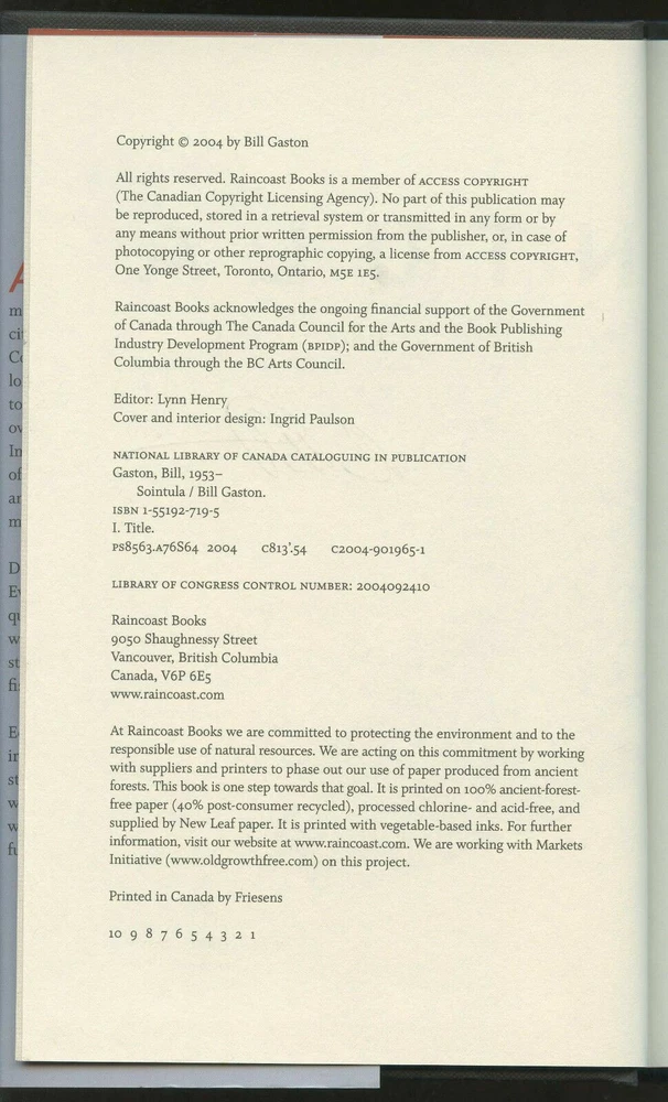 Fiction: SOINTULA by Bill Gaston. Signed on the title page by the author. Stated 1st edition. Printed 2004. Published by Raincoast Books, Vancouver BC. 6 inches wide by 8 3/4 inches tall. Original dust jacket. Black cloth covers with silver stamping on spine. 452 pages. Condition: Jacket shows light/little wear: light creasing on the spine edges; flaps are not clipped. Cover shows light/little wear under the paper: spine edges are not rolled, outer corners are not bumped, light dusting on the lower page edges. Penciled seller notes on the half-title page. Inked signature on the title page. No other writings or stampings inside the book. Inner pages are tanning lightly (if at all) and all are tight to the spine and supple. Money back upon return if not satisfied or any problems with shipping within the US. Due to changes at the US Postal Service, we can no longer guarantee a refund on international mail service failure to deliver. Thanks for looking. International Buyers – Please Note: Import duties, taxes, and charges are not included in the item price or shipping cost. These charges are the buyer's responsibility. Please check with your country's customs office to determine what these additional costs will be prior to bidding or buying. 10/25/17 1/9