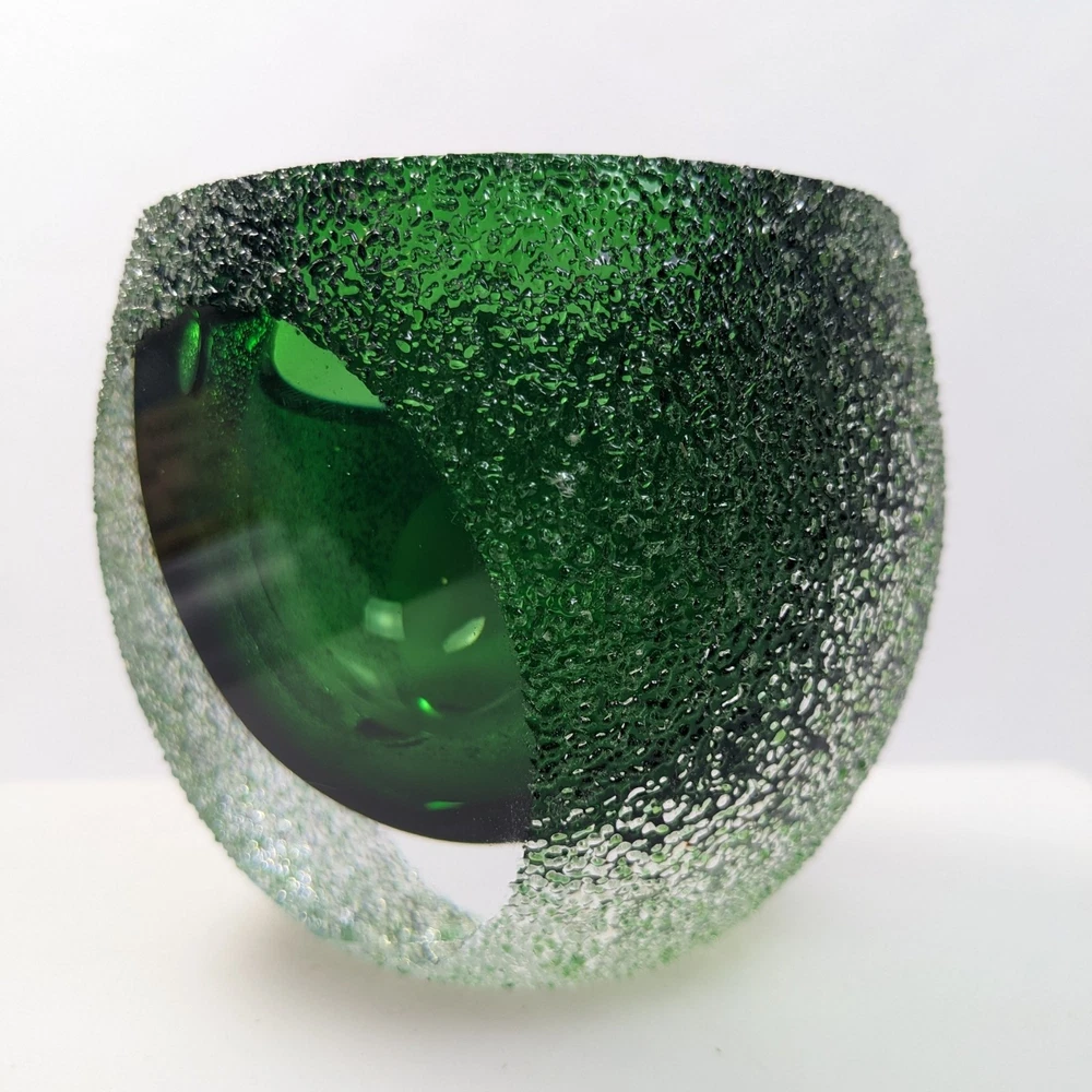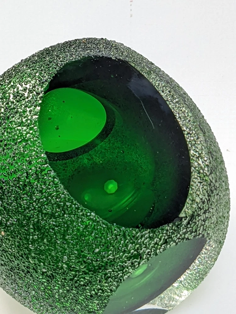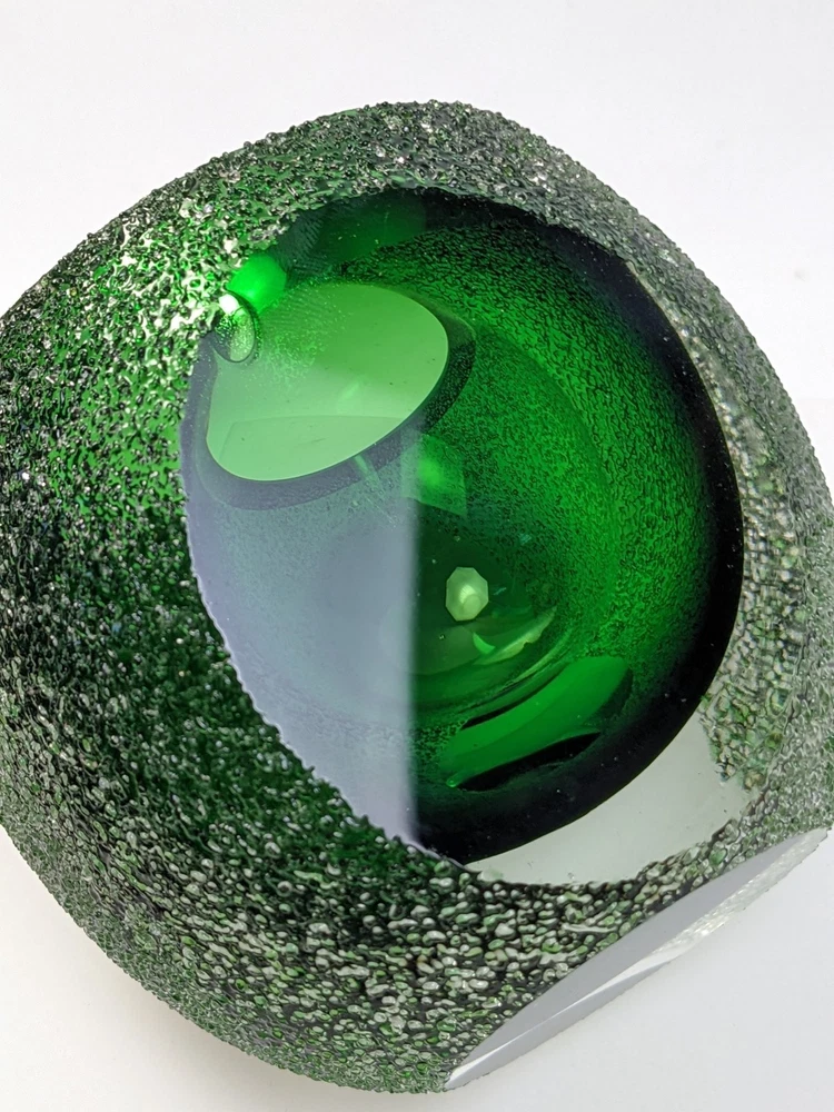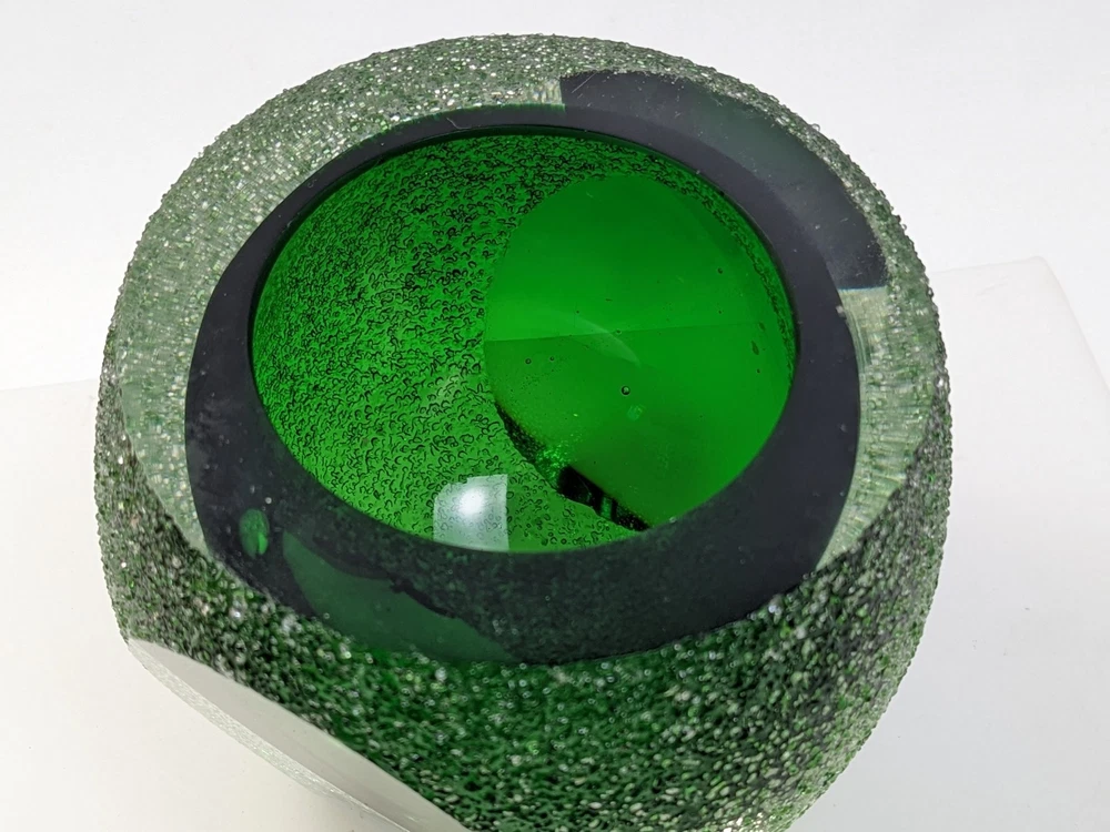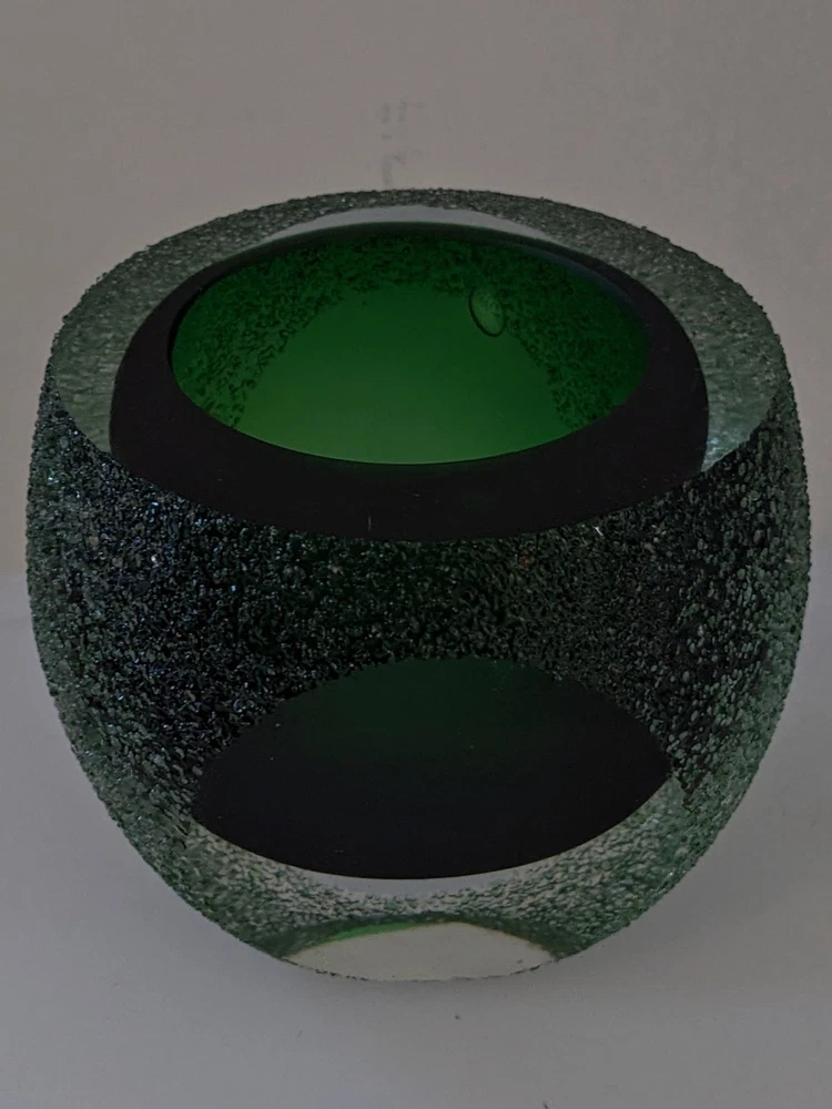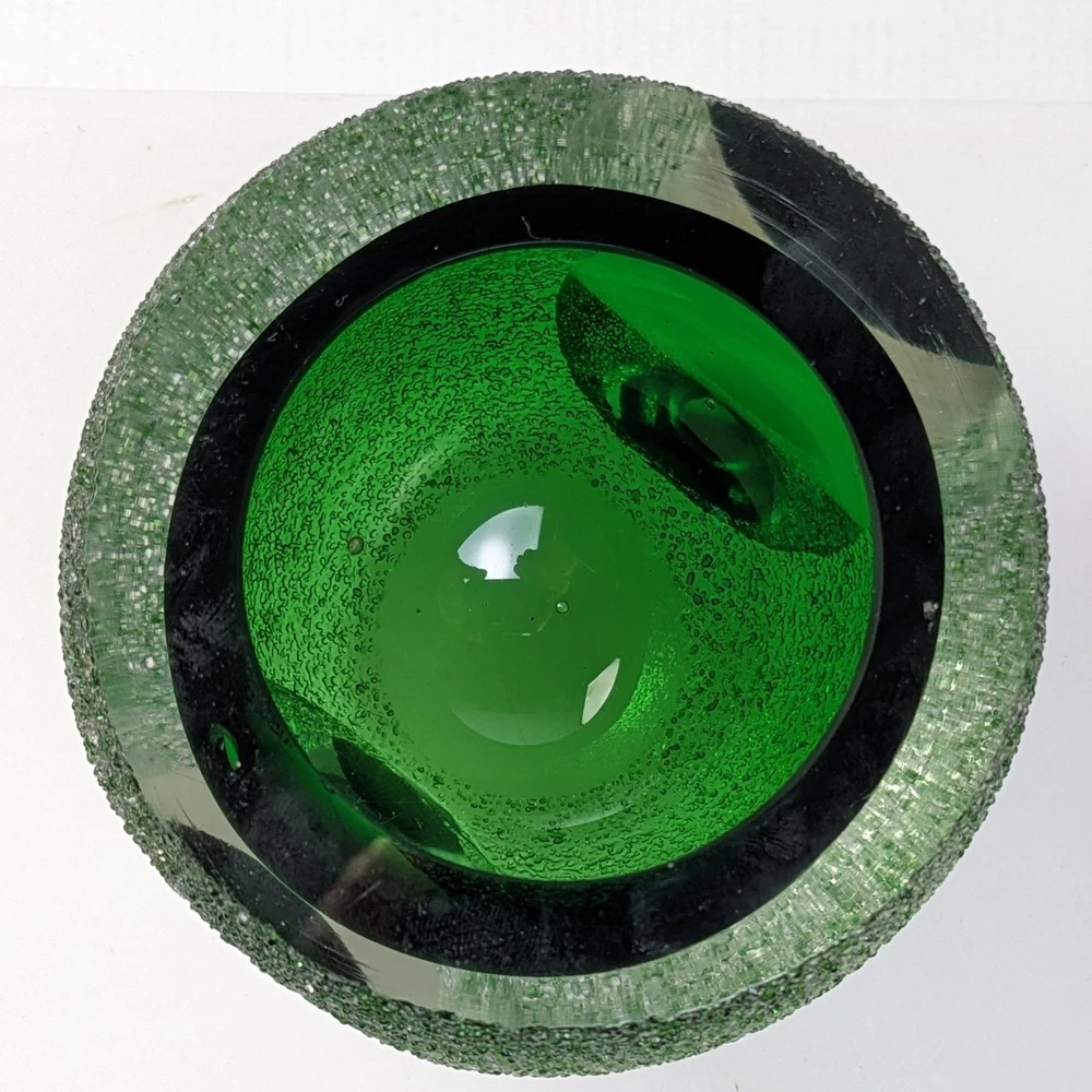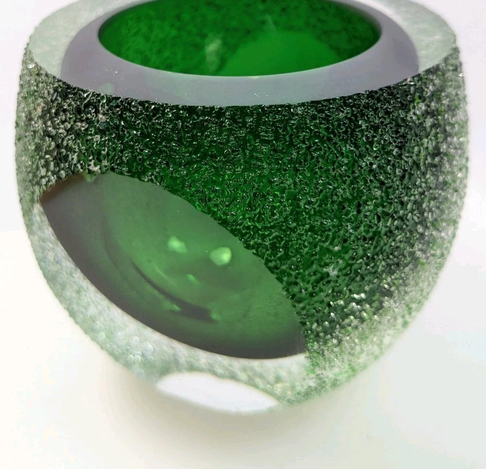 This stunning vintage votive candle holder was distributed by Fifth Avenue Crystal, dating back to the 1970s. This exquisite piece features a unique "geode" design, showcasing a vibrant green interior encased in clear glass with a thick sugared or frosted texture. The holder is elegantly crafted with sliced windows on two sides, allowing the enchanting green hue to radiate beautifully when illuminated. Specifications: Width: Approximately 4 inches Height: Approximately 3 3/8 inches Elevate your home decor with this timeless candle holder that combines vintage charm with modern elegance, perfect for adding a touch of sophistication to any space. Pre-owned item, used condition showing signs of wear and use. No chips, cracks, or repairs. Missing brand label. All images provided accurately represent the item(s) you will receive and should be regarded as an integral part of the description. We encourage you to carefully review each image. If you have any questions or need further details about this listing, please feel free to reach out to us.