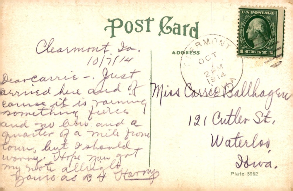 View of Fifth St. Bridge in Waterloo, Iowa, taken from the east side of the river looking west. Postmarked from Clearmont, Jo. on October 7, 1914, with a handwritten message to Carrie.
