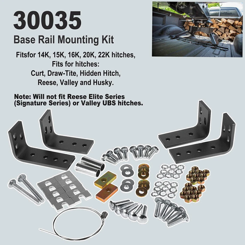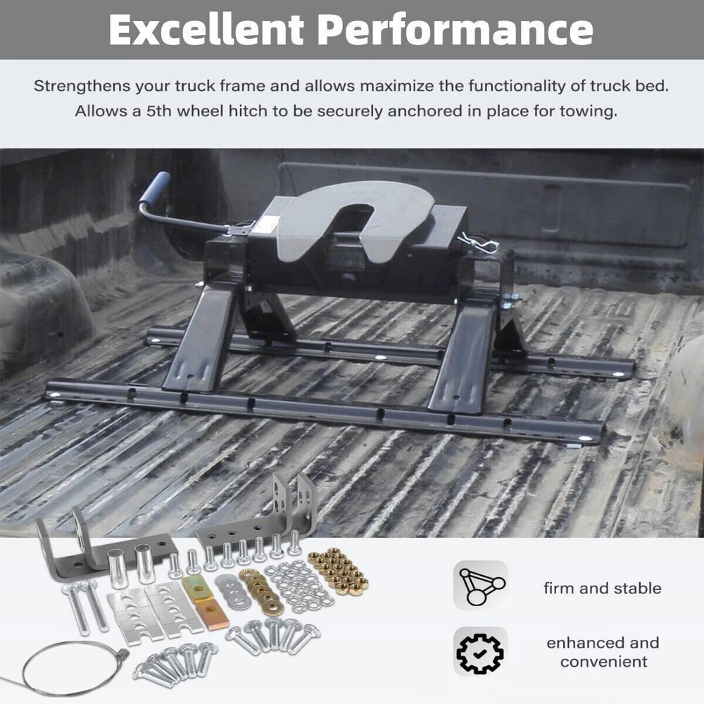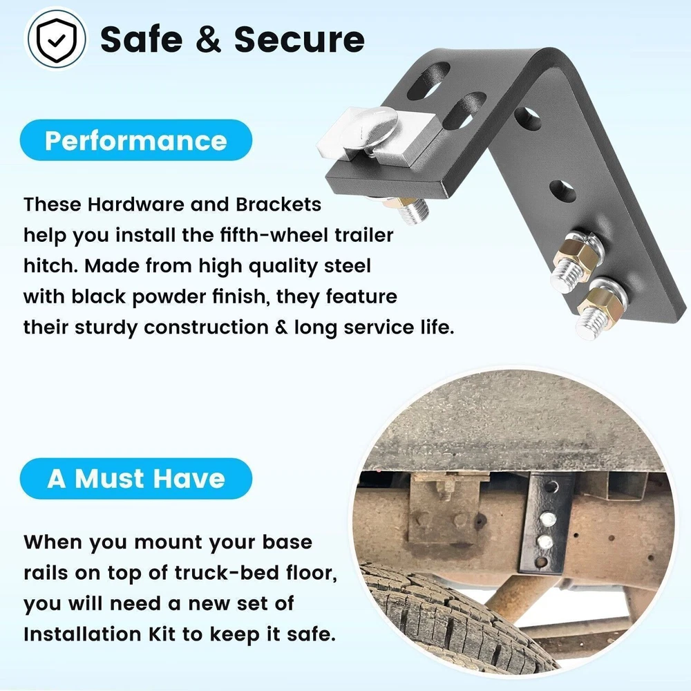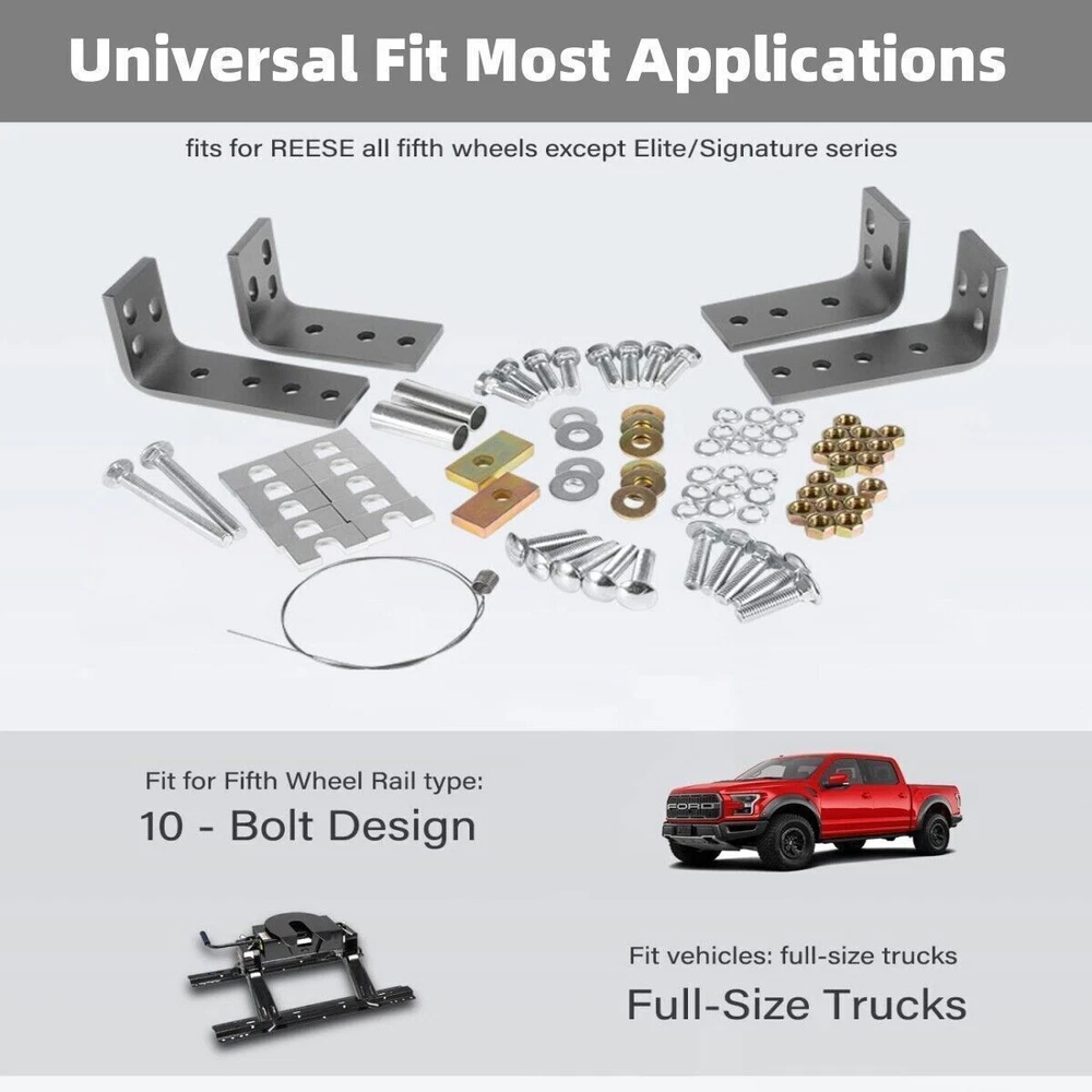 Fifth Wheel Rails Hitch Installation Kit for Reinstallation Truck 30035 58058 COMPATIBILITY: Installation kit fits for full-size trucks, compatible with 14K, 15K, 16K, 20K, 22K hitches, compatible with 5th wheels except Elite series. SUPERIOR QUALITY: Machined from superior steel material with black powder coating, it features its durable construction, anti-corrosion, high performance and long service life. APPLICATION: This kit includes all brackets and hardware necessary to install fifth wheel rails into the bed of your truck. Drilling will be required to install rails. ( Note: Rails are not included.) PACKAGE CONTENT: The kit includes four brackets, two larger ones with more mounting options and two smaller ones, and it's going to include all the hardware that you need. SATISFACTION GUARANTEE: If you're not 100% satisfied with Installation Kit, simply return it for a replacement or a full refund in 60 days. Premium Support & 12-Month Warranty Package included: four brackets, two larger ones with more mounting options and two smaller ones Payment Shipping Return & Warranty Leave feedback Contact us Payment 1.We accept PayPal payment and many other payments. Items will be shipped within 1 business day of receiving full payment. Shipping 1.All items will be shipped out in 1 business day,no expedited service available. 2.Our items will be delivered within 4-6 business days. 3.We have multiple warehouses in US, and will choose the nearest one for shipping, according to your address and our inventory Return & Warranty 1. 60 Days Free Returns, please notify us within 60 days after you've received your purchased item. 2. All return requests must be submitted through your eBay account. 3. Return shipping shall be the responsibility of the buyer. We pay the shipping when it is our fault. 4. Items to be returned must be in resalable condition. 5. All returns are for refund ONLY. No exchange accepted. Leave feedback 1.If you are not satisfied for any reasons, please do not be so quick to leave negative/neutral feedback. We work hard to make sure EVERY CUSTOMER 100% SATISFIED and resolve any problems for you and always leave positive feedback to all our customers. 2.If you are satisfied with the product you received, please kindly leave us a positive feedback and 5 scores DSR. Thanks! Contact us 1.Any Questions,Just feel free to contact us on eBay.We will reply you in 1-2 business day.
