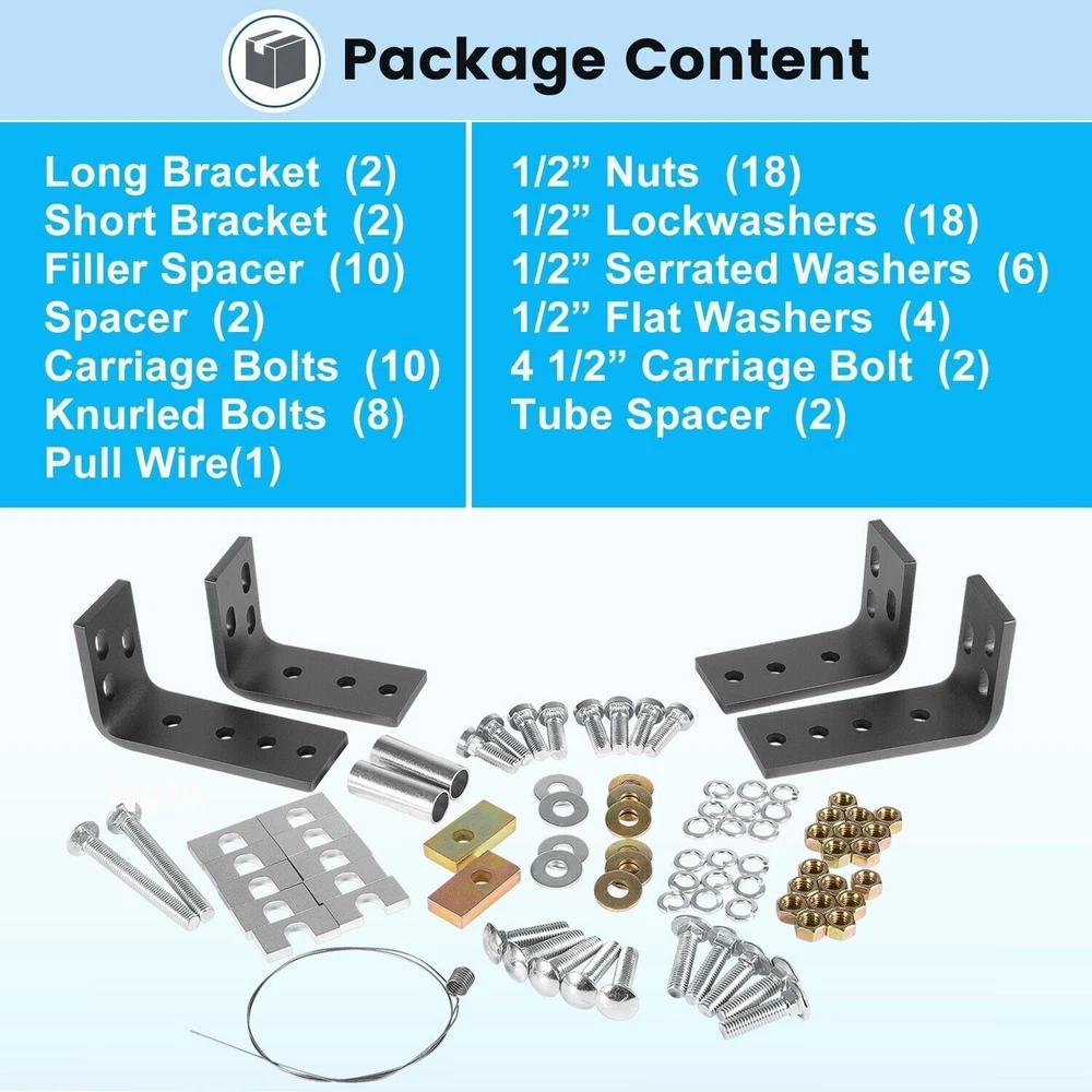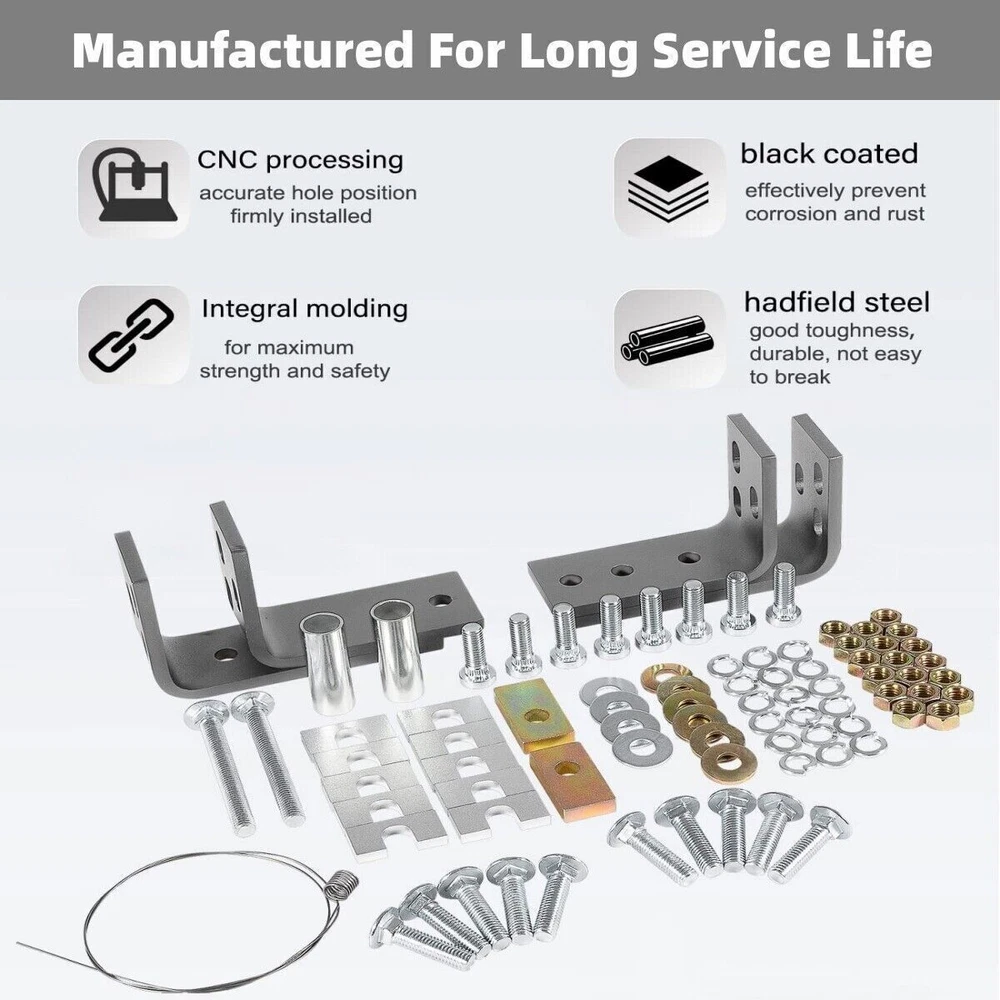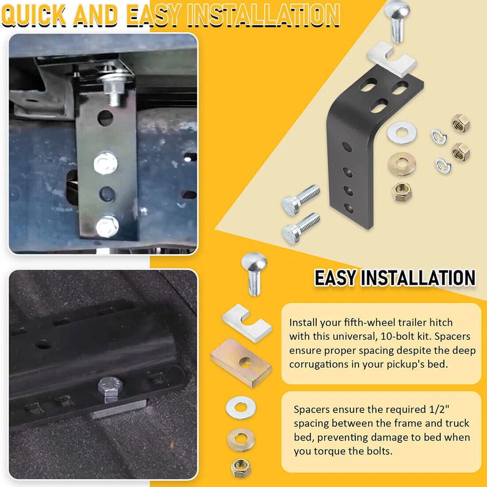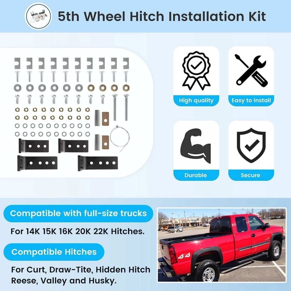 Fifth Wheel Rails Hitch Installation Kit for Reinstallation Truck 30035 58058 COMPATIBILITY: Installation kit fits for full-size trucks, compatible with 14K, 15K, 16K, 20K, 22K hitches, compatible with 5th wheels except Elite series. SUPERIOR QUALITY: Machined from superior steel material with black powder coating, it features its durable construction, anti-corrosion, high performance and long service life. APPLICATION: This kit includes all brackets and hardware necessary to install fifth wheel rails into the bed of your truck. Drilling will be required to install rails. ( Note: Rails are not included.) PACKAGE CONTENT: The kit includes four brackets, two larger ones with more mounting options and two smaller ones, and it's going to include all the hardware that you need. SATISFACTION GUARANTEE: If you're not 100% satisfied with Installation Kit, simply return it for a replacement or a full refund in 60 days. Premium Support & 12-Month Warranty Package included: four brackets, two larger ones with more mounting options and two smaller ones Payment Shipping Return & Warranty Leave feedback Contact us Payment 1.We accept PayPal payment and many other payments. Items will be shipped within 1 business day of receiving full payment. Shipping 1.All items will be shipped out in 1 business day,no expedited service available. 2.Our items will be delivered within 4-6 business days. 3.We have multiple warehouses in US, and will choose the nearest one for shipping, according to your address and our inventory Return & Warranty 1. 60 Days Free Returns, please notify us within 60 days after you've received your purchased item. 2. All return requests must be submitted through your eBay account. 3. Return shipping shall be the responsibility of the buyer. We pay the shipping when it is our fault. 4. Items to be returned must be in resalable condition. 5. All returns are for refund ONLY. No exchange accepted. Leave feedback 1.If you are not satisfied for any reasons, please do not be so quick to leave negative/neutral feedback. We work hard to make sure EVERY CUSTOMER 100% SATISFIED and resolve any problems for you and always leave positive feedback to all our customers. 2.If you are satisfied with the product you received, please kindly leave us a positive feedback and 5 scores DSR. Thanks! Contact us 1.Any Questions,Just feel free to contact us on eBay.We will reply you in 1-2 business day.