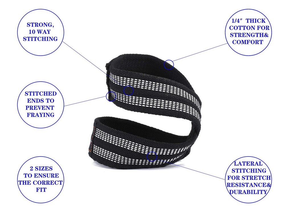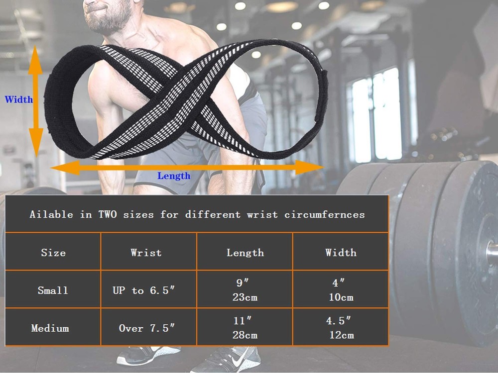 Quick Setup & Easy Use The Figure 8 design is much quicker to get set up than the traditional style lifting straps – no more worrying about wrapping the strap around the bar multiple times, then having to wind the tension up. Just slip one hand through one half of the strap, pass the other end under the bar, then pass your hand through the other half. Now LIFT. SIZING: Measure around your wrist. Small: Wrist Measurement Less Than 6.5" Medium: Wrist Measurement Between 7.5" and 11" How Our Figure 8 Straps Work Durable, Strong For Functional Support Premium fitness gear at a cost that doesn't break your bank. These long reinforced figure 8 straps are manufactured for deadlifts and strongman training in mind.Our R & D process leaves no stone unturned in how we approach the appearance, stitching, construction, and assembly of our figure 8 straps for weight lifting. Take advantage of your next workout with straps. 【STRONG AND STURDY】High quality custom made material, with heavy duty stitching, means these figure 8 straps will last. 【IDEAL FOR ALL TYPES OF LIFTING EXERCISES】Whether you’re performing lifts, shrugs, or other repetitive lifting movements, our home gym equipment wrist straps are the perfect workout tools. They secure your grip and enable you to focus on proper execution. 【ERGONOMIC & COMFORTABLE】The thick, strong, heavy duty cotton material means no need for extra padding material such as neoprene to get in the way and deteriorate. These grip strength trainer lifting straps also keep your hand in direct with the bar, improving the feel of the lift. 【TWO SIZE OPTIONS】Now available in TWO sizes: Small (up to 6.5" wrists), Medium (over 7.5") .The right size of the lifting wrist wraps is crucial for a comfortable and effective grip during weightlifting and strength training. So accurate measurement is essential to make the best choice for your specific needs 【ESSENTIAL GYM ACCESORY】Unlike traditional deadlift straps, these figure 8 wrist straps give you total confidence that they will never slip loose or come un-done. The reinforced seams ensure that the gym wrist wraps for women and men will consistently perform their intended function, providing you with the peace of mind that the lifting wrist wrap won't fail you during a lift.