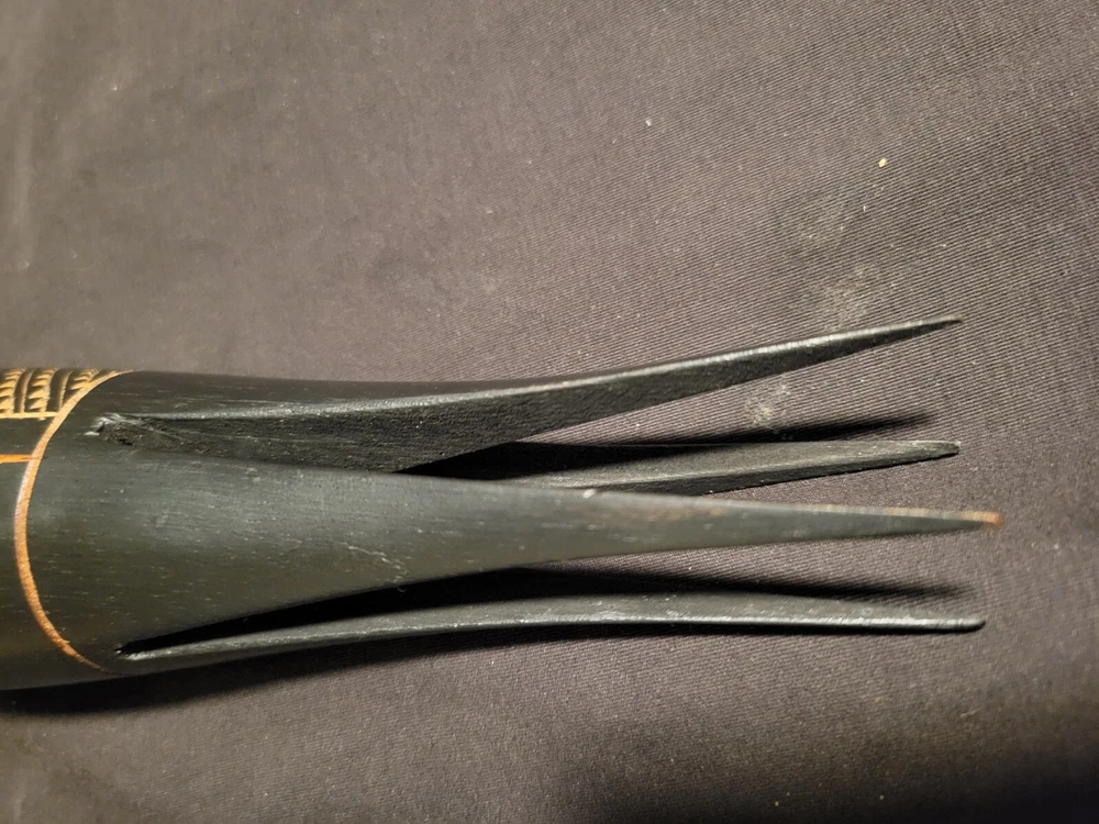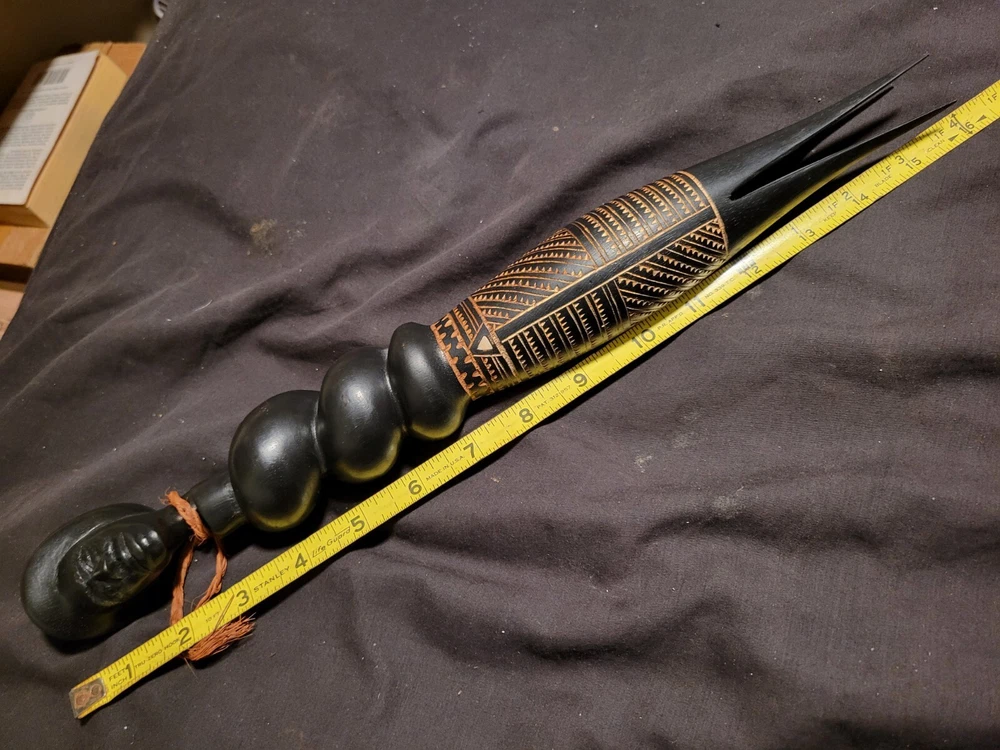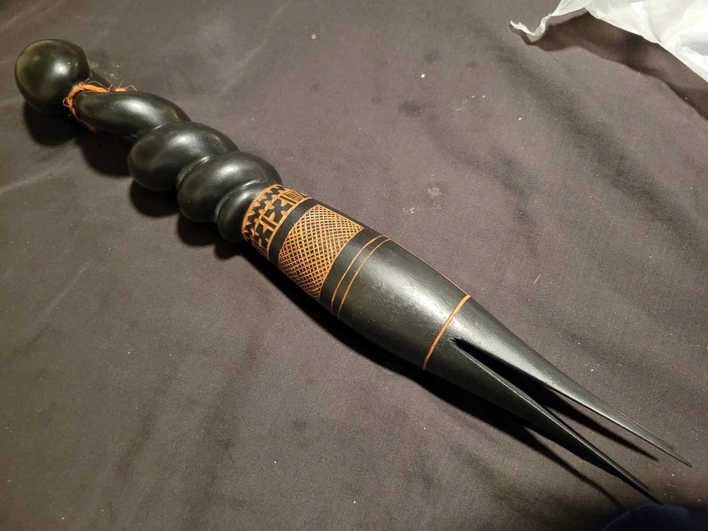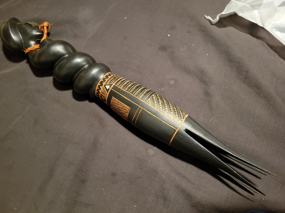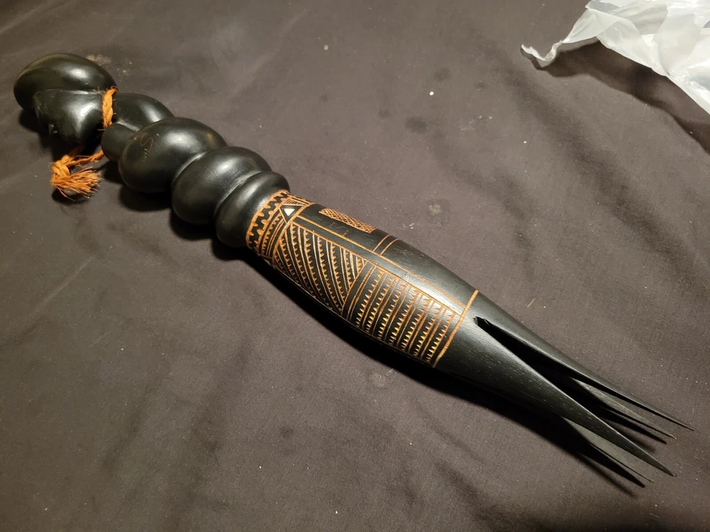 As i was getting ready to leave my room one day i sat down on the end of my bed to put on my shoes and saw the shadow of this object in the floor in front of me. The object is on a shelf againt a wall with no lighting anywhere near it. Just saying... This Fiji Fijian Cannibal Fork is a unique and heavy carved wood collectible. Made in Fiji, this piece represents the Pacific Island culture and is a must-have for collectors. The intricate details and heavy carving make this fork a true work of art. Perfect for those interested in Pacific Island culture, this Fiji Fijian Cannibal Fork is a great addition to any collection. The fork's authenticity and unique design make it a great conversation starter. Add this piece to your collection today and experience the beauty and history of Fiji.
