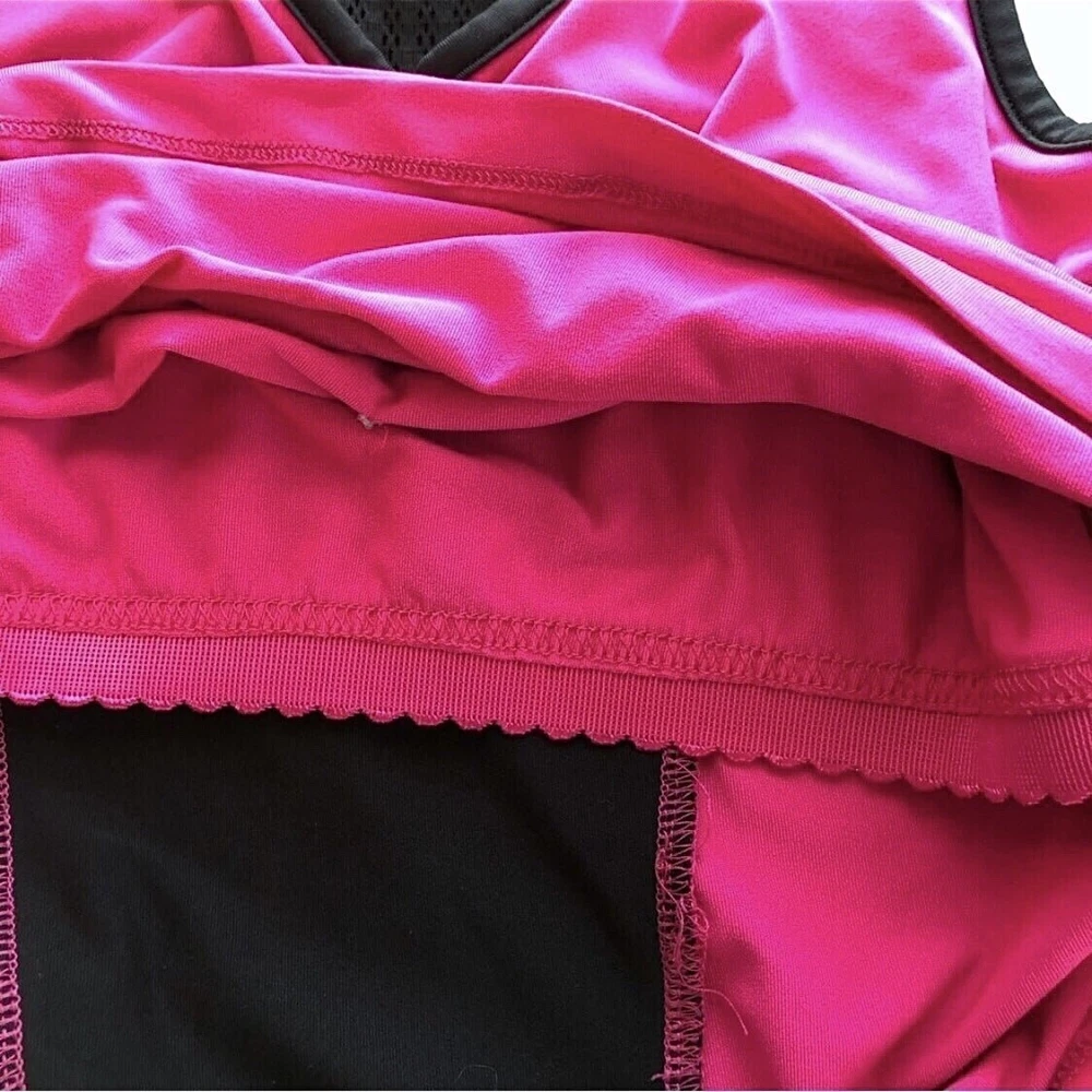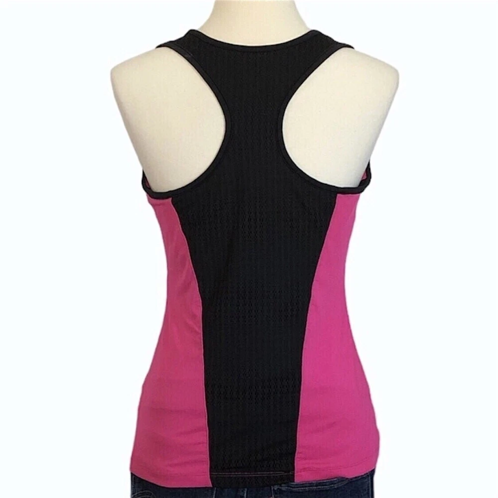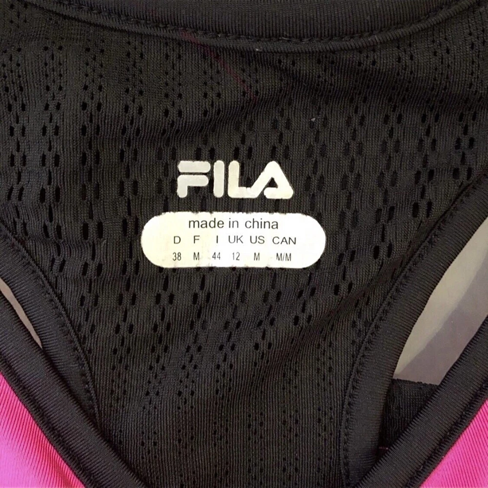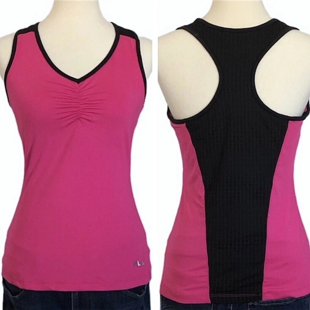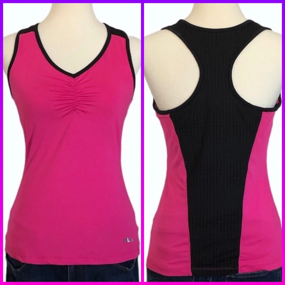 Fila Bright Pink and Black Racerback Workout Top •Size Medium •Pre-owned condition •Hidden shelf bra (shown in photo) •Fabric synching across breast area •Item is well worn, but still very functional •Price reflects condition ••Approximate Measurements: * Length Approx. 23 inches * Pit to Pit Approx. 16 inches 💜 🐈 Cat friendly home 🚫 Smoke Free home