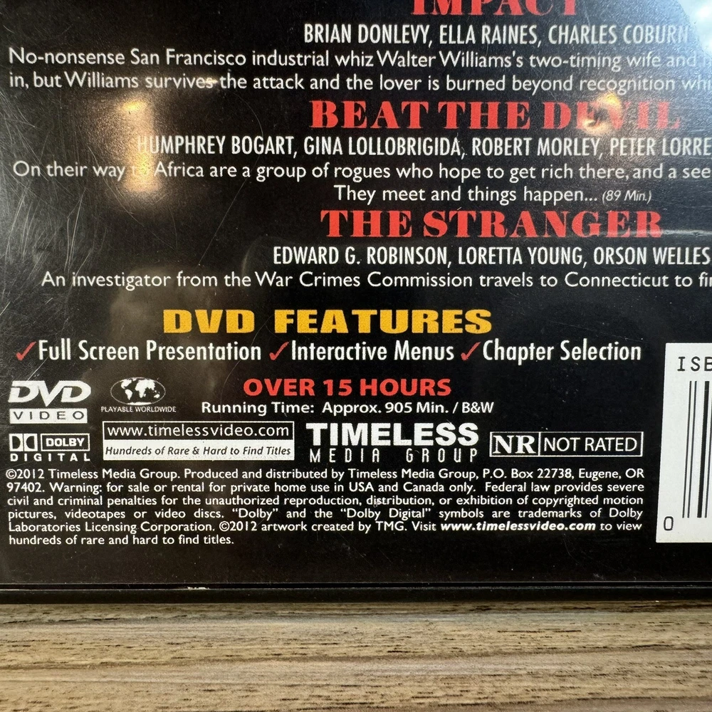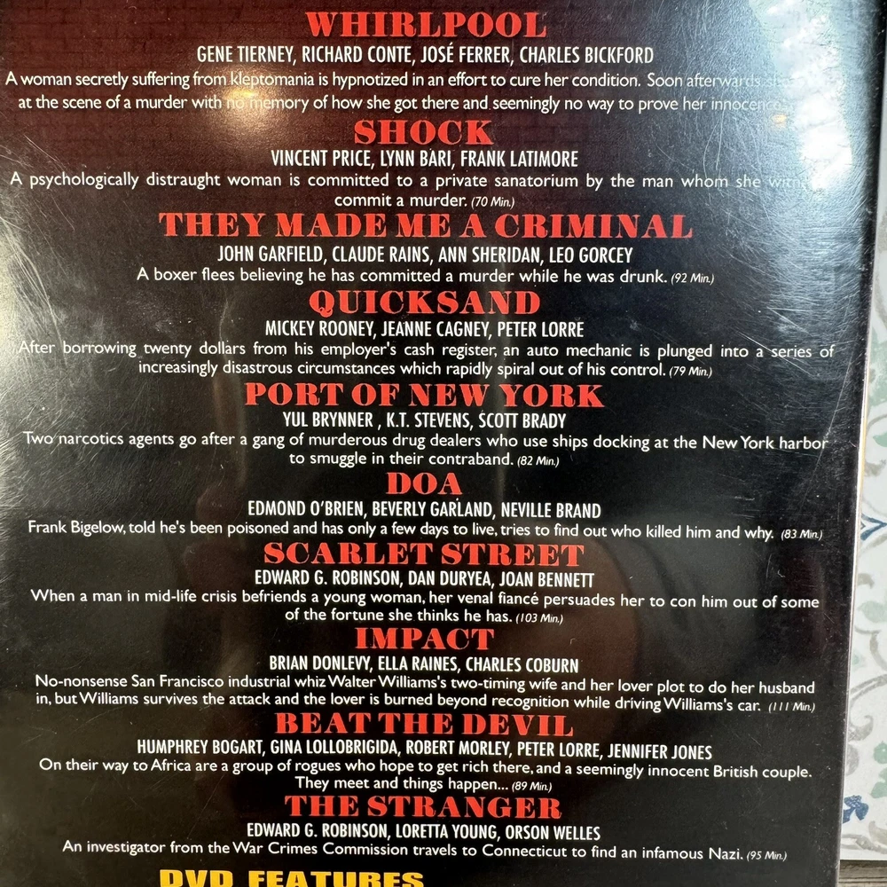 This DVD collection features ten classic films that are sure to captivate any movie lover. With a mix of tall/DVD cases, the collection includes films featuring renowned actors such as Edward G. Robinson, Gene Tierney, John Garfield, Humphrey Bogart, and Orson Welles. The cinematic movement is film noir, with a rating of NR and a sub-genre of mystery/suspense. The DVD format is compatible with all regions, making it perfect for worldwide viewing. The language is English, and the director is Fritz Lang. This Timeless Media studio collection is a must-have for any film enthusiast. ---------------- Smoke-free home. Items stored in cool, dry space. Shipping We will ship your item within two business days of purchase. Combined Shipping is available and partial shipping amounts paid will be refunded when ordering more than one item within the same hour. Photos Please see photos for best description of the item’s condition. All photos are of the actual item listed for sale, unless otherwise noted. We do our best to provide proper photos and descriptions of the items to insure there are no surprises once received. Thank you for shopping Declutteringo!