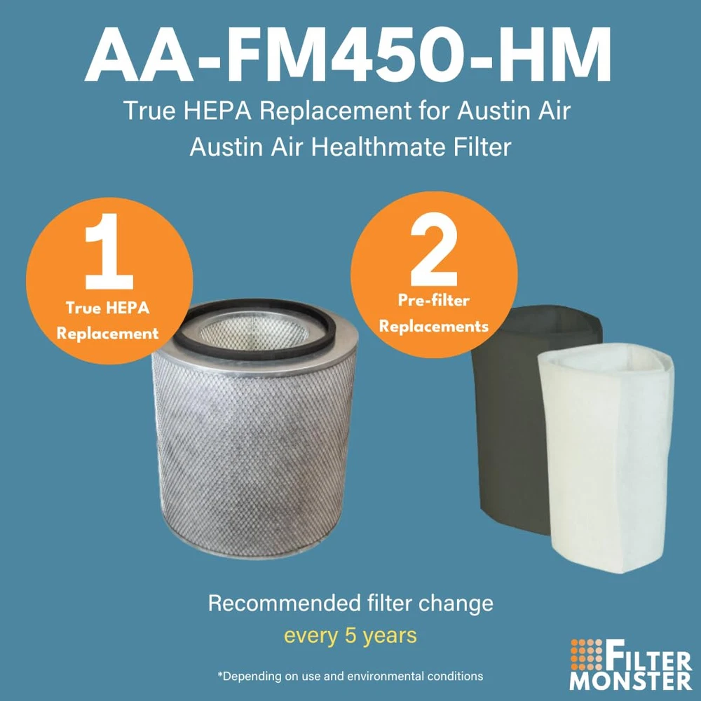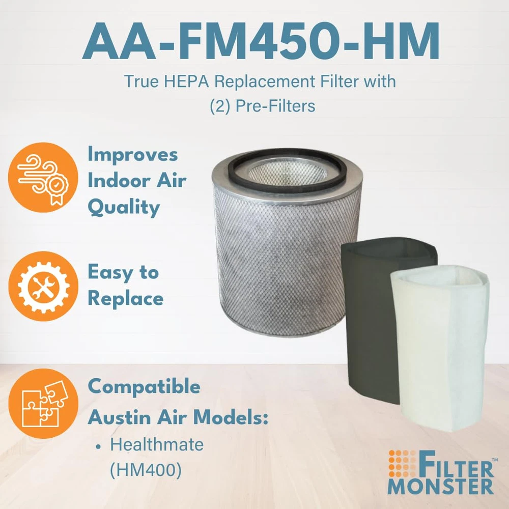 Compatibility: Replacement filter kit is compatible with Austin Air Healthmate FR400 Air Purifier filter. Fits Austin Air air purifier models HM400, HM402, HM405, HM410, HM450. Air Quality Improvement: True HEPA filtration is rated H13 and removes up to 99.97% of airborne particles as small as 0.3 microns in size including dust, smoke, pollen, pet hair and dander, and more. Filtration Levels: Carbon pre-filter reduces common odors as well as gases, chemicals and VOCs (Volatile Organic Compounds) from cooking, cleaning and smoking. Particle pre-filter captures larger particles first, extending life of HEPA filter.