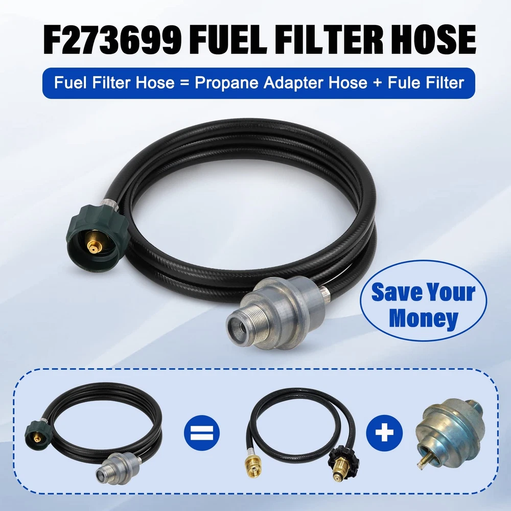 More Convenient: The Universal Fuel Filter with Hose is for the Portable, Big, and Tough Buddy Heaters in use with a bulk propane cylinder. No need for additional propane adapter hose. Convenient and save your money. For Use With: Fuel Filter F273699 Filtering Propane Servicing a Source, For Mr heater Buddy and Big Buddy 6351206, 6351207, 6351200, F273701, F273702, F232000, F274800, F23203 6FT Propane Adapter Hose:The hose with a QCC1/Type1 adapter, can connect directly to 20-45 lb propane tanks and ensure air tightness. and ensure air tightness. Allows you to use portable heaters more conveniently, quickly and safely. Professional Quality: Our products use high-quality raw materials. the filter is made of high quality steel. The tube adopts a three-layer structure, the outer layer is rubber, the galvanized steel support, and the inner layer is PVC. The joint is made of Solid brass. The product has passed the CSA professional certification, which is safe and durable. 1 Year : We provide 100% Satisfaction . If you have any problem after receiving this item, please don't hesitate to us, we resolve all issues in 24 hours.