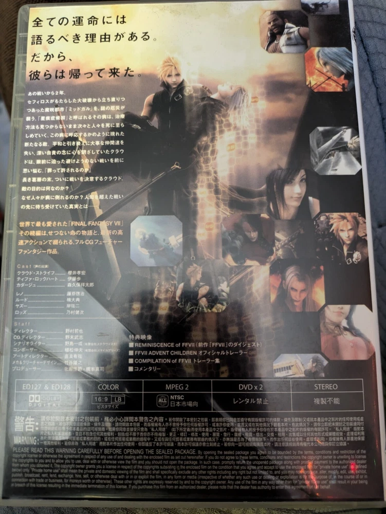 This DVD features the beloved Final Fantasy VII characters in a thrilling adventure. The story is captivating and the animation is top-notch, making this a must-have for any fan of the series. The DVD format ensures that you can enjoy this movie on any compatible player. The movie/TV title is "Final Fantasy VII: Advent Children" and it falls under the categories of DVDs & Blu-ray Discs and Movies & TV. This import DVD is a great addition to any collection and is sure to provide hours of entertainment.