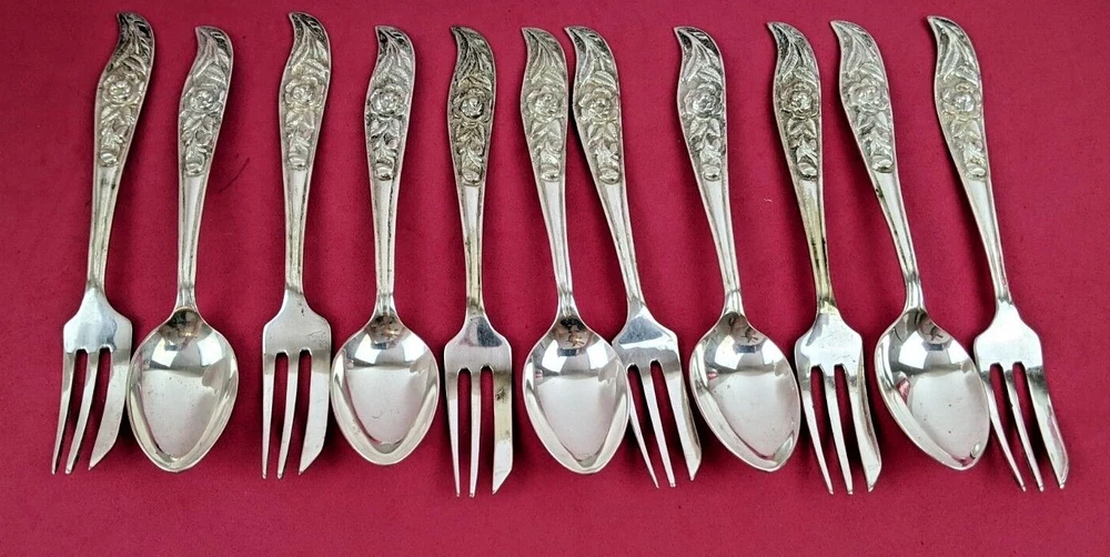 An antique Silver Dessert Set that I believe was purchased in France or Germany in the 1940s. All of the handles have a deep carved Rose pattern. There are 6 Pastry or Pie Forks that are 5 3/4" in length and 5 Coffee Spoons that are 5 5/8" in length. There are no markings or hallmarks that I can find. They are heavy quality piec es in very good well preserved condition.