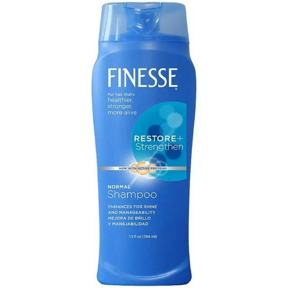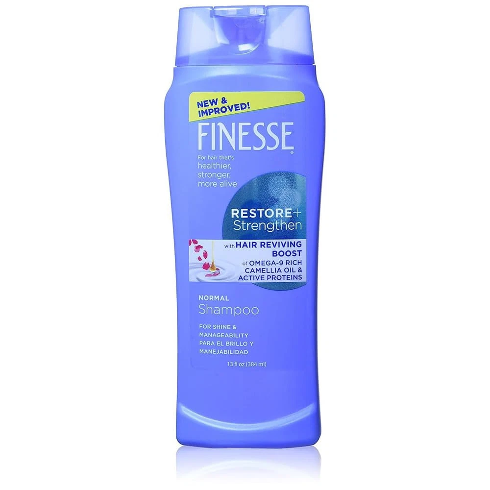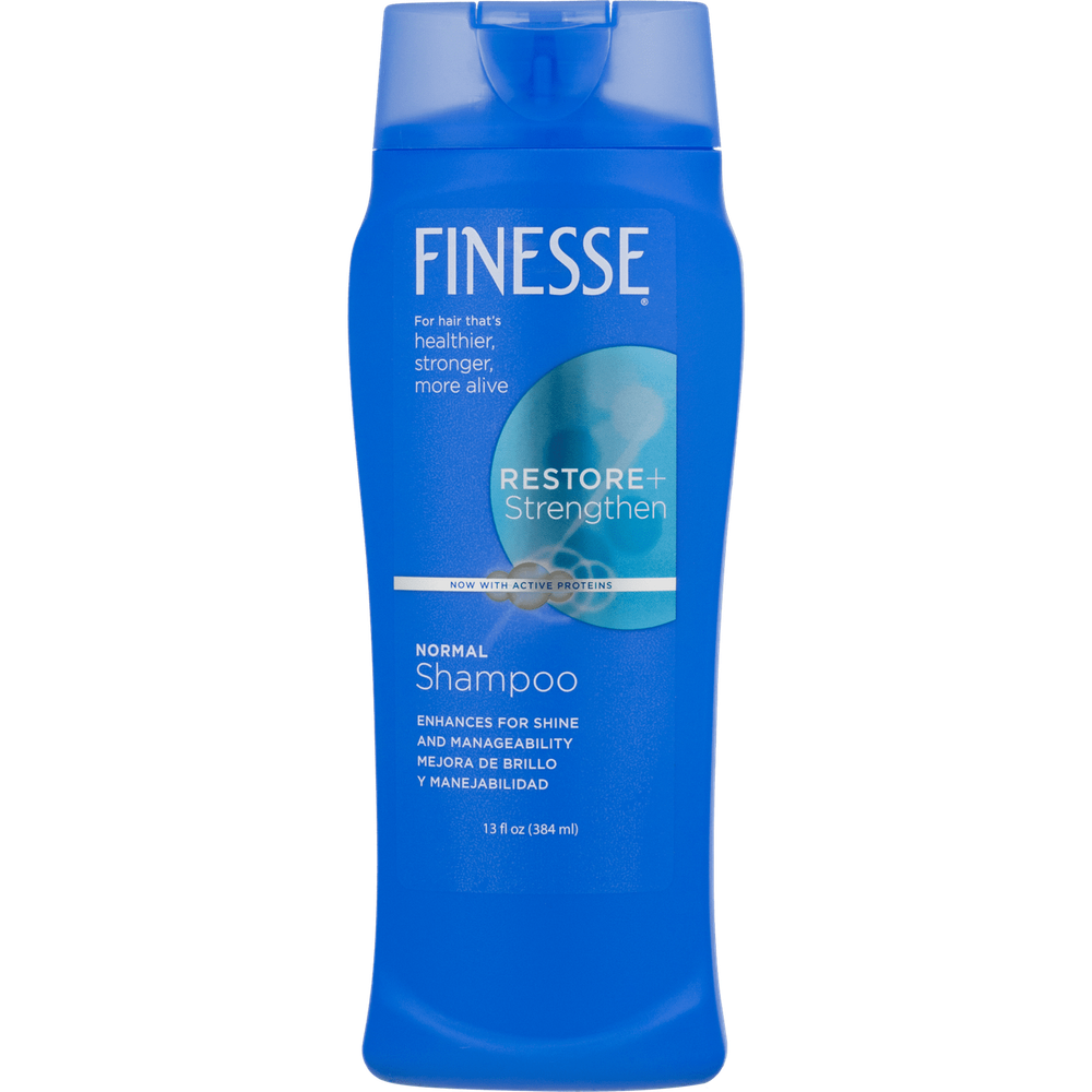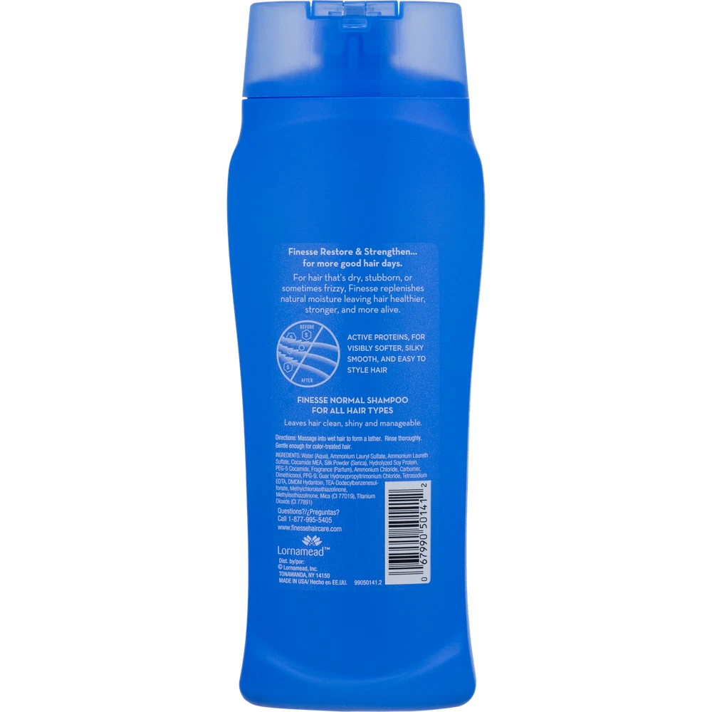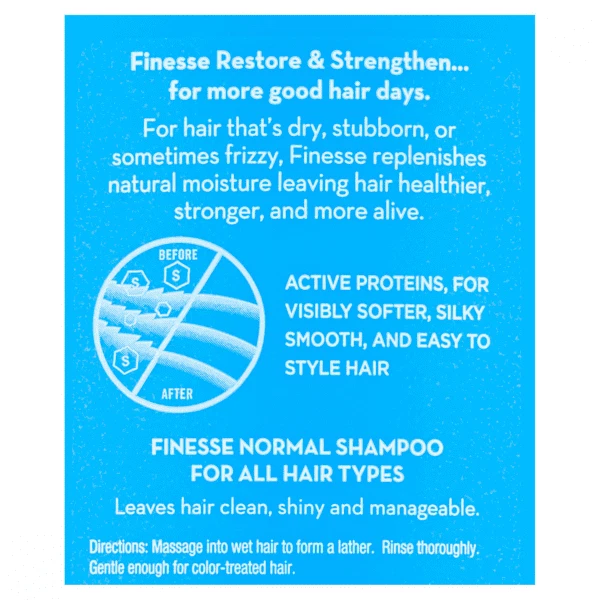 Finesse Self Adjusting Texture Enhancing Shampoo, Restore & Strengthen, Active Proteins, Unisex 13 Ounce (Pack Of 1) Finesse's unique self adjusting formula contains silk and soy proteins that protect the hair shaft with a coat of conditioning and shine. So, no matter how your hair is, the result is consistently beautiful hair. Get hair that’s healthier, stronger, and more alive with Finesse. Finesse Restore + Strengthen Normal Shampoo leaves hair clean, softer, and with an enhanced shine. This shampoo delivers more manageable hair that's easier to brush, comb and style. About this item ENHANCE SHINE AND MANAGEABILITY: Finesse Restore + Strengthen Normal Shampoo leaves your hair clean and looking shinier, softer, and silkier. This shampoo delivers more manageable hair that's easier to brush, comb and style. NOW WITH A HAIR REVIVING BOOST OF HYALURONIC ACID, CAMELLIA OIL & KERATIN: Revives hair with a beauty boost of ultra hydrating Hyaluronic Acid, Camellia Oil plus Keratin, the building block of hair. FOR HAIR THAT'S HEALTHIER, STRONGER, MORE ALIVE: Effectively revitalizes dry hair, damaged hair, dull hair, difficult hair or frizzy hair. Finesse products help transform hair so it looks and feels more alive. FINESSE HAIR CARE FOR WOMEN & MEN: Do you want healthy hair, silky hair, moisturized hair, or soft hair? Finesse products will help you improve the look and feel of your hair, while leaving it smelling fresh and clean with our signature fresh scent. Ingredients Water (Aqua); Ammonium Lauryl Sulfate; Ammonium Laureth Sulfate; Cocamide MEA; Silk Powder (Serica); Hydrolyzed Soy Protein; PEG-5 Cocamide; Fragrance; Ammonium Chloride; Carbomer; Dimethiconol; PPG-9; Guar Hydroxypropyltrimonium Chloride; Tetrasodium EDTA; DMDM Hydantoin; TEA-Dodecylbenzenesulfonate; Methylchloroisothiazolinone; Methylisothiazolinone; Mica (Cl 77019); Titanium Dioxide (Cl 77891)
