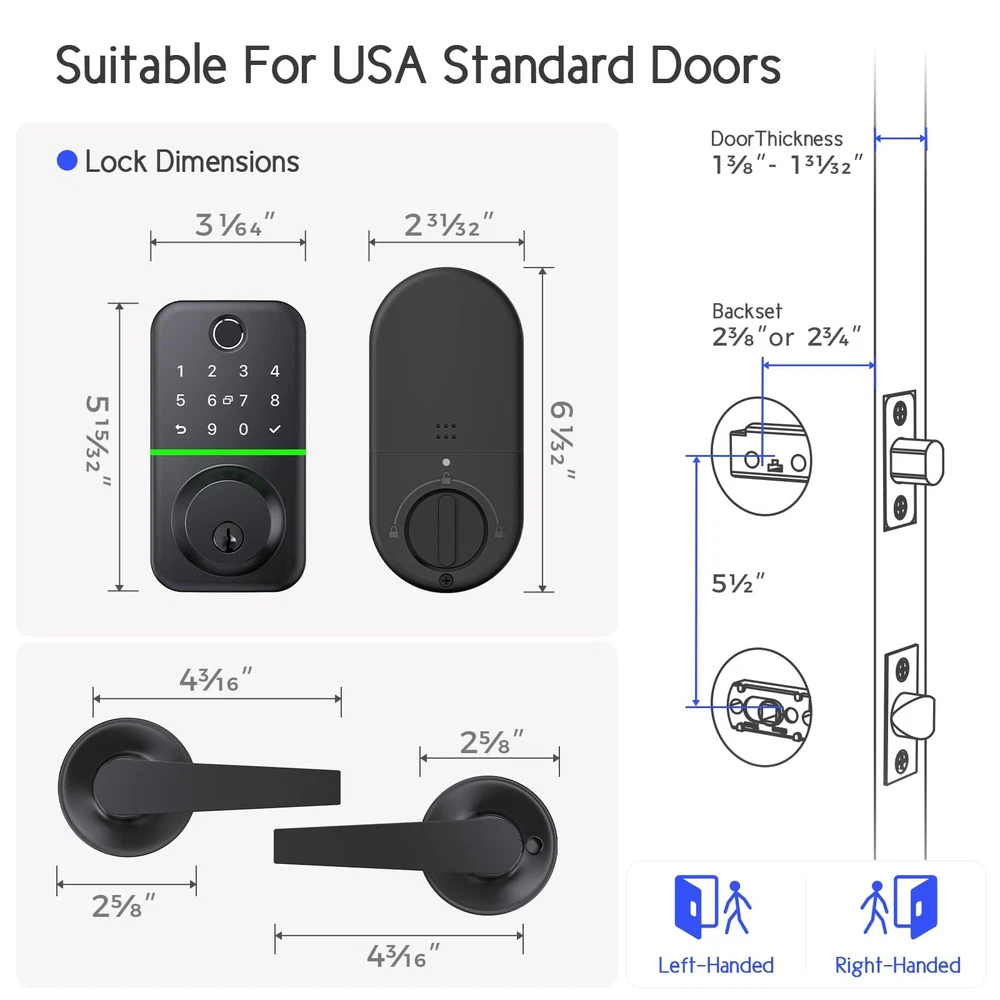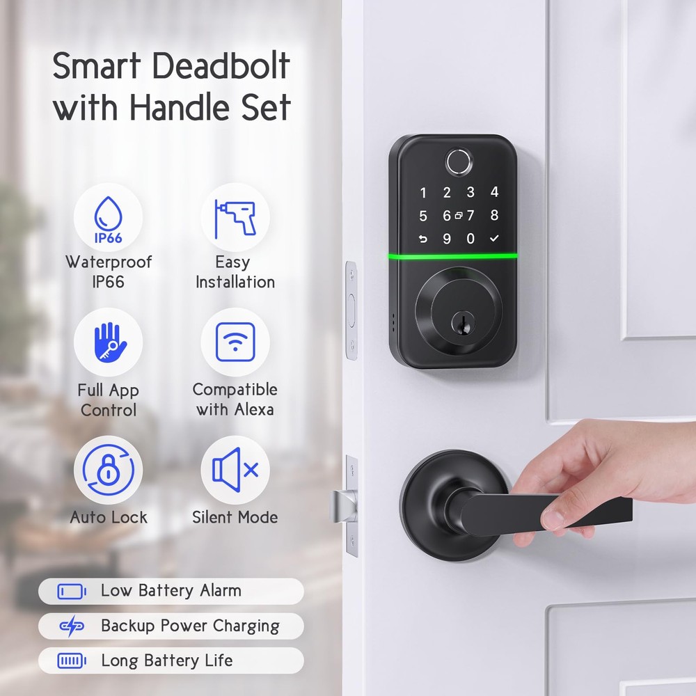 Wise-Gear Fingerprint Door Lock with Deadbolt and Handle set for Front Door Features: 1. App and Web control: Available to use both mobile APP and Web to control the smart door lock. The keypad deadbolt is a really good choice for management of personal house property, Airbnb, rental apartment, ect. 2. Keyless deadbolt smart door lock with handle: The product contains two parts, one is the electronic deadbolt fingerprint lock, another is the door handle. 3. Front Door Lock Set Keyless Entry: The keyless entry door lock deadbolt with handle set provides you multiple access ways to control: full APP control, fingerprint, passcode, key Fob, physical keys, Bluetooth, and Alexa voice control (Optionally, G2 Wifi Gateway required). Enjoy the convenience to use different methods to unlock the smart door lock. 4. Easily Installed in Few Minutes: Super easy to install the keypad deadbolt lock set in just few minutes. The smart deadbolt is designed to fit into American standard doors. No need to drill any extra holes on your existing doors. 5. Various Types of Pin Code: Different kinds of passwords are available for you to choose. You can generate one-time passcode for deliveryman, generate time-limited passcode for your guests, generate common passcode for your family, as well as generate week recurring cycle passcodes for cleaner. Manage the deadbolt lock as your wishes. 6. Anto Lock Function and One-touch Locking: Set auto lock mode in the mobile APP, then the fingerprint door lock will automatically lock after unlocking. No worries about forgetting to lock your digital door lock any more. Or just long press confirm button for three seconds to lock manually on the keypad. 7. Weather and Temperature Resistant: The waterproof rating of this smart door locks for front door is IP66. What's more, the exterior door lock set can withstand extreme temperatures (-22℉ to 158℉). A very excellent choice for your front door. 【Front Door Lock Set Keyless Entry】The keyless entry door lock deadbolt with handle set provides you multiple access ways to control: full APP control, fingerprint, passcode, key Fob, physical keys, Bluetooth, and Alexa voice control (Optionally, G2 Wifi Gateway required). Enjoy the convenience to use different methods to unlock the smart door lock. 【Easily Installed in Few Minutes】Super easy to install the keypad deadbolt lock set in just few minutes. The smart deadbolt is designed to fit into American standard doors. No need to drill any extra holes on your existing doors. 【Various Types of Pin Code】Different kinds of passwords are available for you to choose. You can generate one-time passcode for deliveryman, generate time-limited passcode for your guests, generate common passcode for your family, as well as generate week recurring cycle passcodes for cleaner. Manage the deadbolt lock as your wishes. 【Auto Lock Function and One-touch Locking】Set auto lock mode in the mobile APP, then the fingerprint door lock will automatically lock after unlocking. No worries about forgetting to lock your digital door lock any more. Or just long press confirm button for three seconds to lock manually on the keypad. 【Weather and Temperature Resistant】The waterproof rating of this smart door locks for front door is IP66. What's more, the exterior door lock set can withstand extreme temperatures (-22℉ to 158℉). A very excellent choice for your front door.