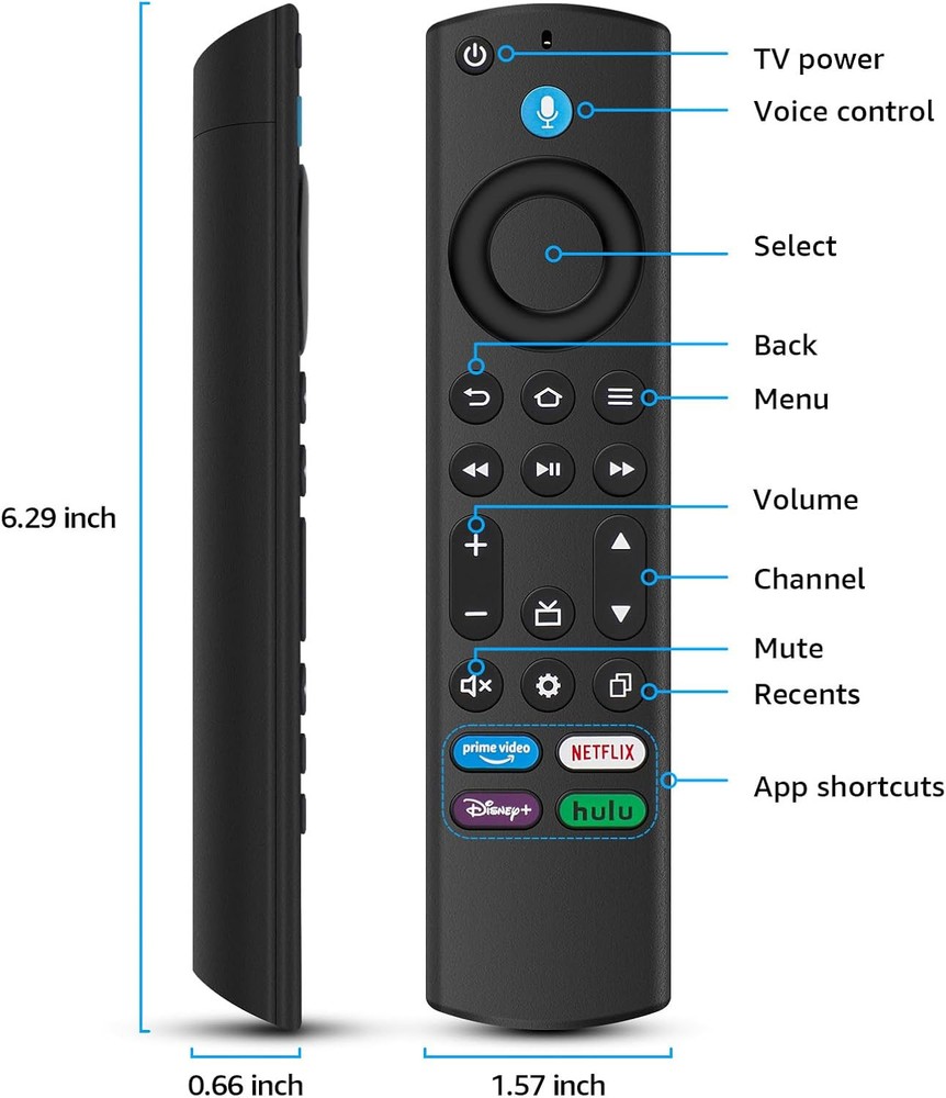 Replacement Remote Control Compatible with FireTV and Toshiba, Pioneer Black Product Details Package Dimensions: 6.34 x 1.69 x 0.94 inches Item Weight: 2.08 ounces Manufacturer: Gotellx Brand: Gotellx Special Feature: Voice Search, Please remember to follow the instructions to pairing and set up your remote before using it, or it may not work. Voice Search, Please remember to follow the instructions to pairing and set up your remote before using it, or it may not work.Voice Search, Please remember to follow the instructions to pairing and set up your remote before using it, or it may not work. See more Color: Black Max Number of Supported Devices: 1 Compatible Devices: ONLY compatible with FireTV Omni Series, FireTV Omni QLED Series, FireTV 4-Series, and FireTV 2-Series smart TVs and Toshiba, Pioneer or Insignia Smart TVs with Fire's Smart TV Built-in., Not compatible with fire stick. ONLY compatible with FireTV Omni Series, FireTV Omni QLED Series, FireTV 4-Series, and FireTV 2-Series smart TVs and Toshiba, Pioneer or Insignia Smart TVs with Fire's Smart TV Built-in., Not compatible with fire stick.ONLY compatible with FireTV Omni Series, FireTV Omni QLED Series, FireTV 4-Series, and FireTV 2-Series smart TVs and Toshiba, Pioneer or Insignia Smart TVs with Fire's Smart TV Built-in., Not compatible with fire stick. See more ONLY compatible with FireTV Omni Series, FireTV Omni QLED Series, FireTV 4-Series, and FireTV 2-Series smart TVs and Toshiba, Pioneer or Insignia Smart TVs with Fire's Smart TV Built-in. Can NOT for other streaming media devices or smart TVs. Get to your favorite content quickly and easily with preset app buttons. Subscriptions may be required. 【 Voice Control Function 】Use your voice to find your shows, open apps, manage volume just as your original remote control. Requires 2 AAA batteries, not included. Please remember to follow the instructions to pairing and set up your remote before using it, or it may not work.