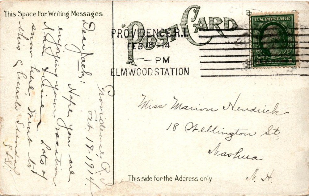 MAKE AN OFFER. THE MORE YOU BUY THE BETTER DEAL I WILL ACCEPT The postcard is a vintage one featuring the First Church of Christian Scientists in Providence, Rhode Island. The postmark on the postcard is from February 18, 1914. The recipient of the postcard is Miss Marion Nendrick of 18 Wellington St. in Nashua.