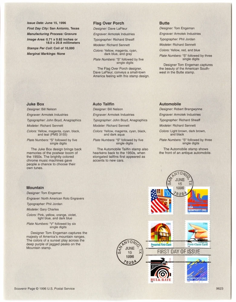 Official USPS 1996-23 Commemorative Cancellation Page FDC June 15, 1996, Scott #'s 2915B, 2902B, 2912A, 2910, 2906, & 2904 (top left to bottom right). The 2904, bottom right is a plate # coil single, #V333333. Shipping cost $3.00, USPS First Class. Ship this page with any other within 3 days for an additional $1.00