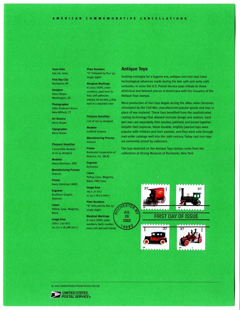 Official USPS 2002-20 Antique Toys Souvenir Commemorative Cancellation Page July 26, 2002, Scott #'s 3638-3641a. The 3640, position 4, bottom right, is a plate # coil single, #B12222. Shipping cost $3.00, USPS First Class. Ship this page with any other within 3 days for an additional $1.00